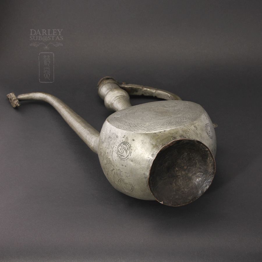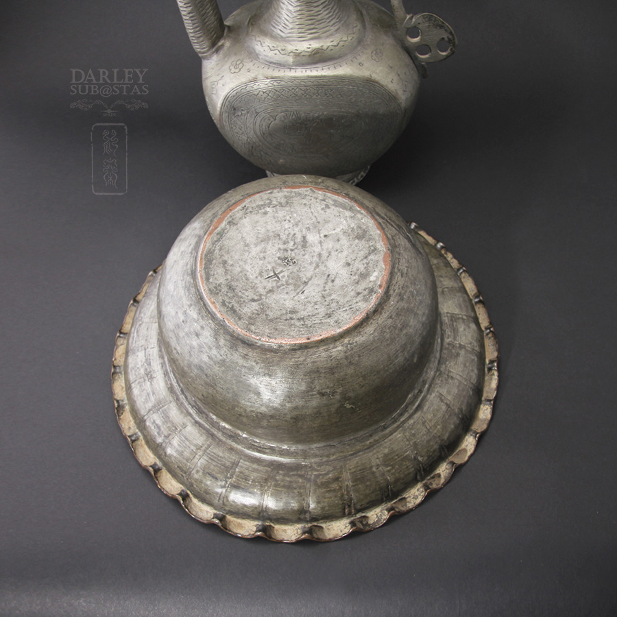 Beautiful and Old Persian ewer the Qajar Dynasty, the royal family of Iran, of Turkish origin, ruled Persia (Iran) from 1785 to 1925. This beautiful ewer probably copper plated zinc, is composed of three parts, the bottom tray is a round shaped flower petals, deep for accumulated water to wash hands, a small plate located at the mouth of the tray to settle the water jug, pitcher finally, high, with flattened sides, neck and handle with lid stretched cone terminated, the entire set is fully hand-chiseled with pretty pictures and details.