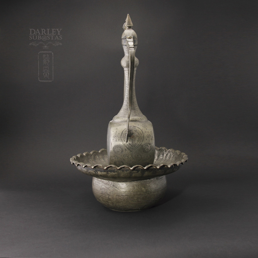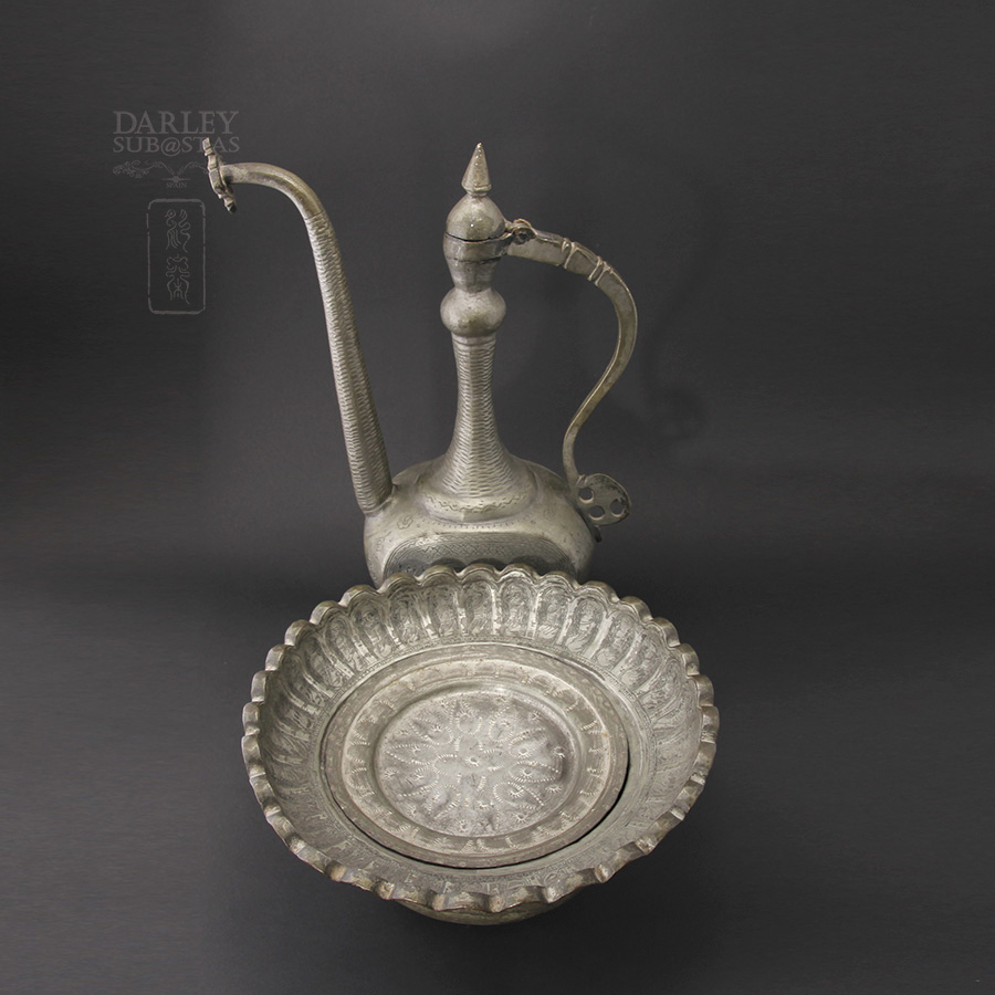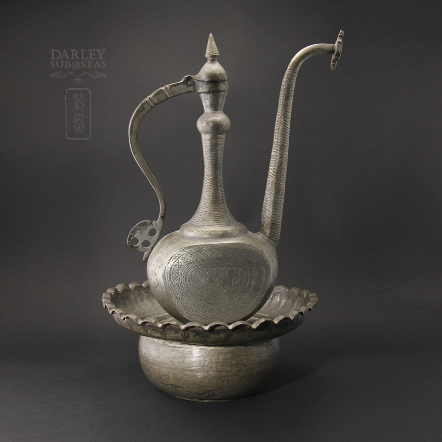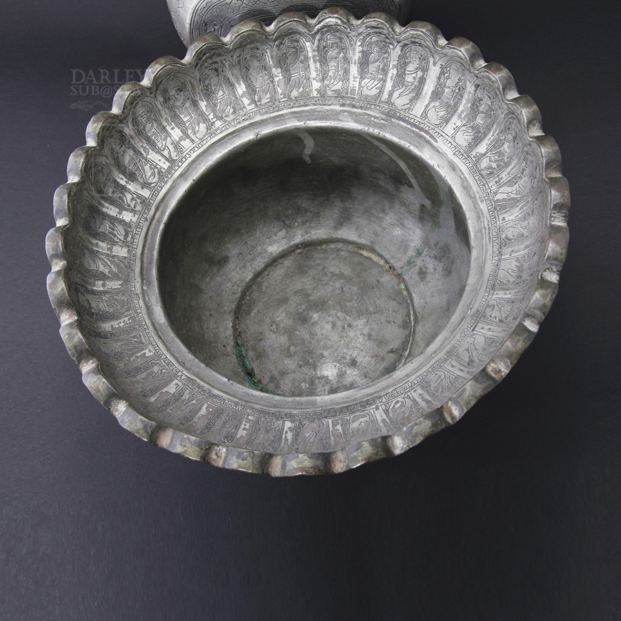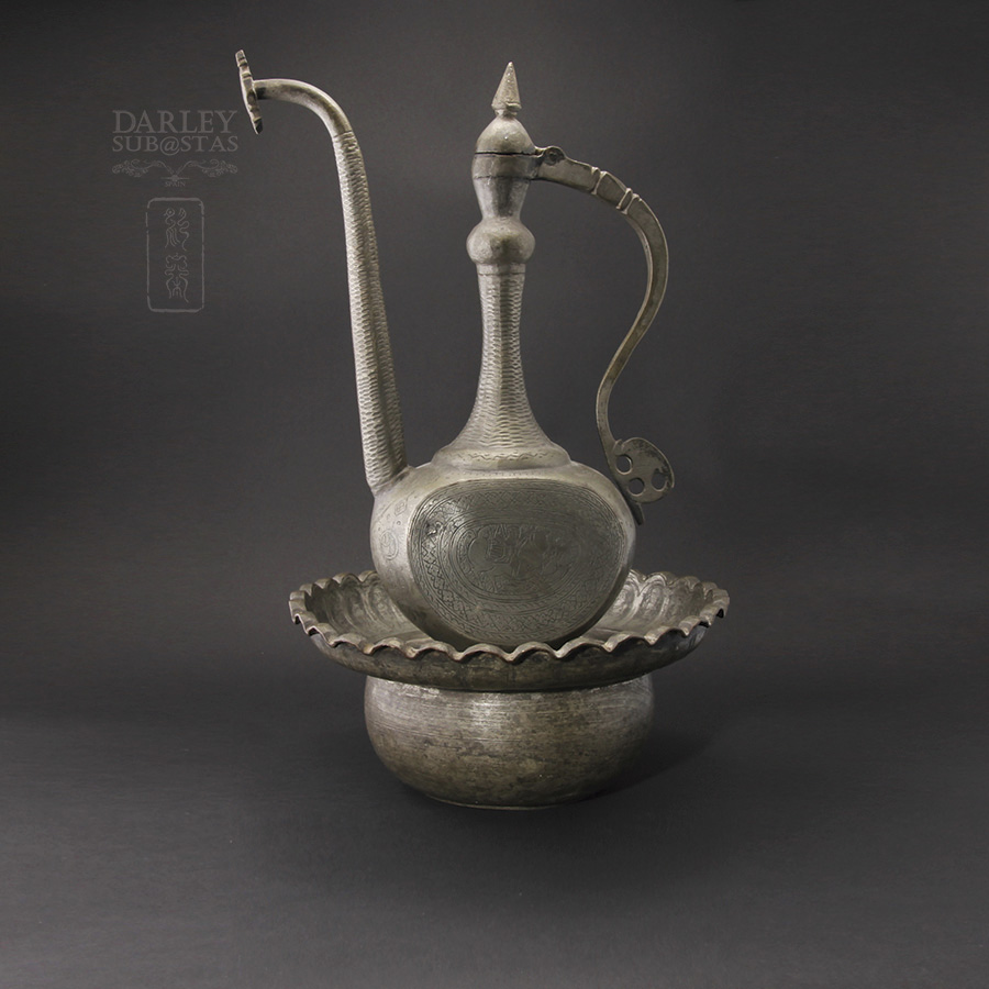 Beautiful and Old Persian ewer the Qajar Dynasty, the royal family of Iran, of Turkish origin, ruled Persia (Iran) from 1785 to 1925. This beautiful ewer probably copper plated zinc, is composed of three parts, the bottom tray is a round shaped flower petals, deep for accumulated water to wash hands, a small plate located at the mouth of the tray to settle the water jug, pitcher finally, high, with flattened sides, neck and handle with lid stretched cone terminated, the entire set is fully hand-chiseled with pretty pictures and details.