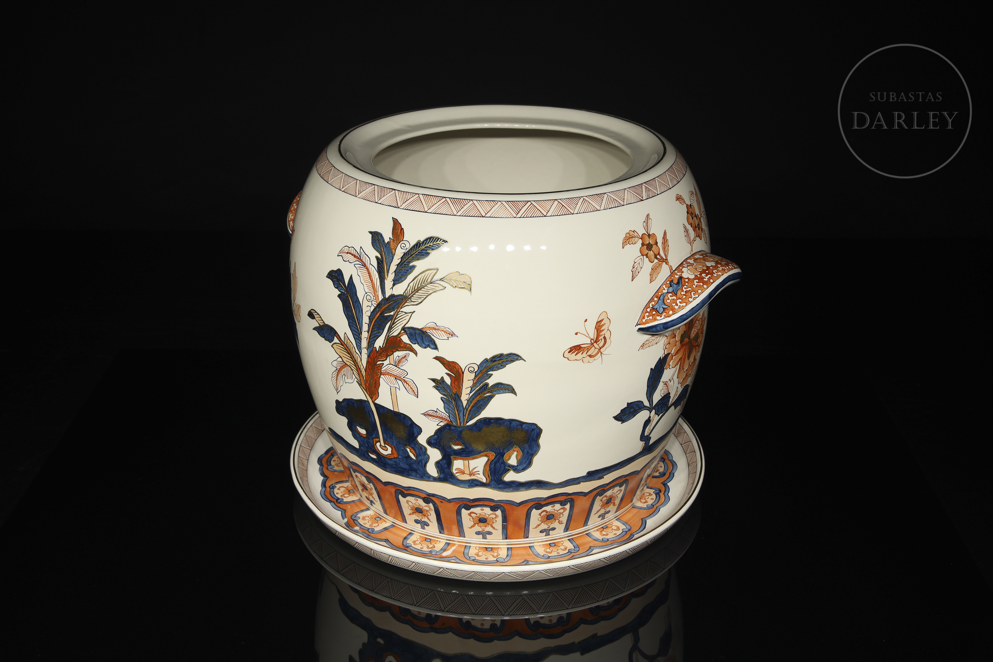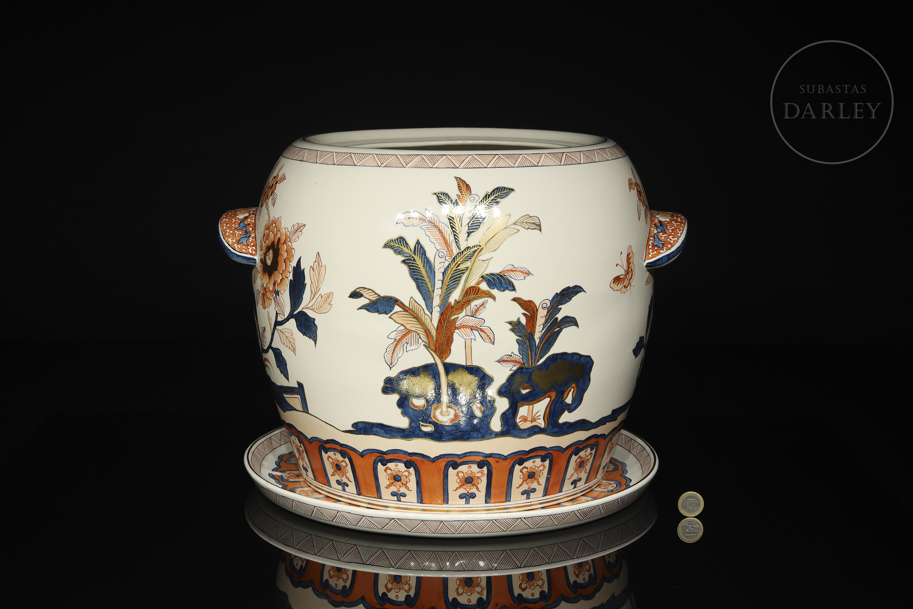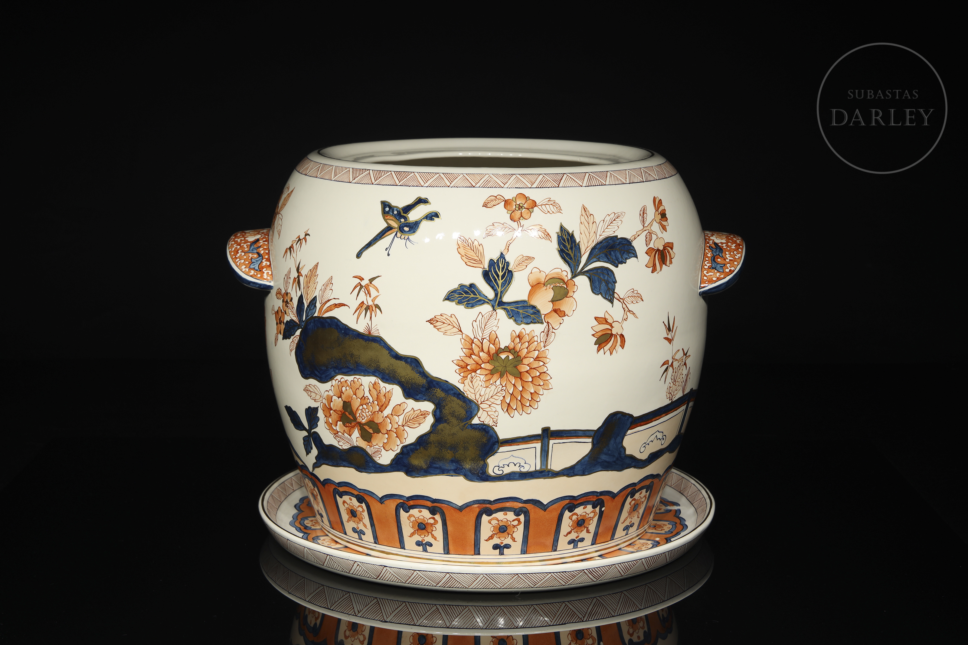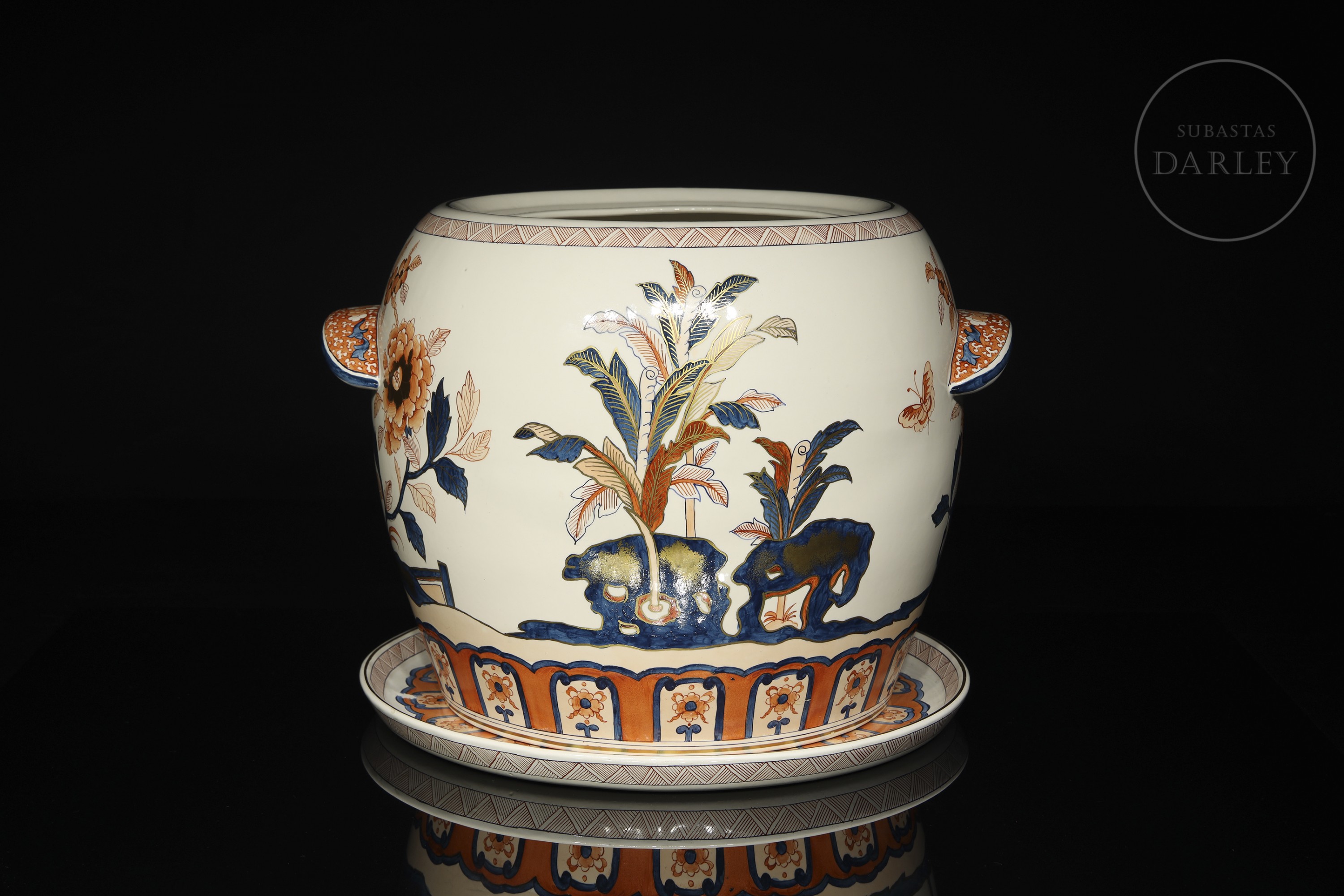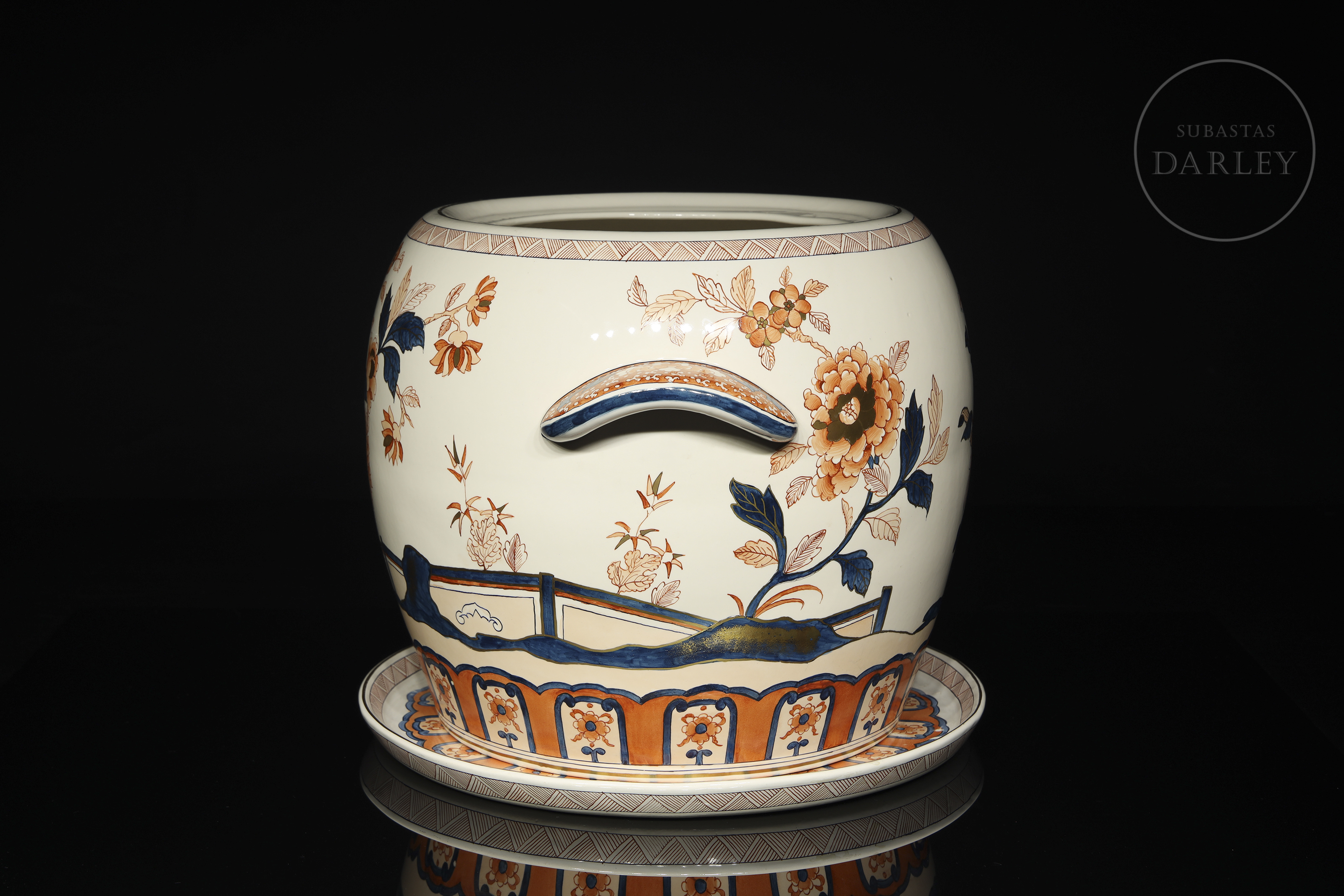Planter with plate in Asian porcelain, “Landscape,” 20th century