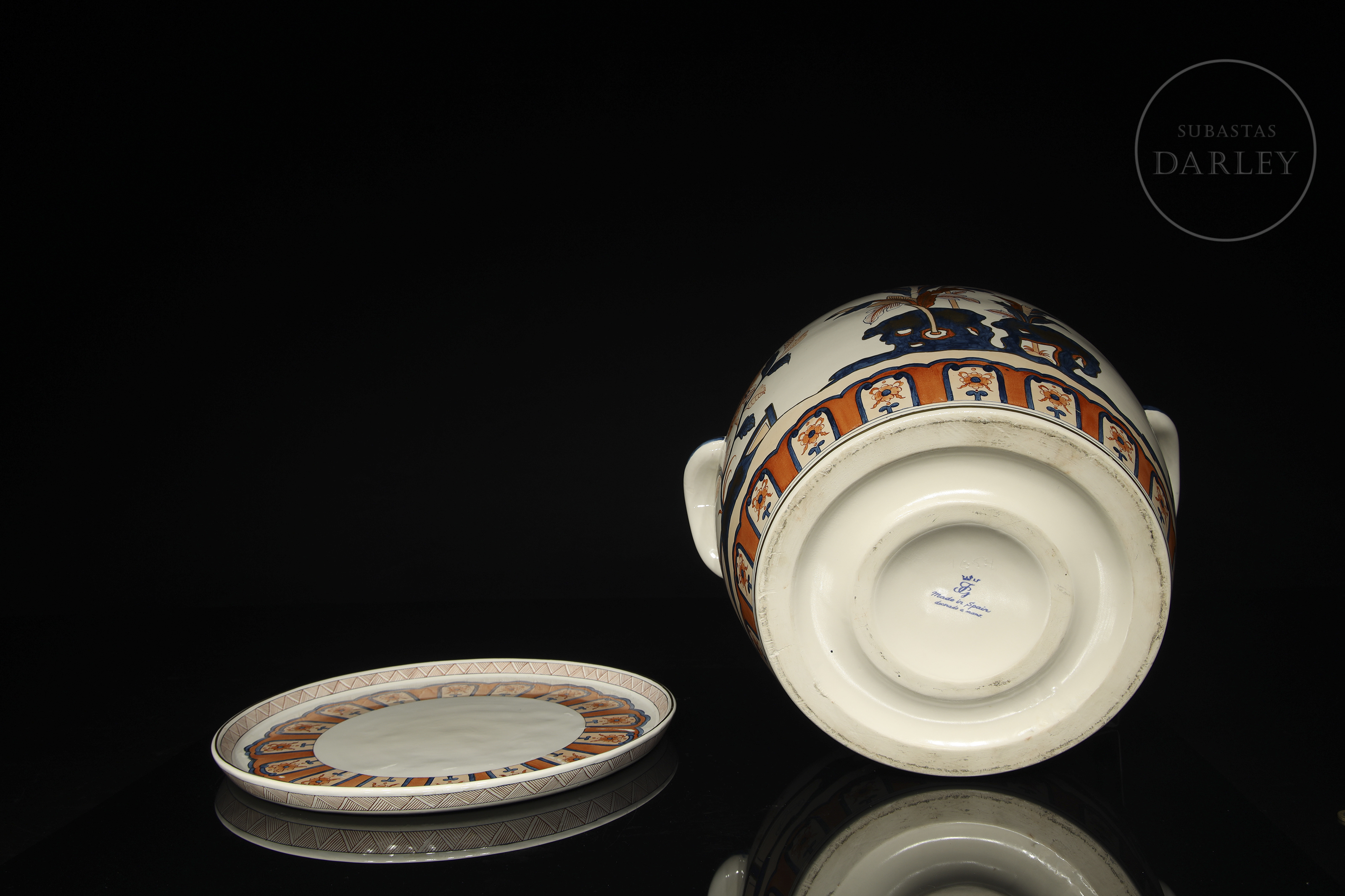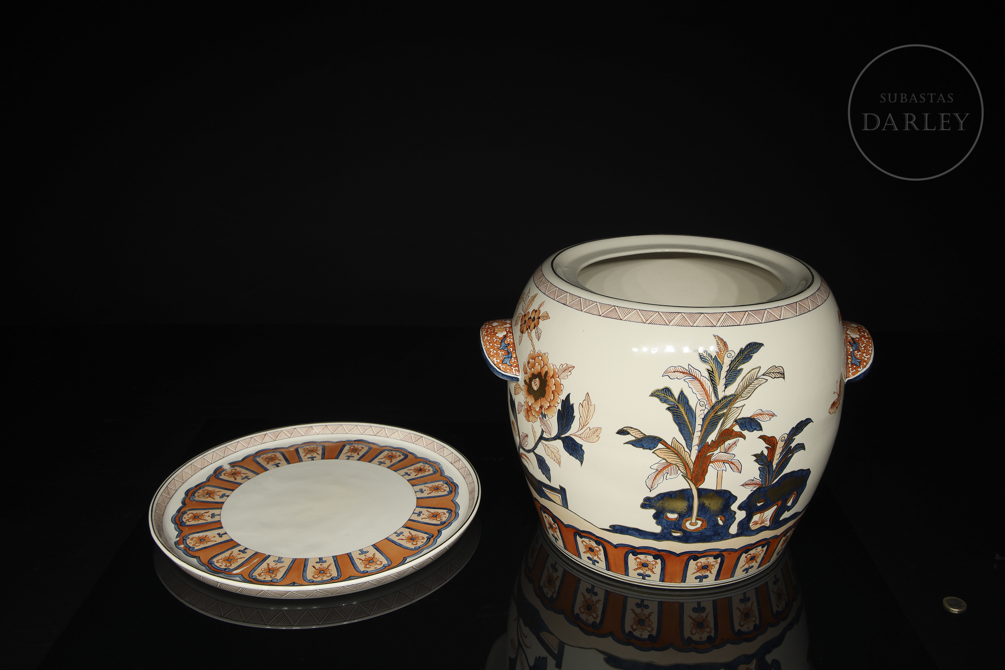 Globular planter with side handles and matching circular plate. Polychrome decoration in the Imari style with flowers, rocks, and butterflies in shades of cobalt blue, iron orange, and gold. Manufacturer's mark on the base.