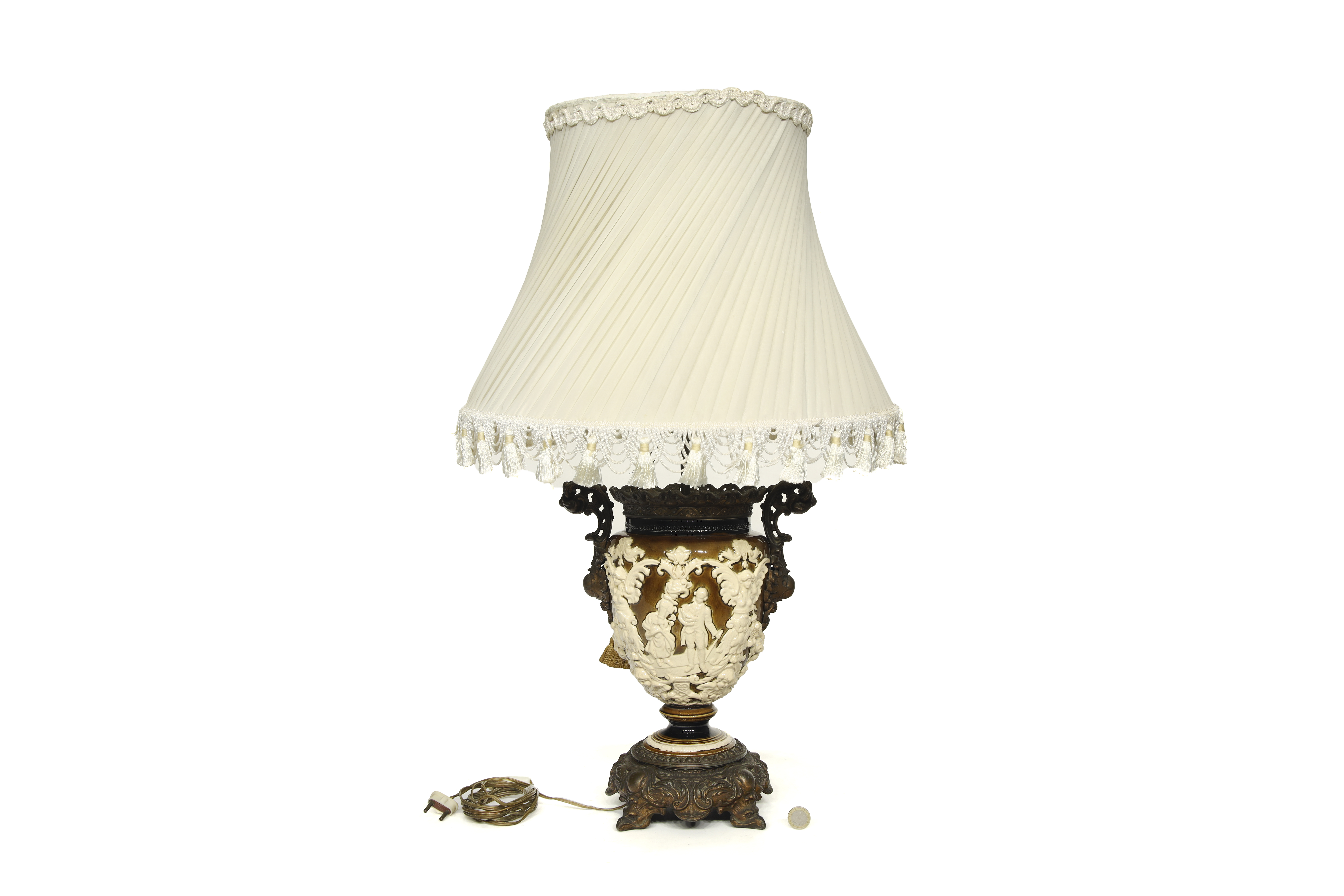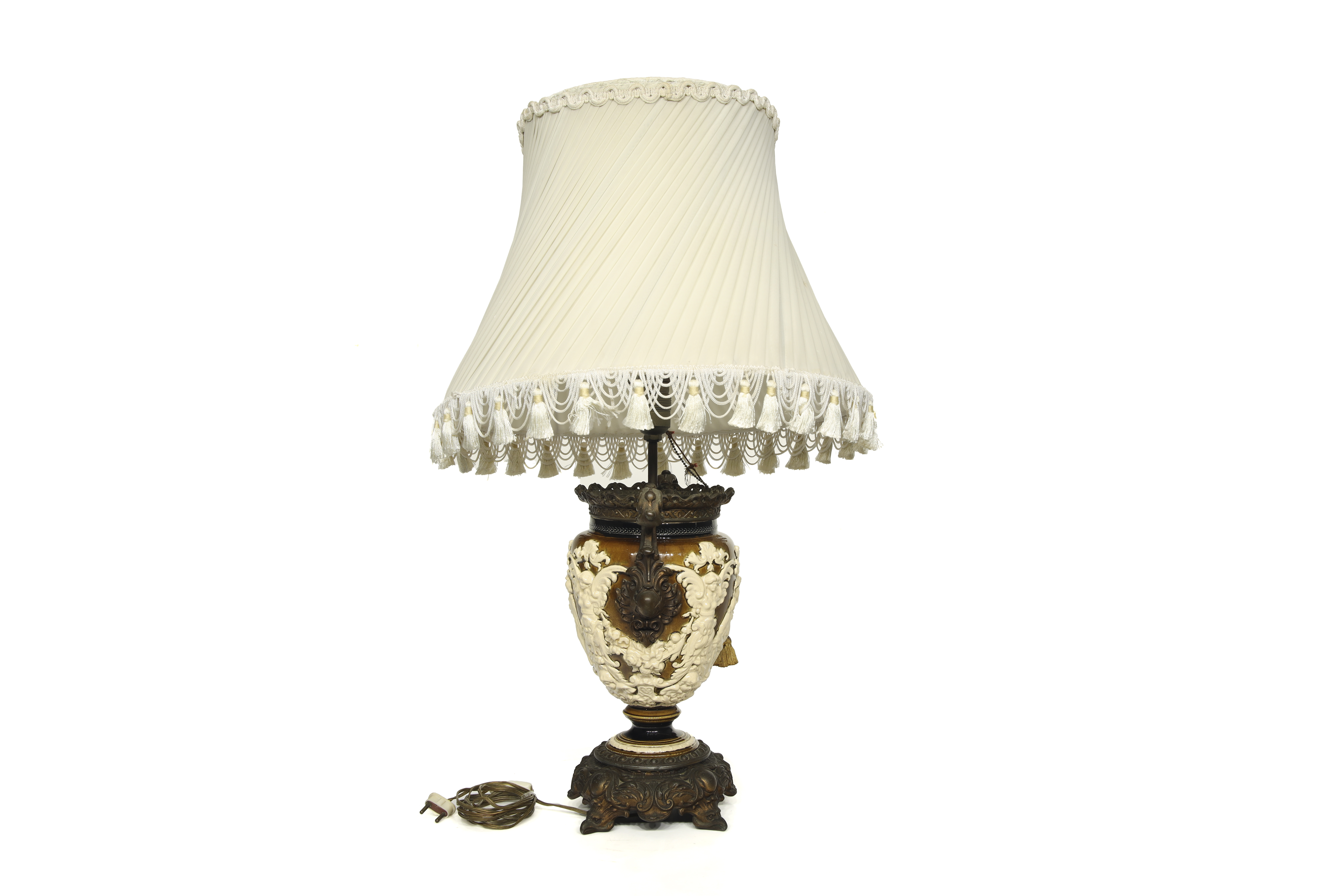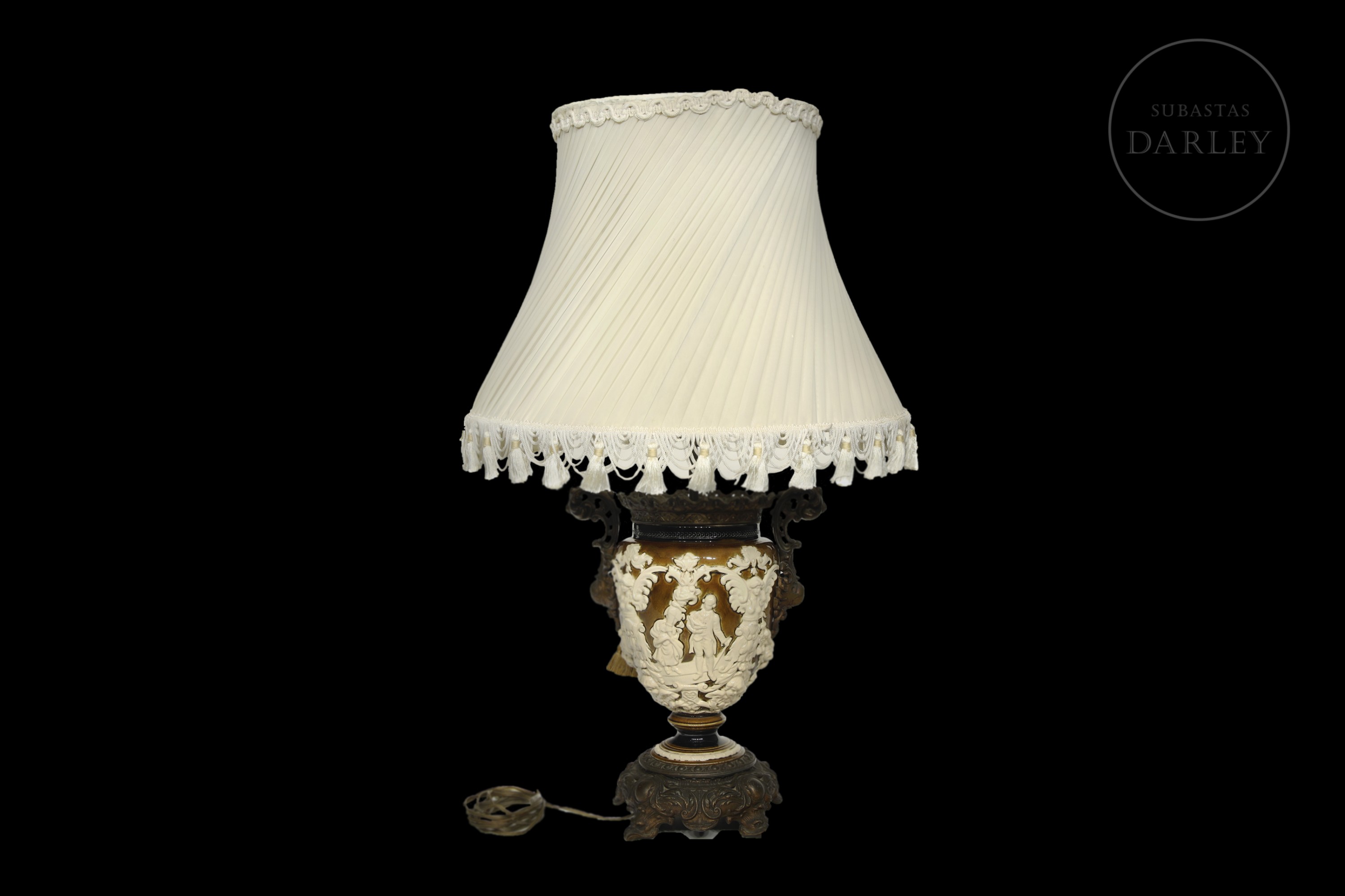 Ceramic and gold-plated metal. Table lamp made from a neoclassical-style ceramic vase. The body, with a crackled finish, features embossed decoration with classical figures. Metal frame and pleated fabric shade.