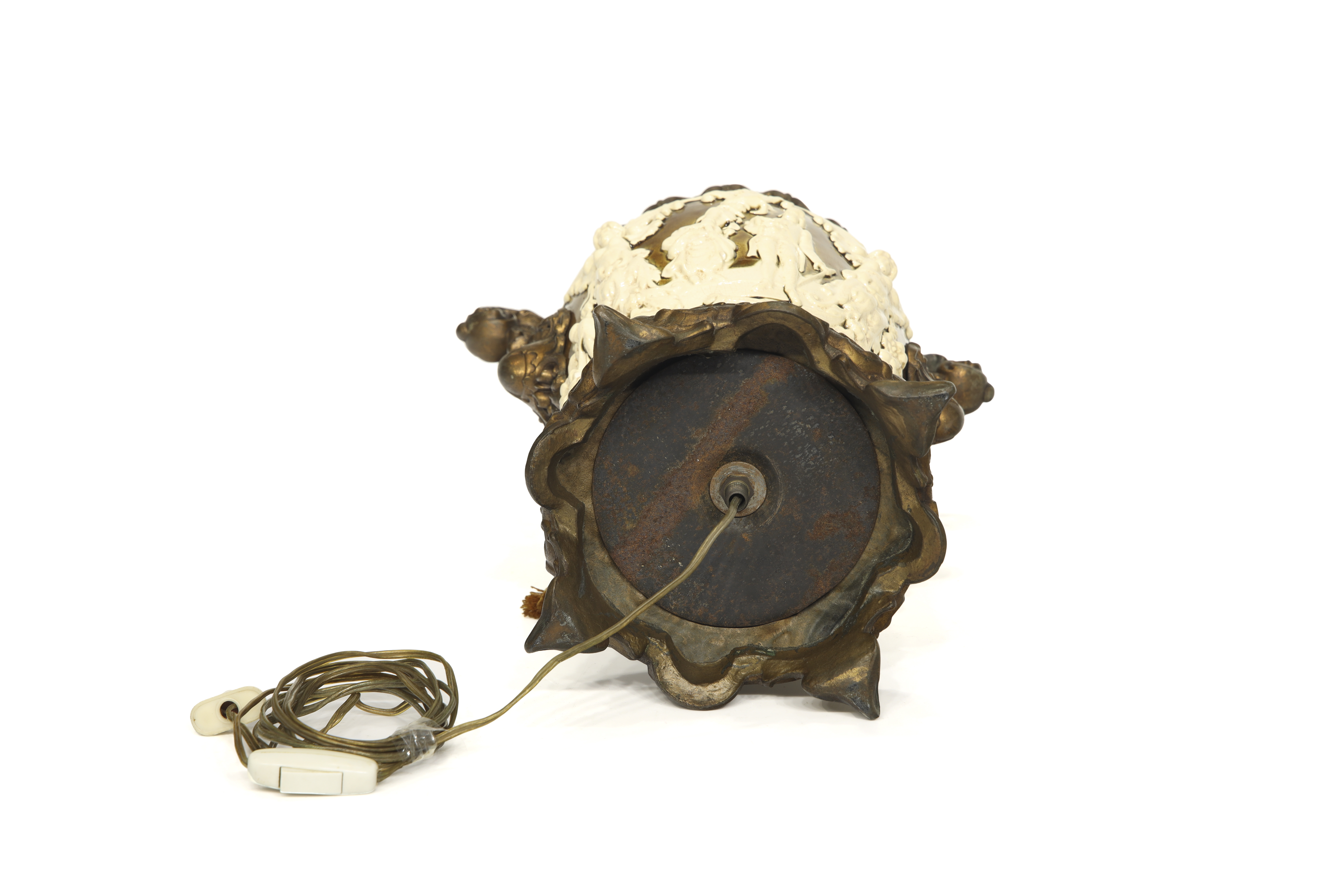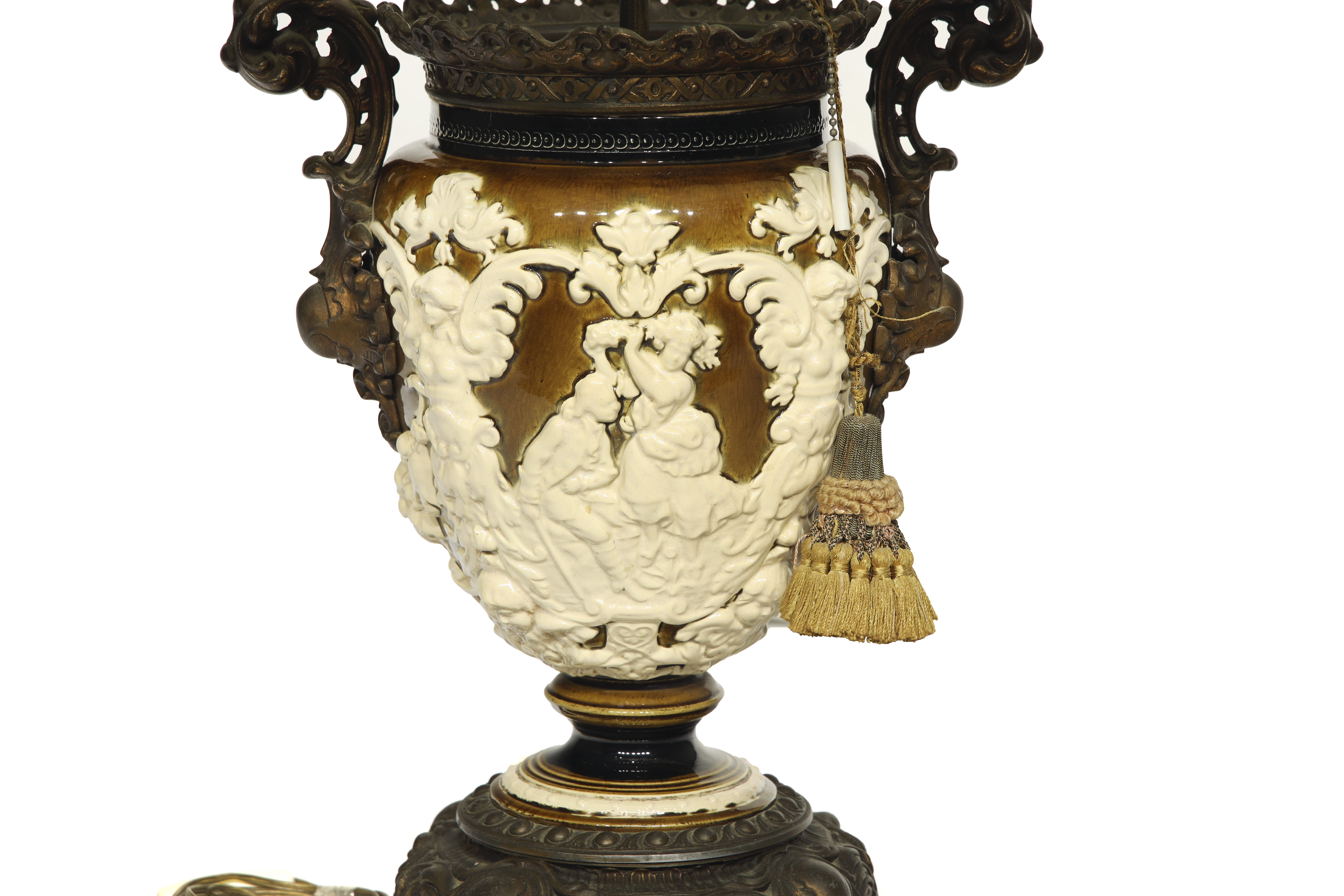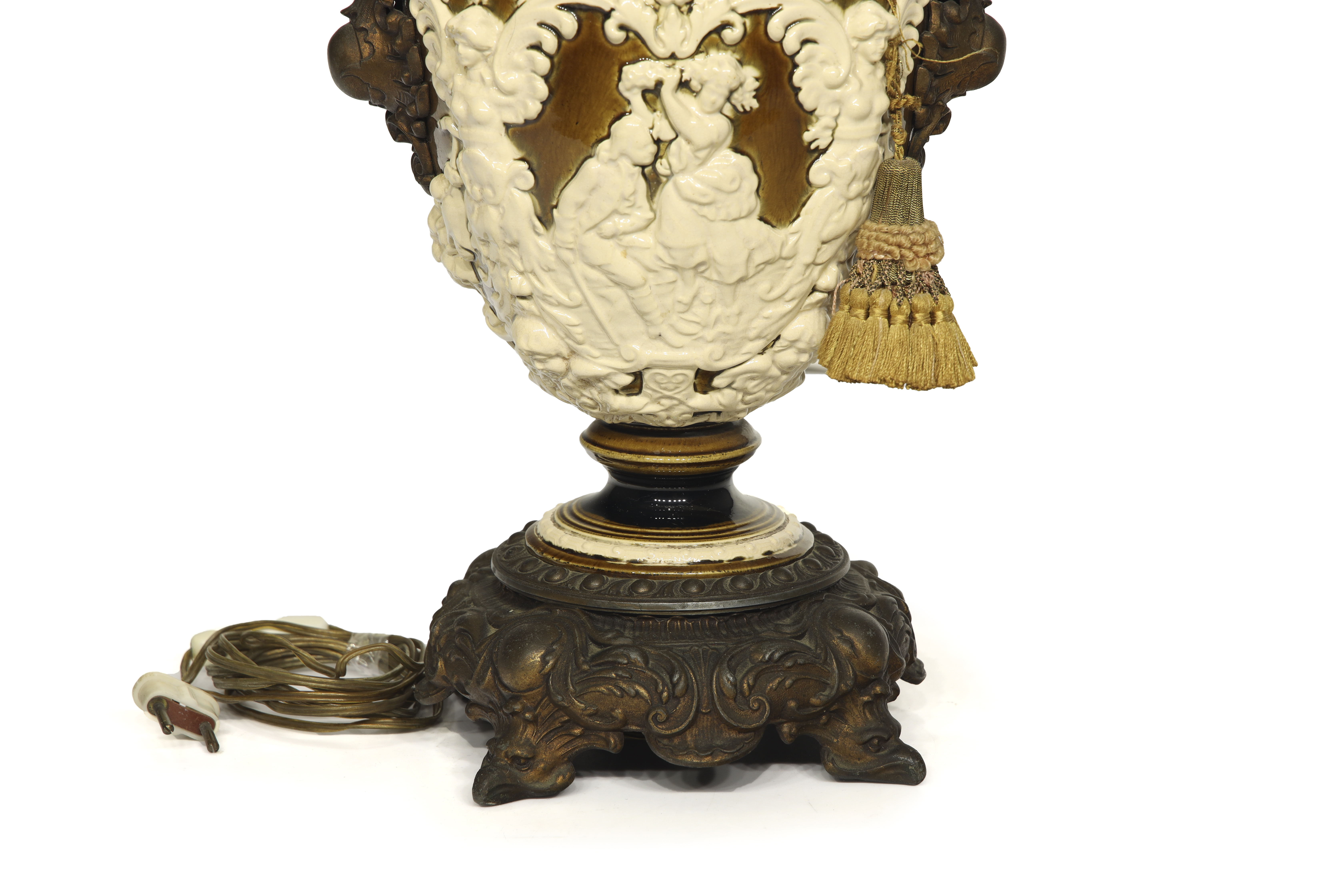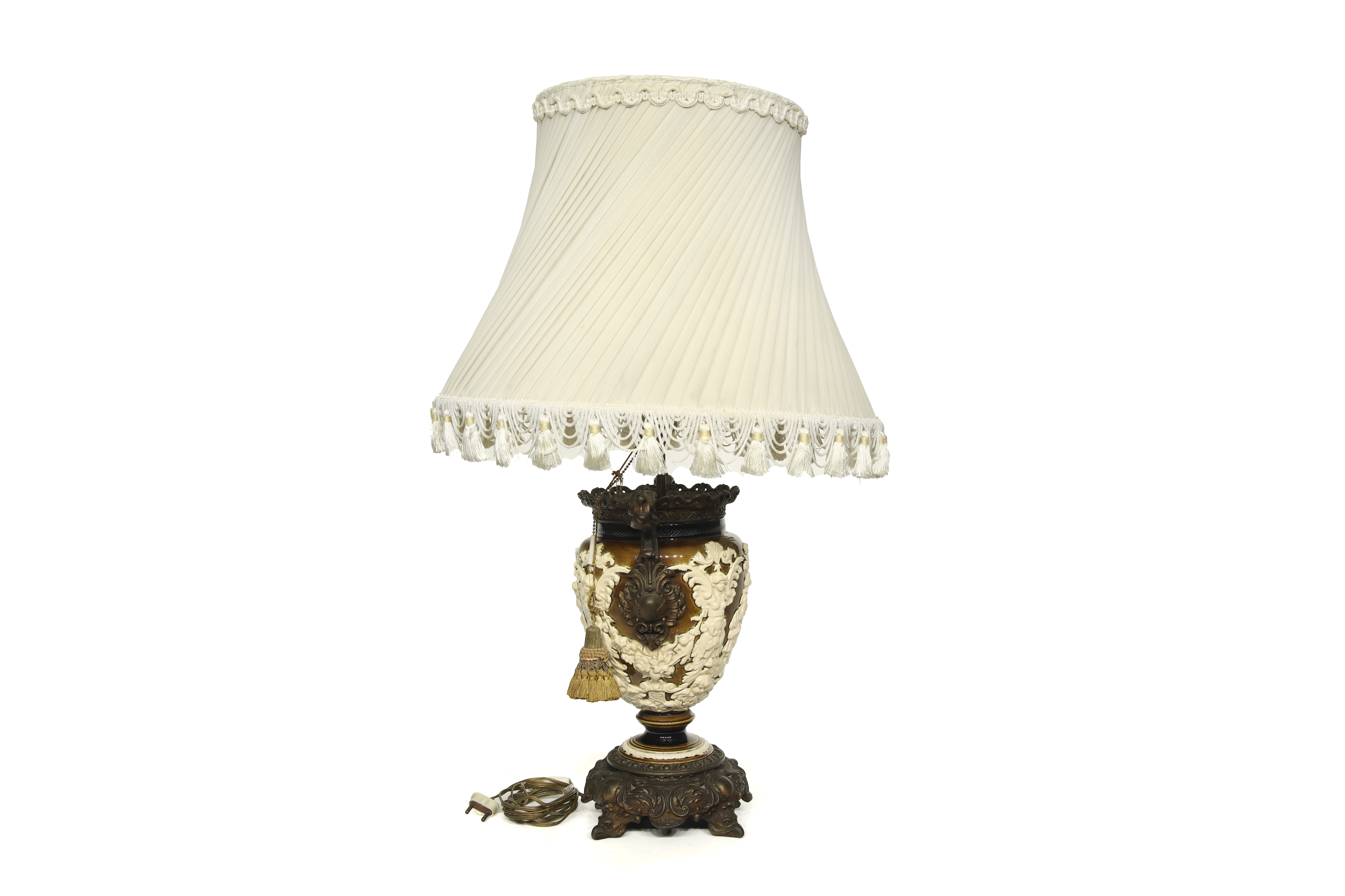 Ceramic and gold-plated metal. Table lamp made from a neoclassical-style ceramic vase. The body, with a crackled finish, features embossed decoration with classical figures. Metal frame and pleated fabric shade.