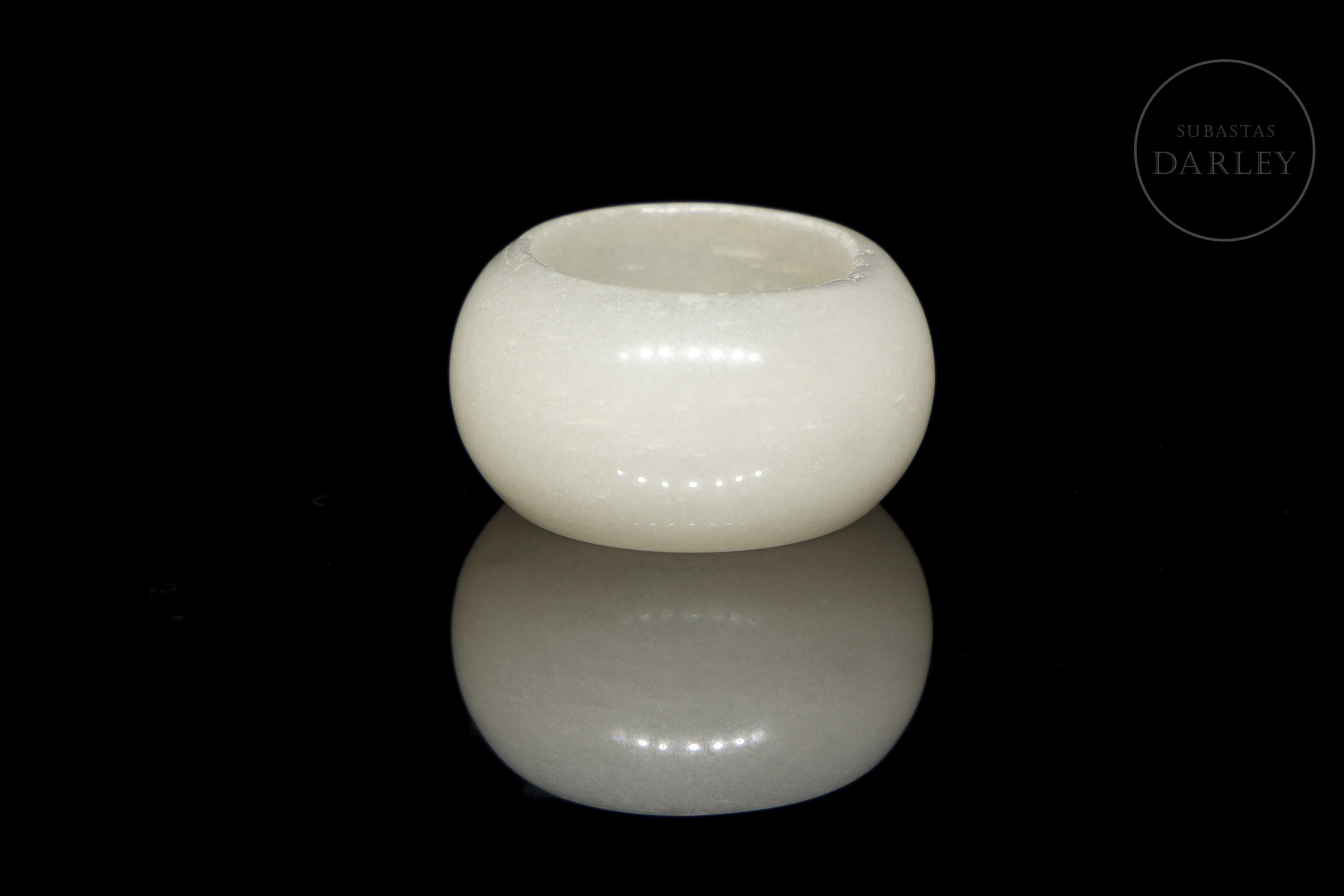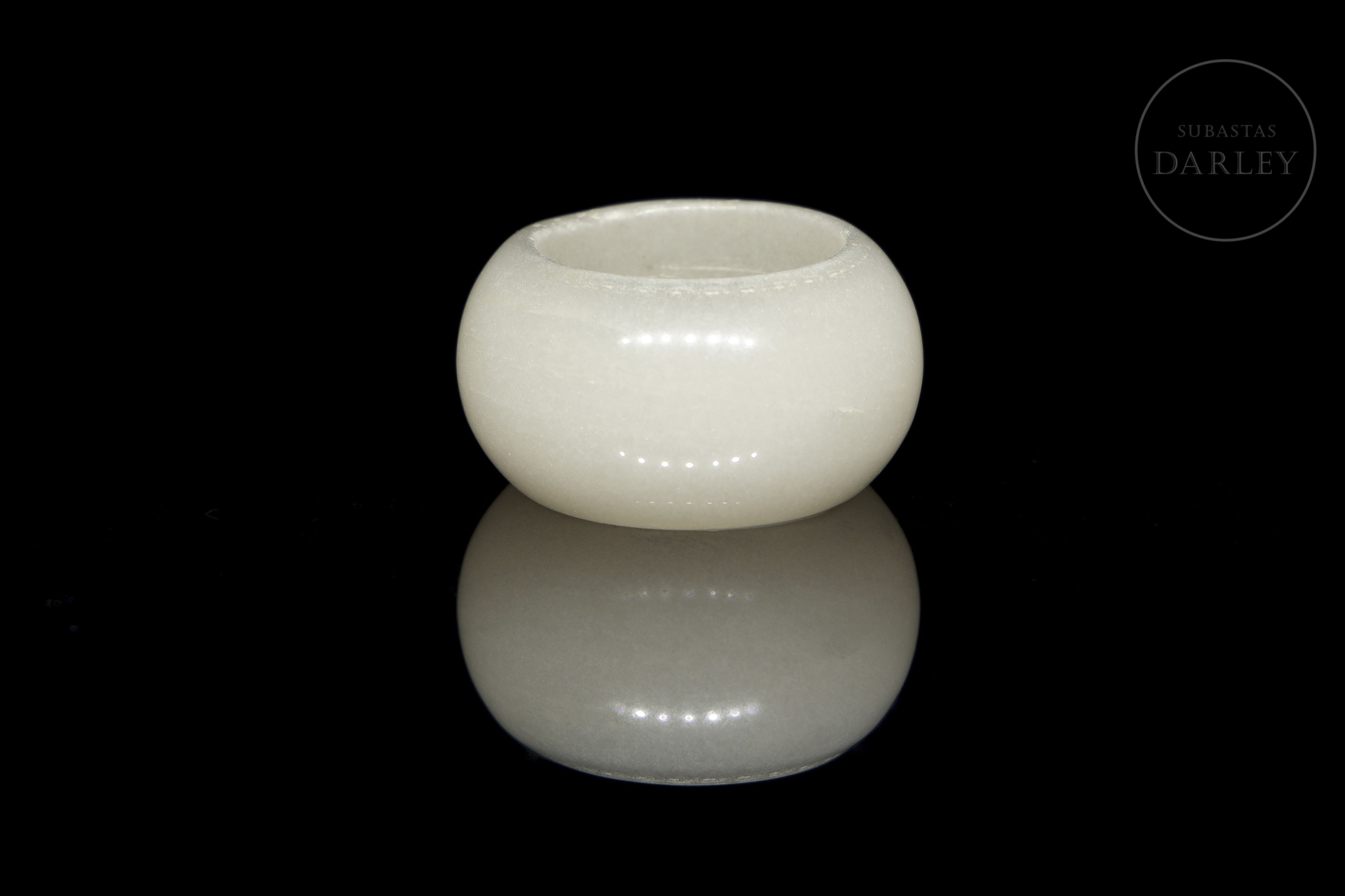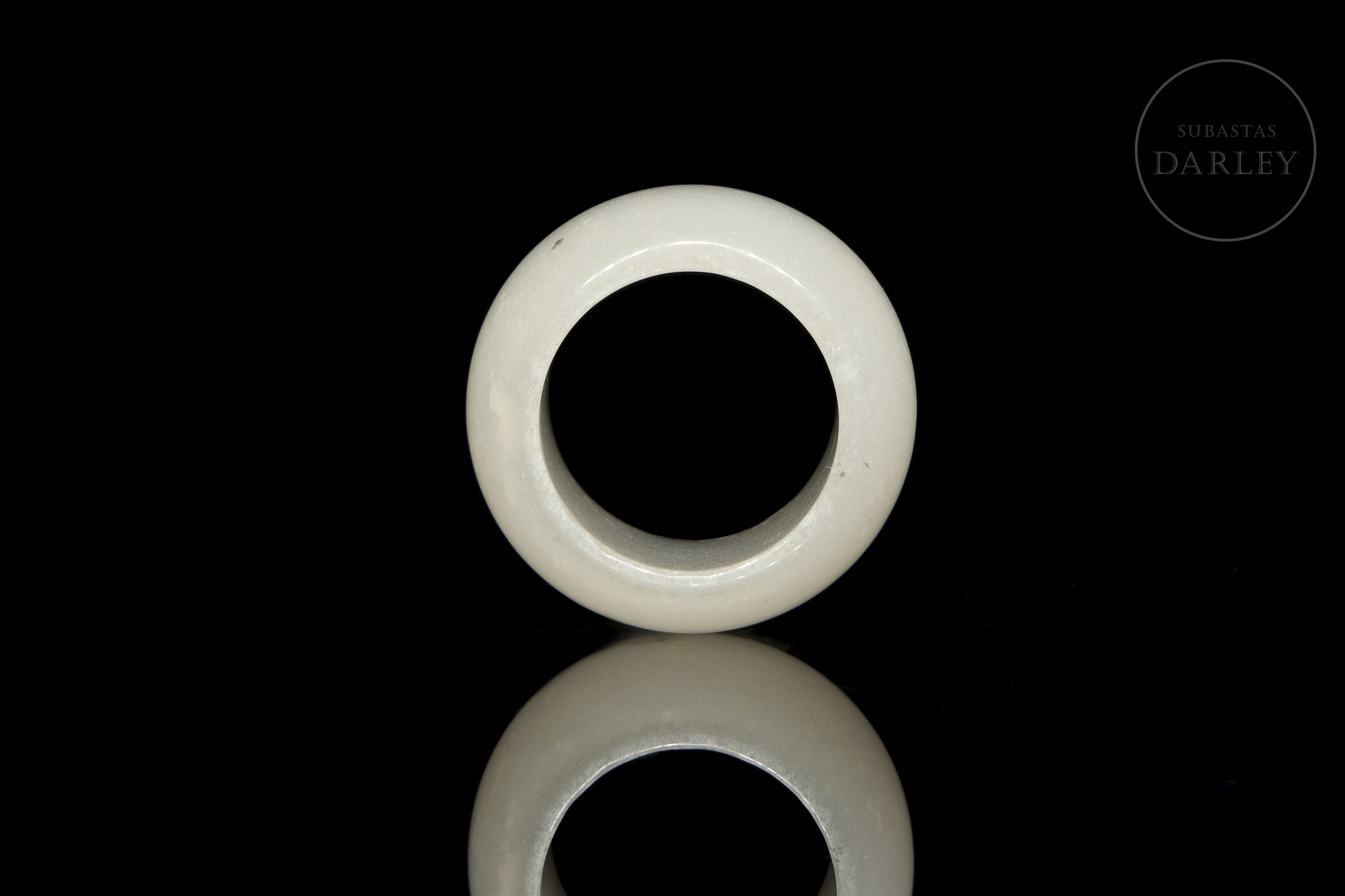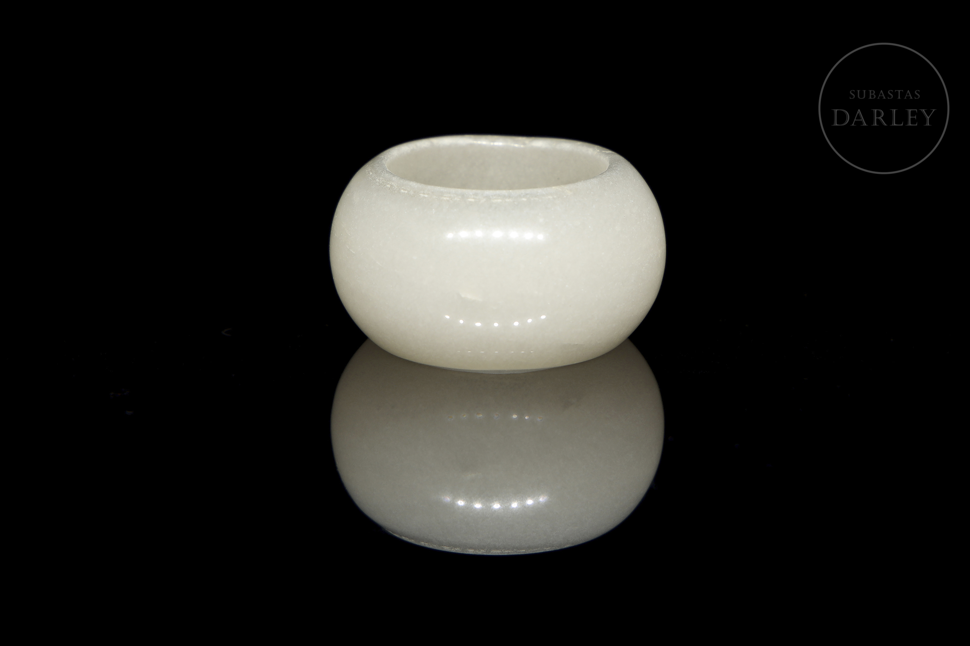 Ring carved from jade of a uniform white hue, slightly domed in shape with gently rounded edges. The polished surfaces enhance the delicacy of the stone.