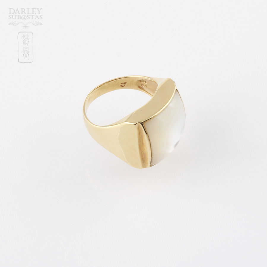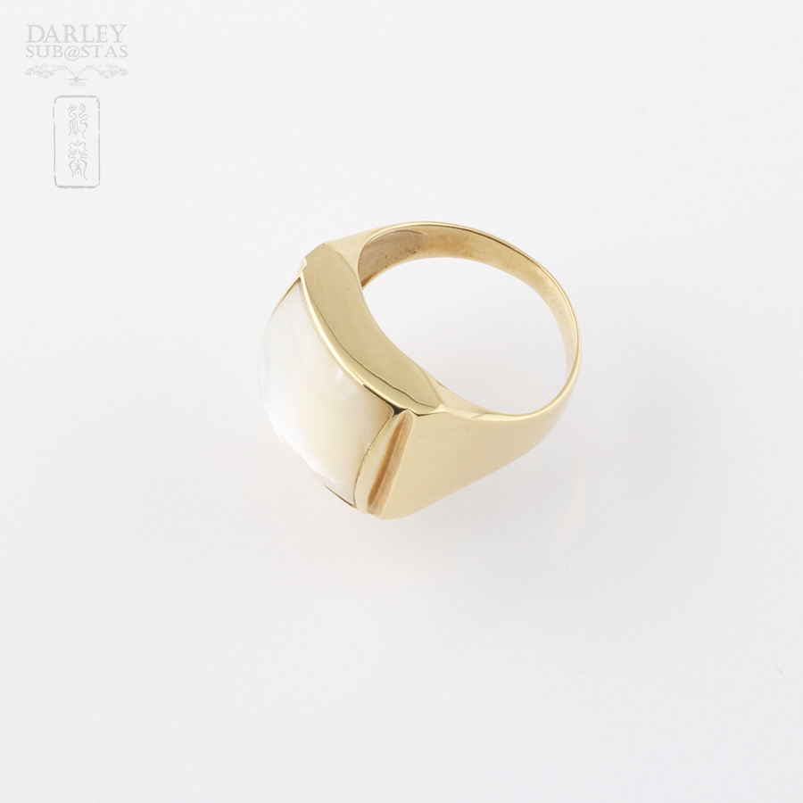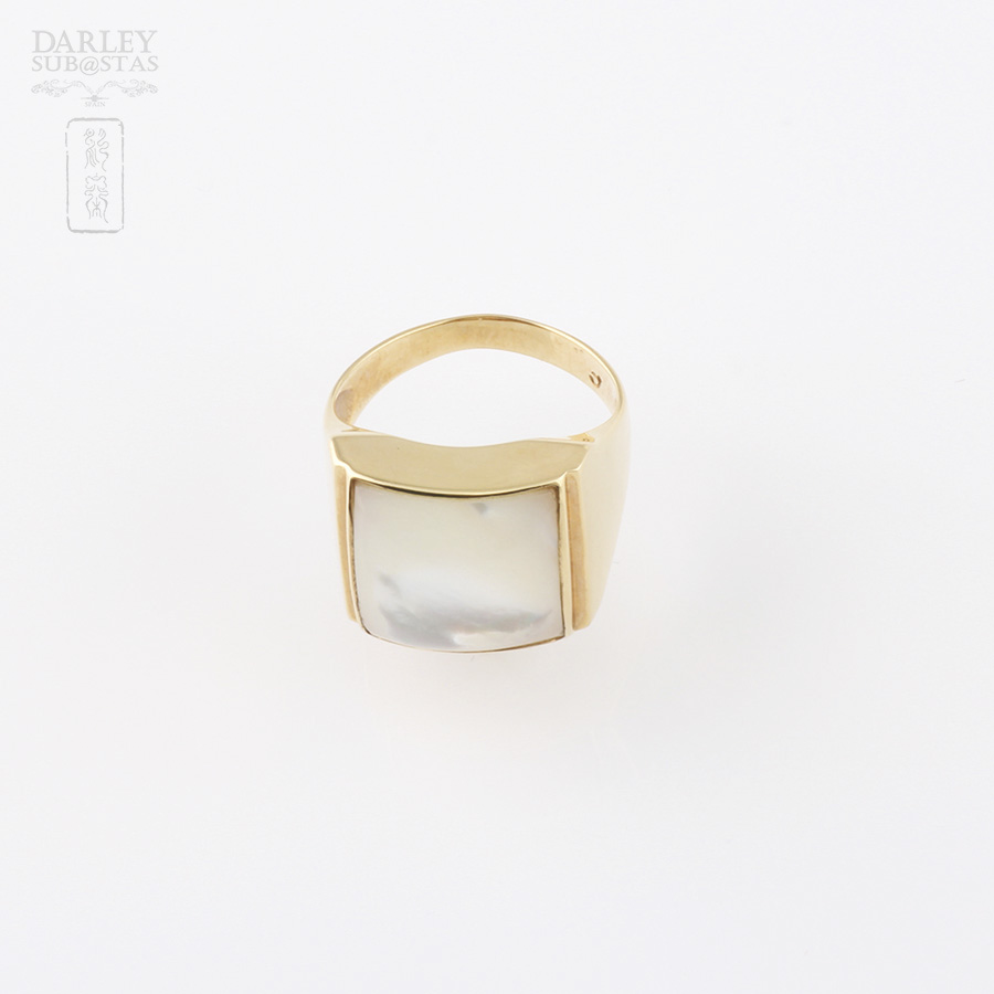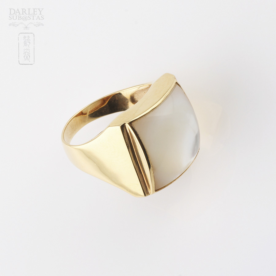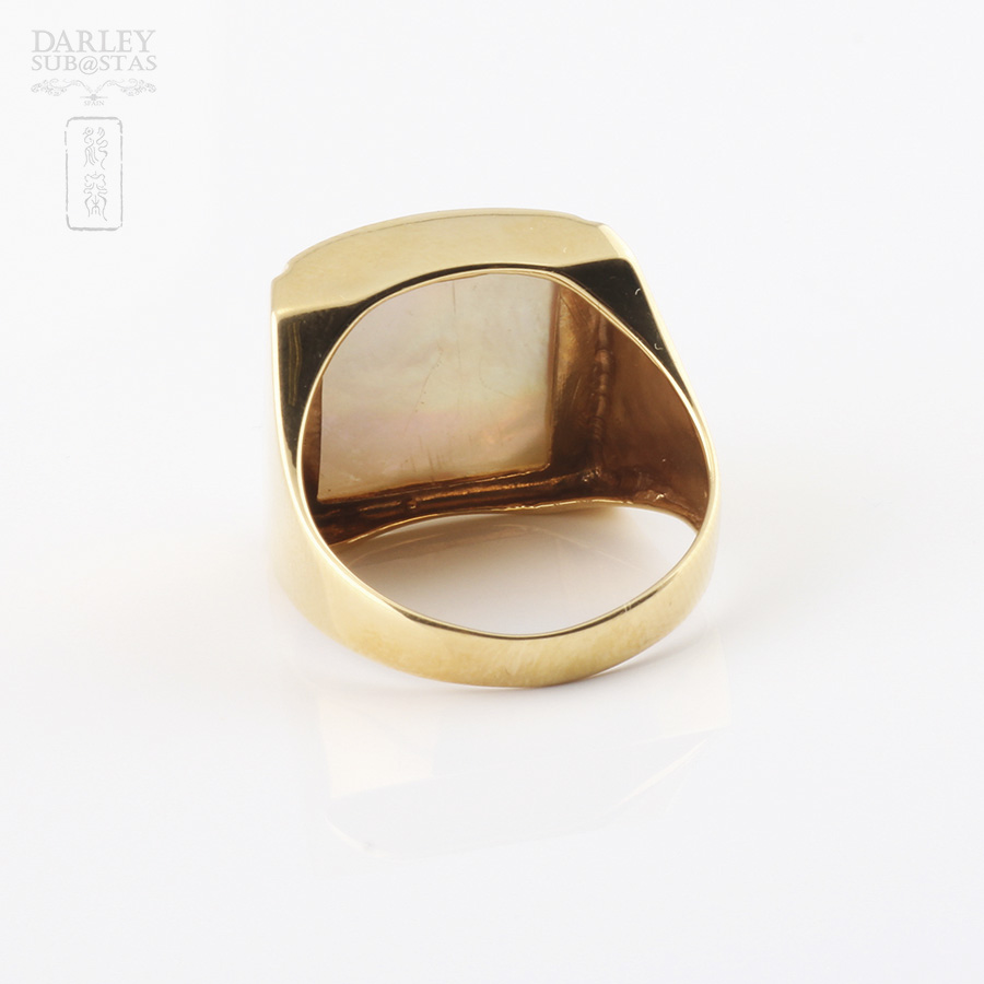 Ring in 18k yellow gold with natural mother of pearl. Classic model of ring type seal width arm definition. He chairs the frontis piece of natural mother of pearl rectangular domed de13x14mm that secures with a bezel that serves, in turn, frame, giving greater prominence.