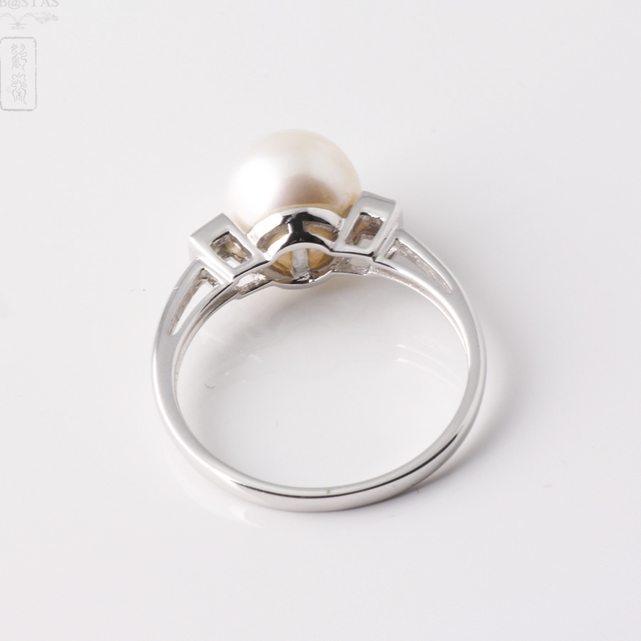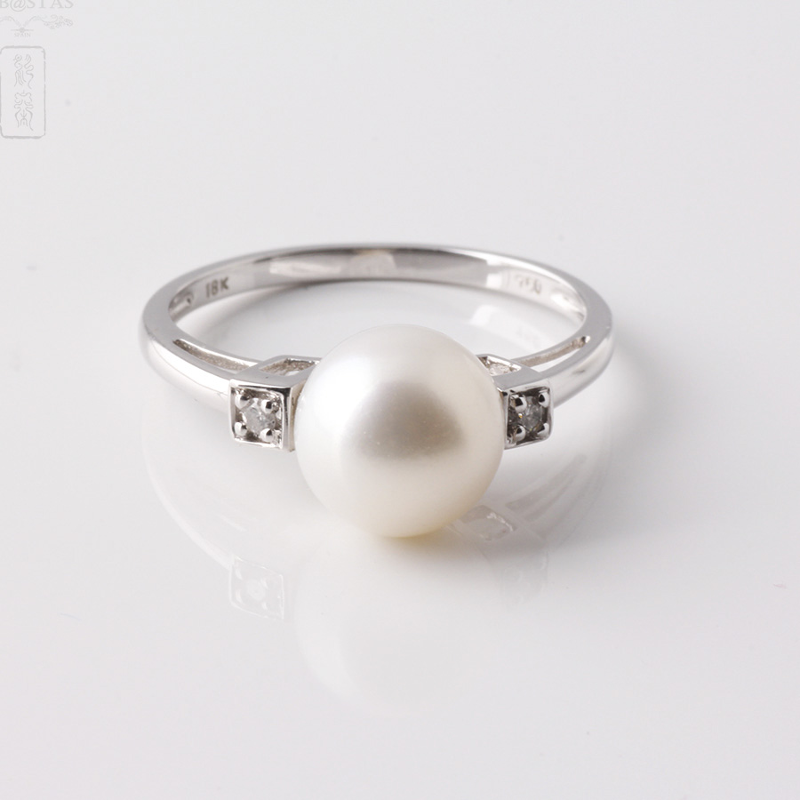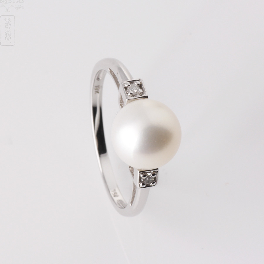 Ring in 18k white gold solitaire and 2 diamantes.Modelo natural white cultured pearl with good luster and spherical shape of approximately 8.55 mm. Garnish each of its sides two cubic forms that house inside a small diamond, brilliant cut, crimp claw part and a flat arm.