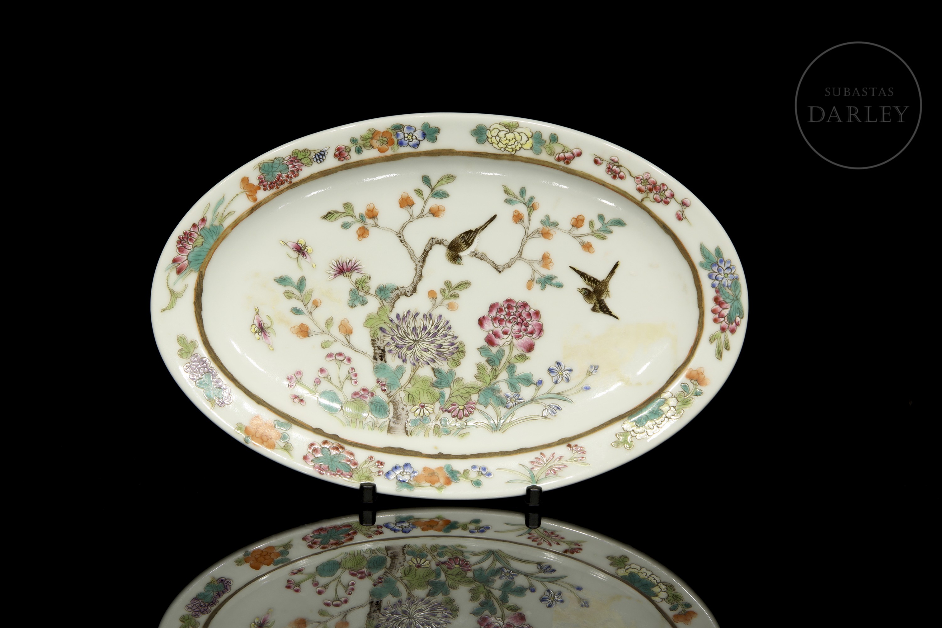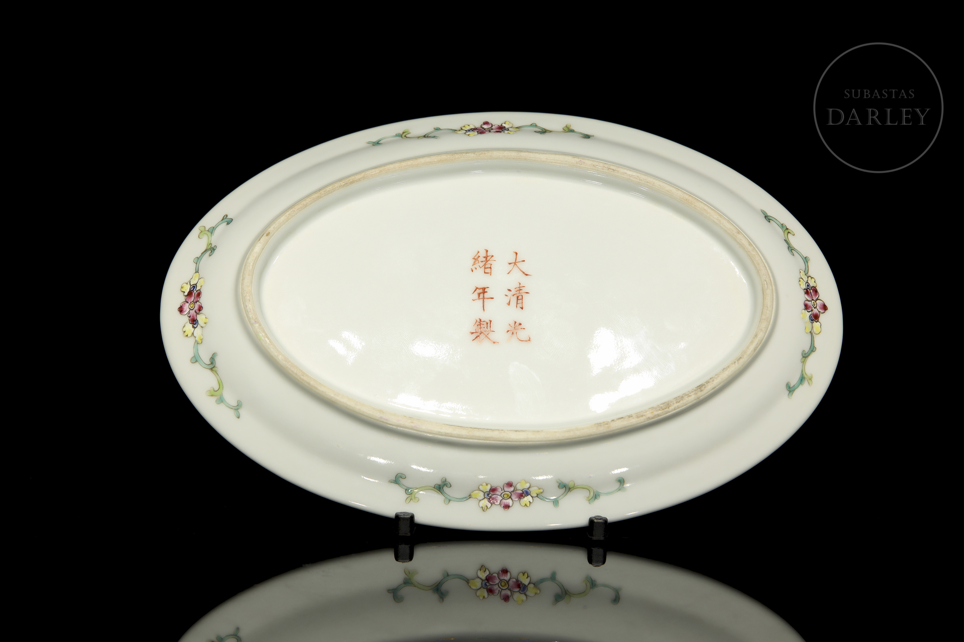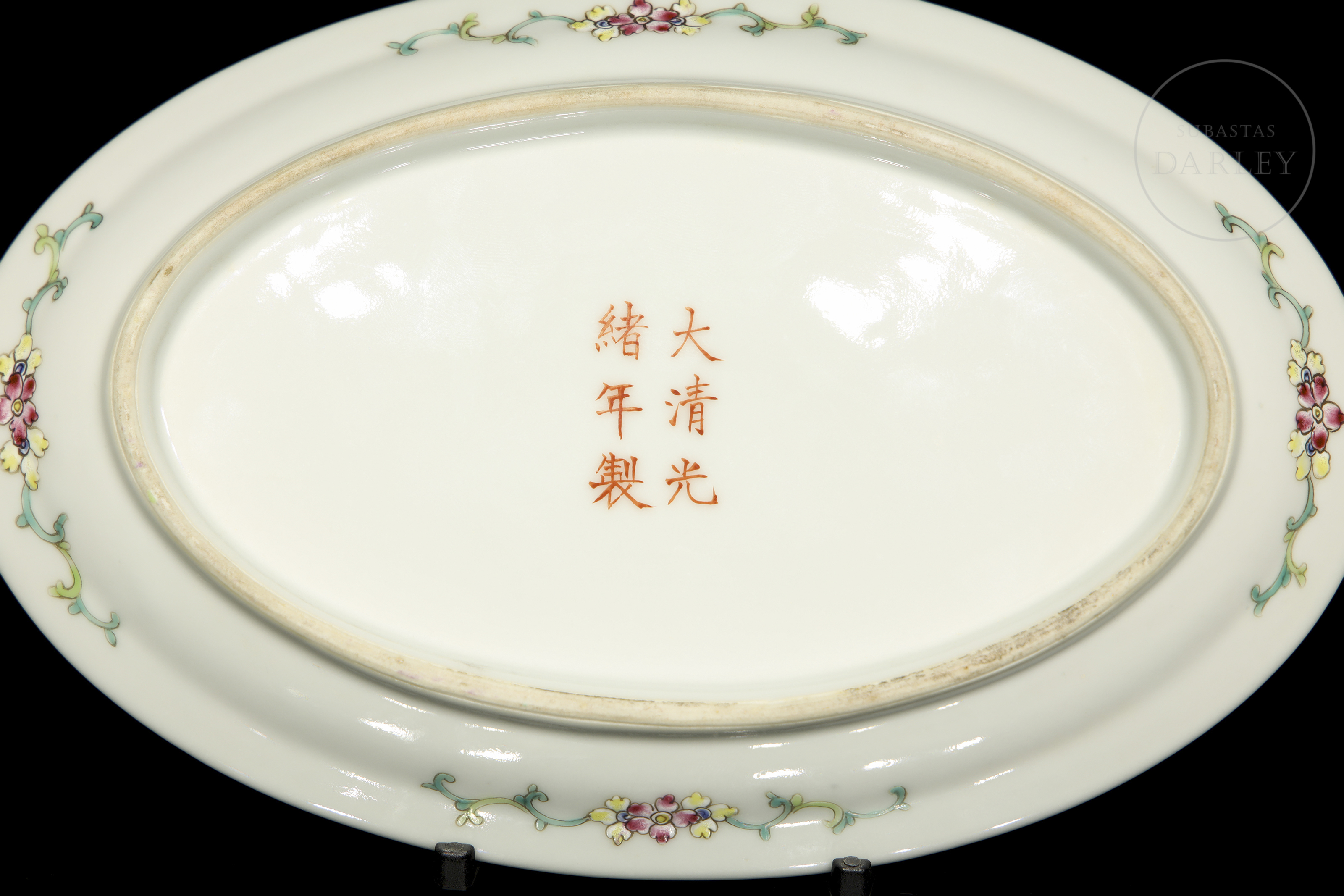 An oval porcelain tray with a flat base surrounded by a thick rim. It is decorated with beautiful ‘pink-family’ enamels on glaze, which form a central scene in which two small birds flutter among fine flowering branches, surrounded by beautiful and colourful peonies and chrysanthemums. The scene is framed by a border of vegetal motifs such as fruits, leaves, lotuses and various flowers. On the base is a six-character stamp in red enamel ‘大清光绪年制’.