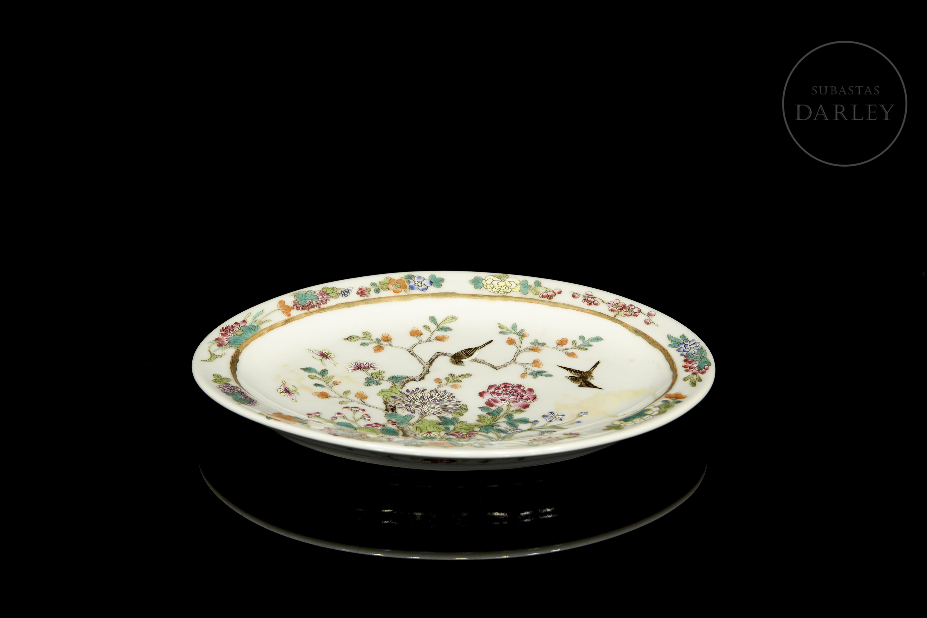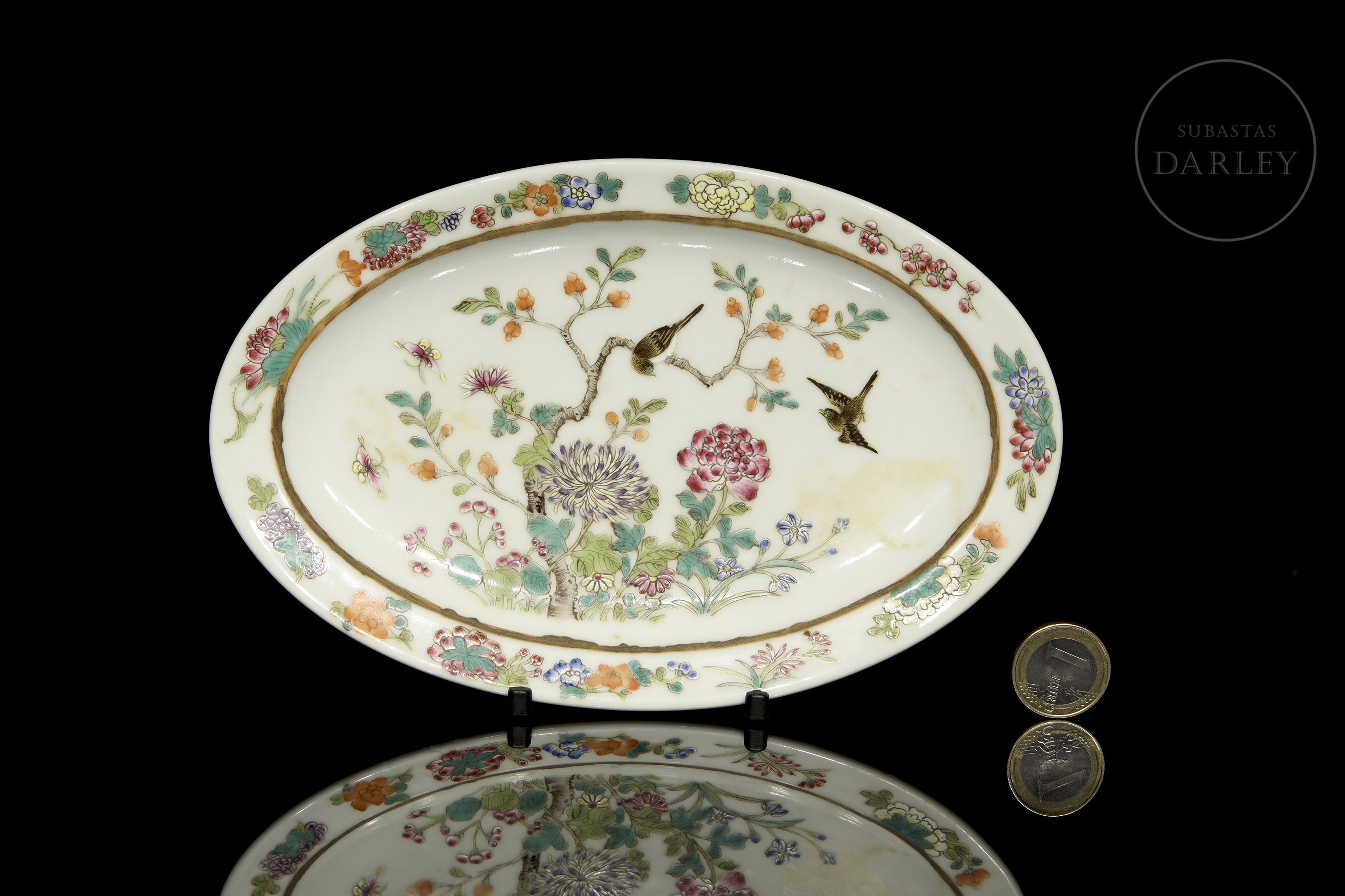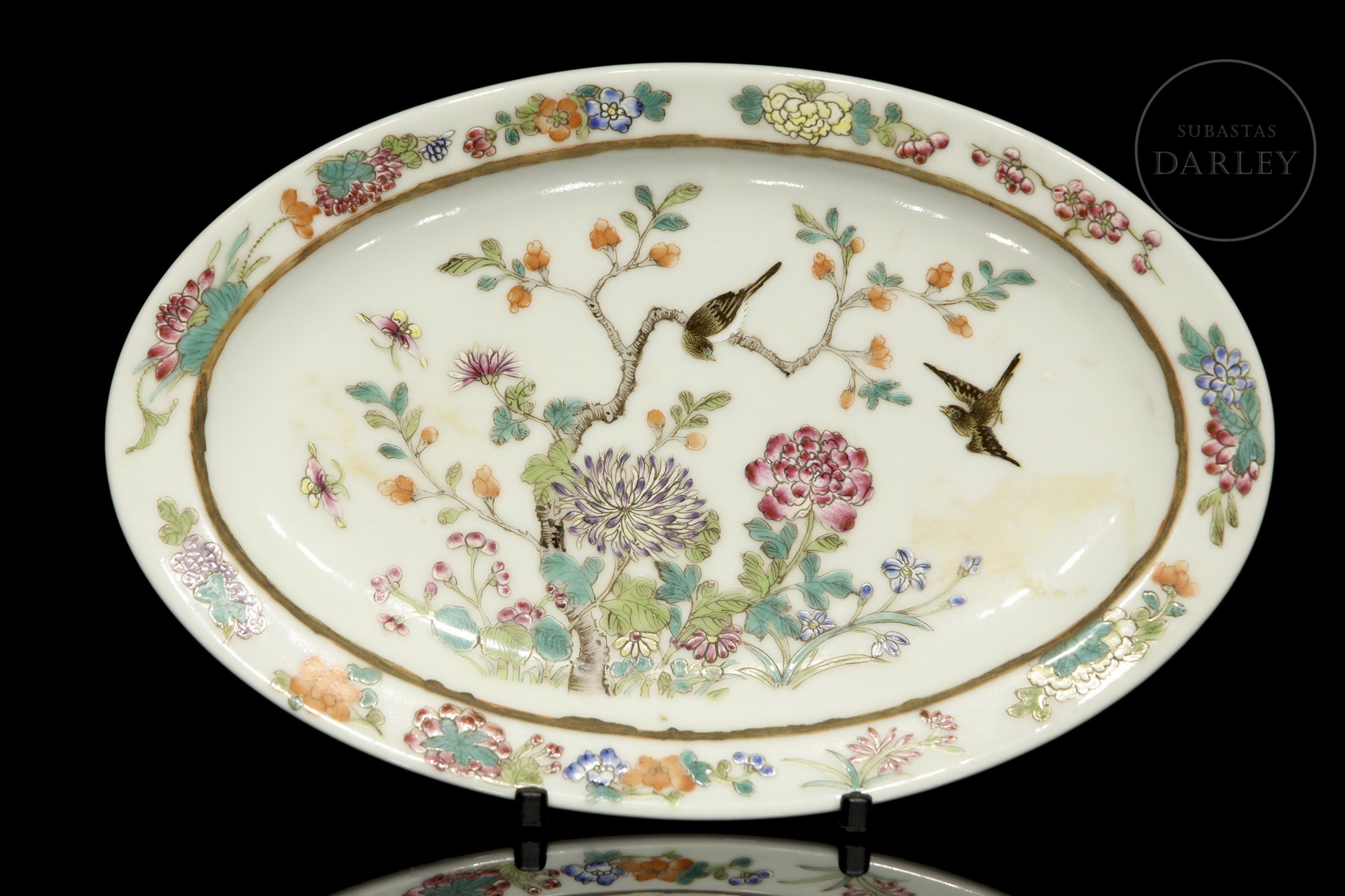 An oval porcelain tray with a flat base surrounded by a thick rim. It is decorated with beautiful ‘pink-family’ enamels on glaze, which form a central scene in which two small birds flutter among fine flowering branches, surrounded by beautiful and colourful peonies and chrysanthemums. The scene is framed by a border of vegetal motifs such as fruits, leaves, lotuses and various flowers. On the base is a six-character stamp in red enamel ‘大清光绪年制’.