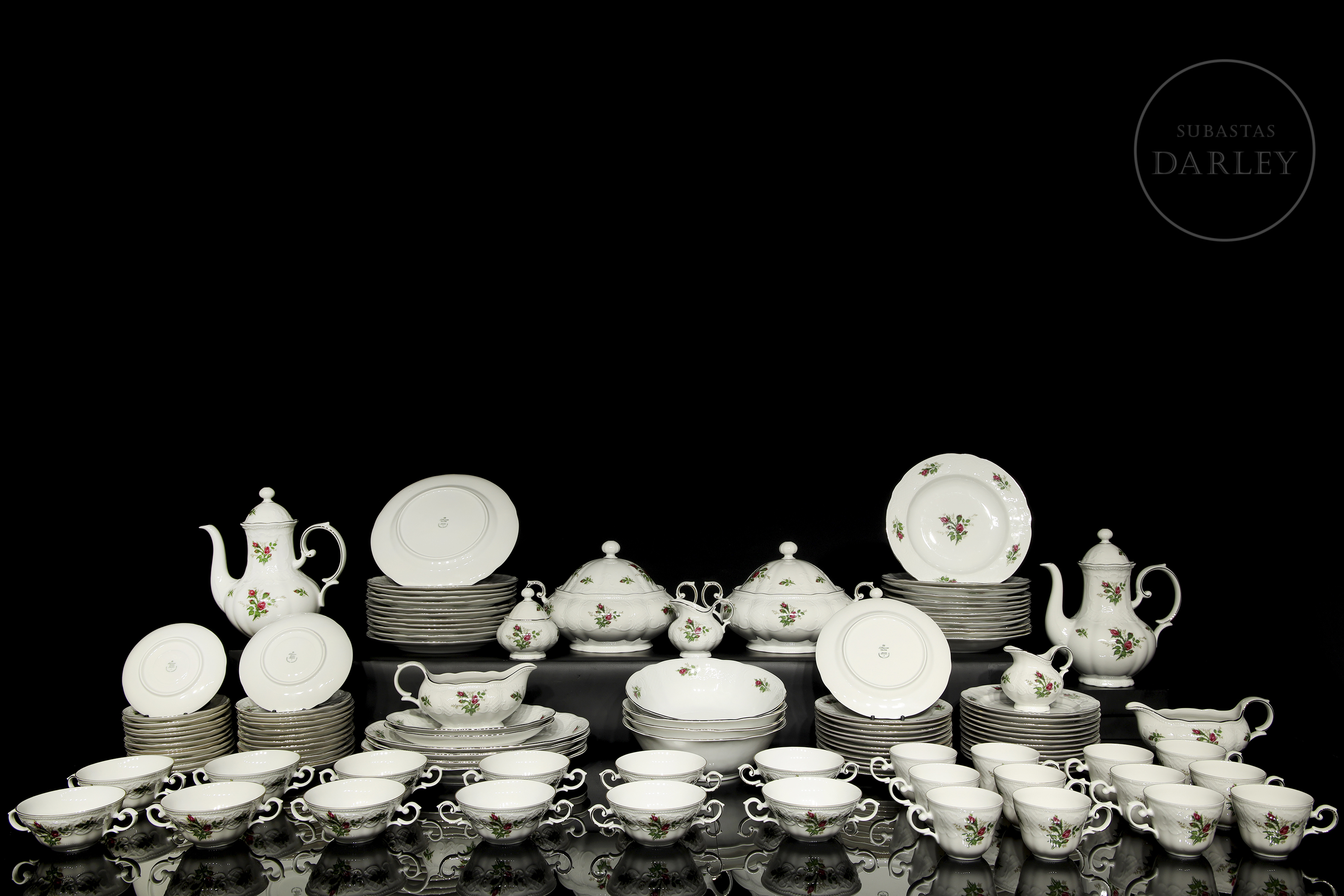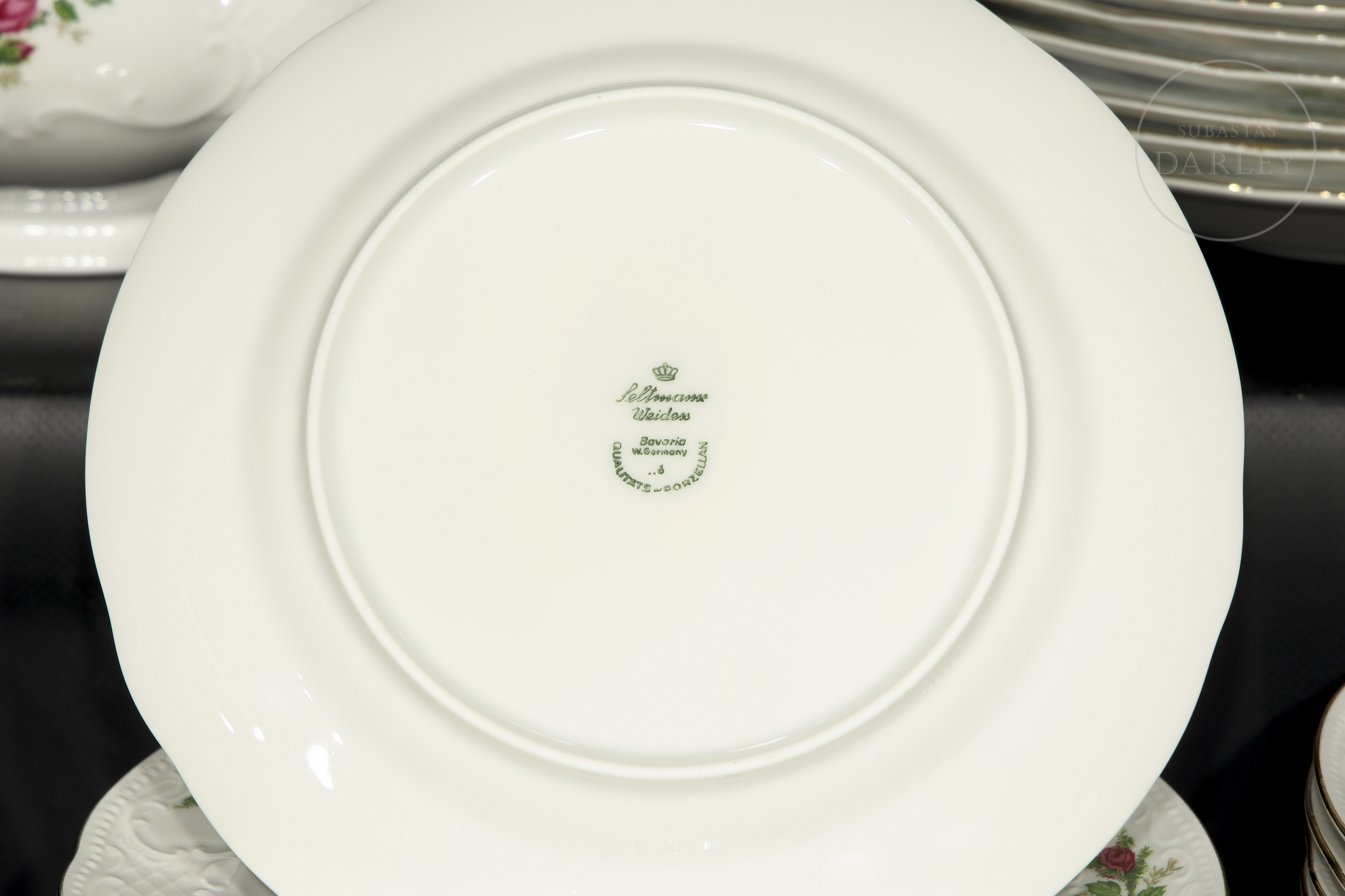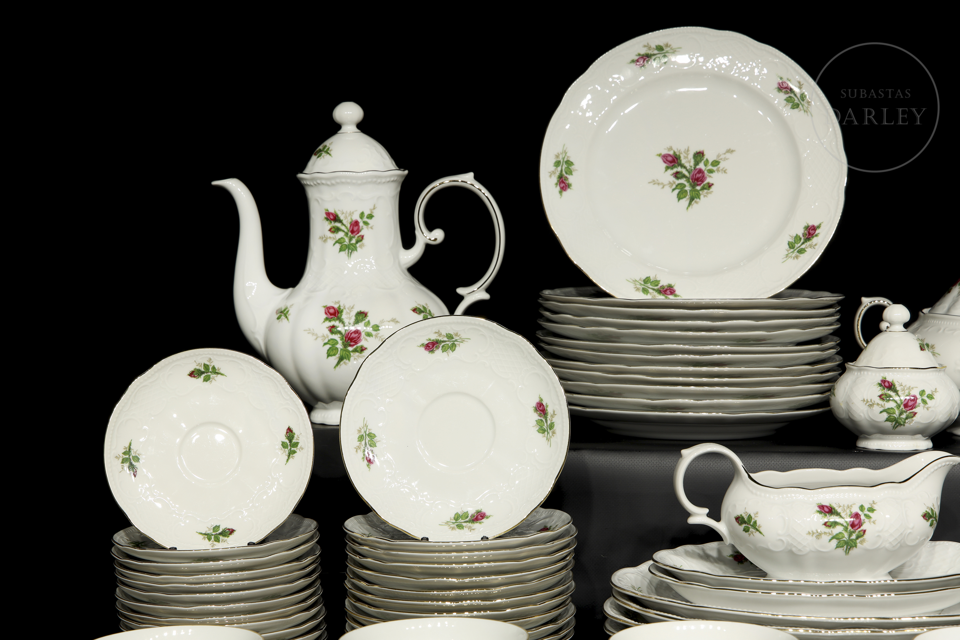 German porcelain set, made of fine white porcelain with polychrome floral bouquet decoration and slightly wavy edges. Includes 114 pieces of tableware and coffee service, with various platters, soup tureens, trays, and sets of plates in different sizes. The Seltmann Weiden company, founded in 1910 in Bavaria, is renowned for its production of high-quality porcelain with classic designs.