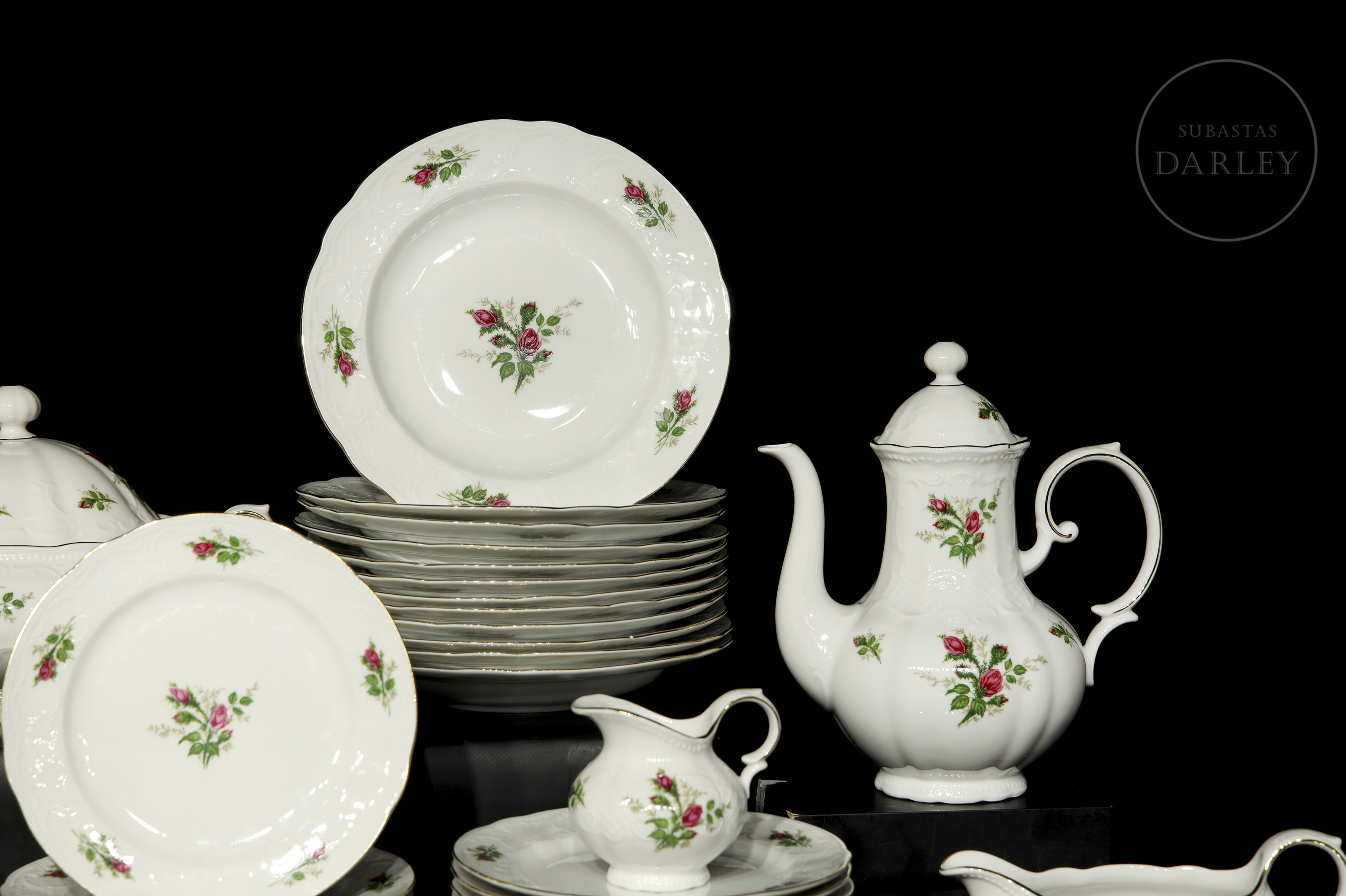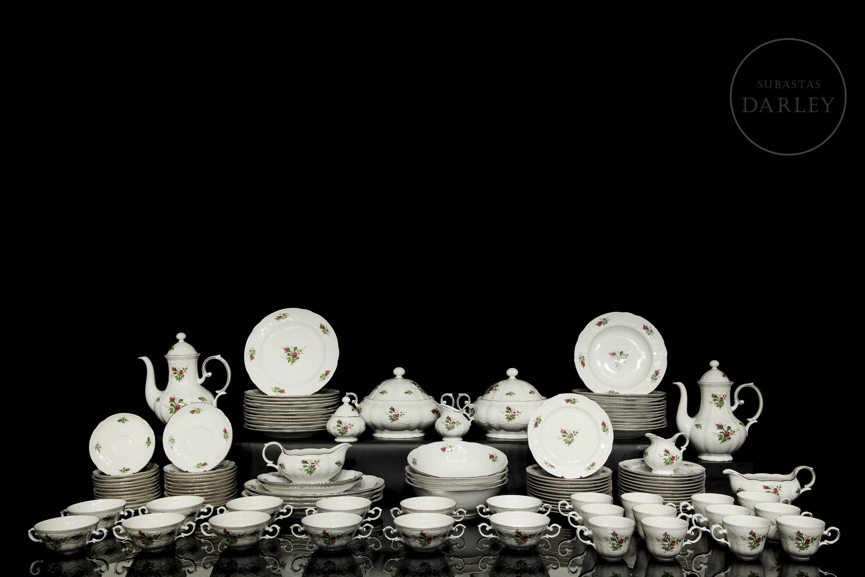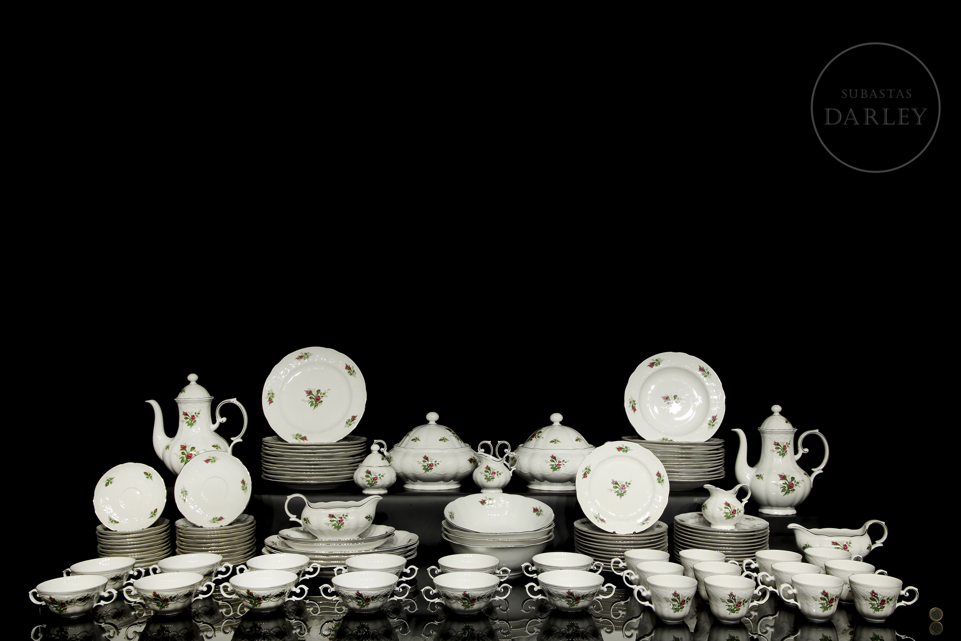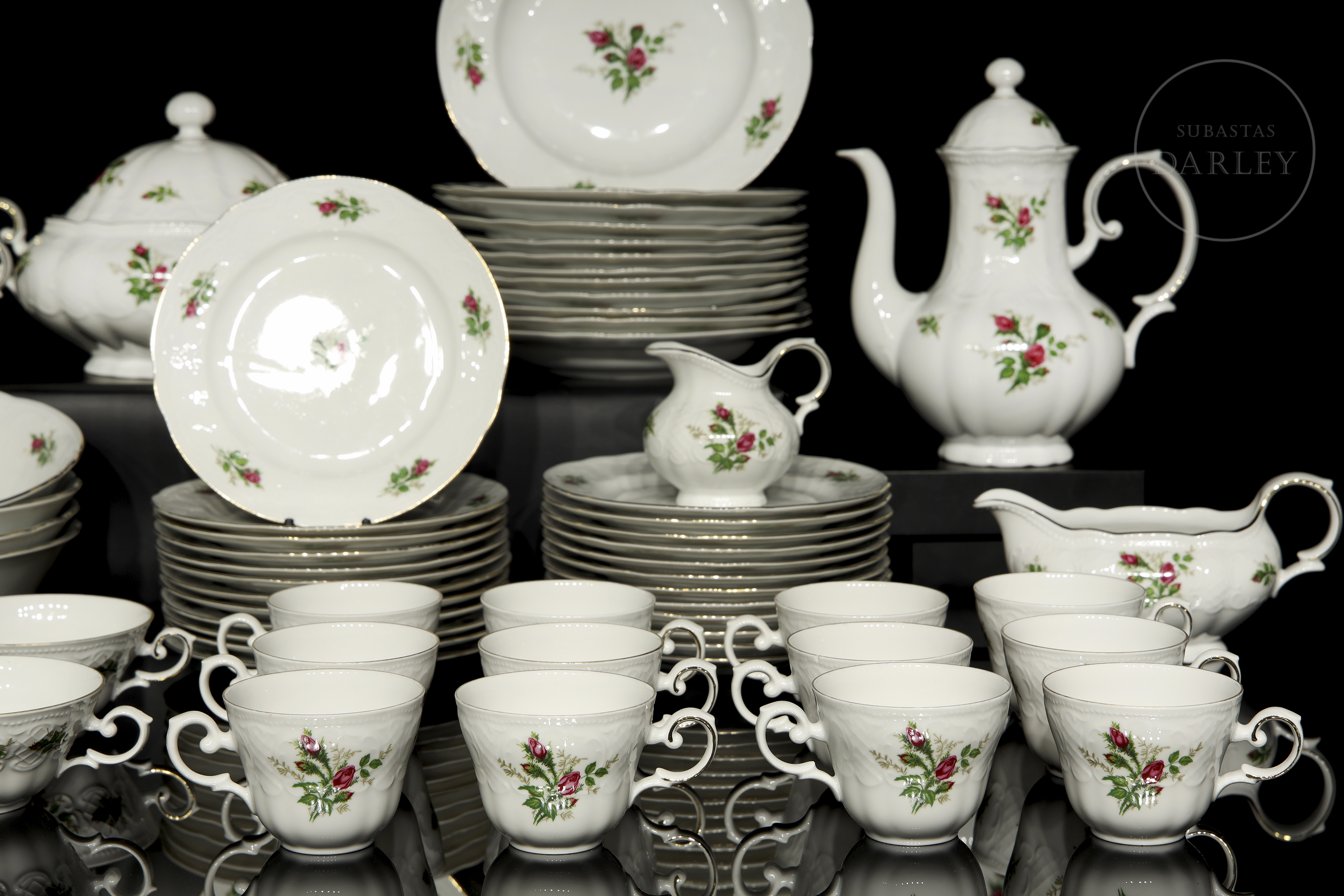 German porcelain set, made of fine white porcelain with polychrome floral bouquet decoration and slightly wavy edges. Includes 114 pieces of tableware and coffee service, with various platters, soup tureens, trays, and sets of plates in different sizes. The Seltmann Weiden company, founded in 1910 in Bavaria, is renowned for its production of high-quality porcelain with classic designs.