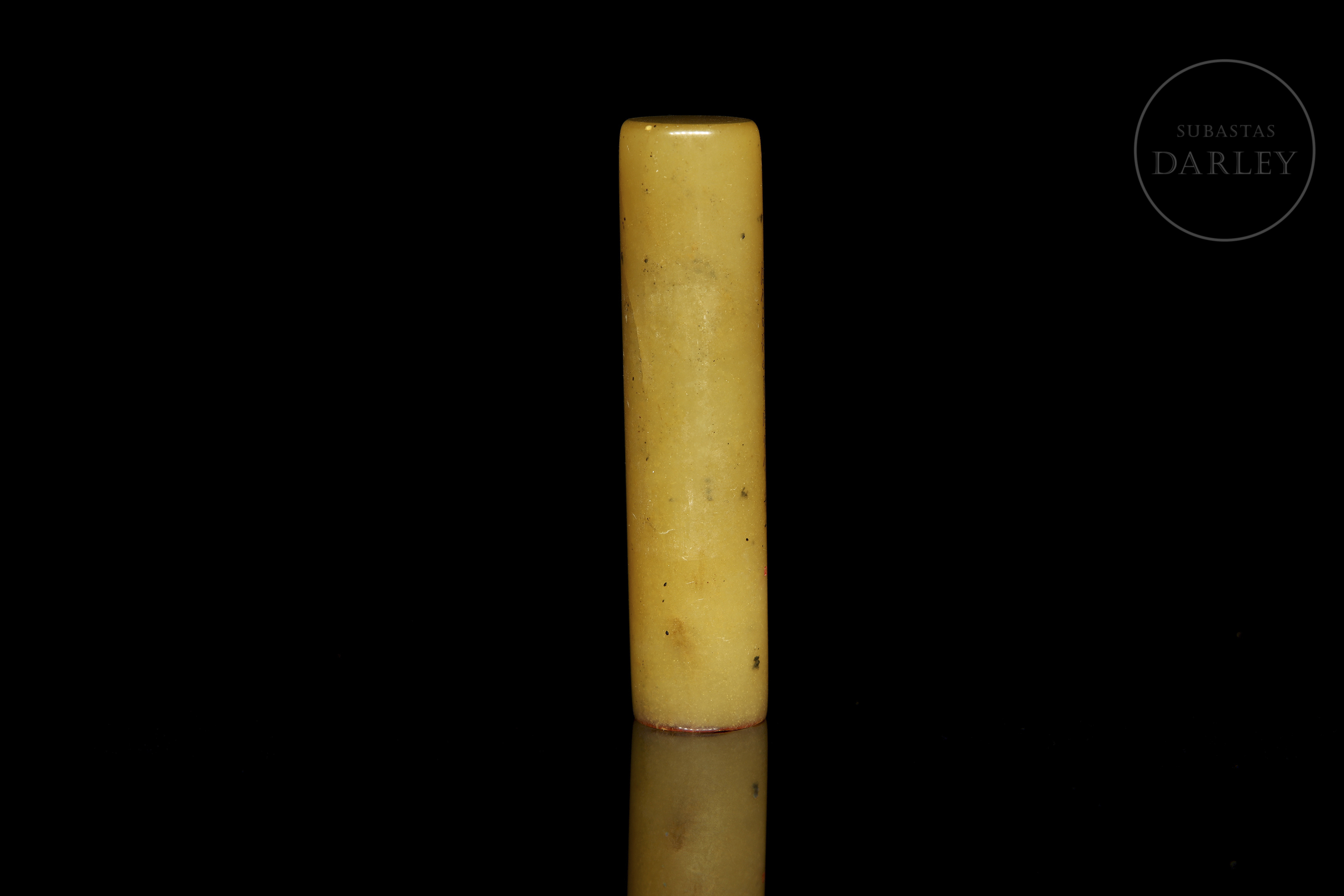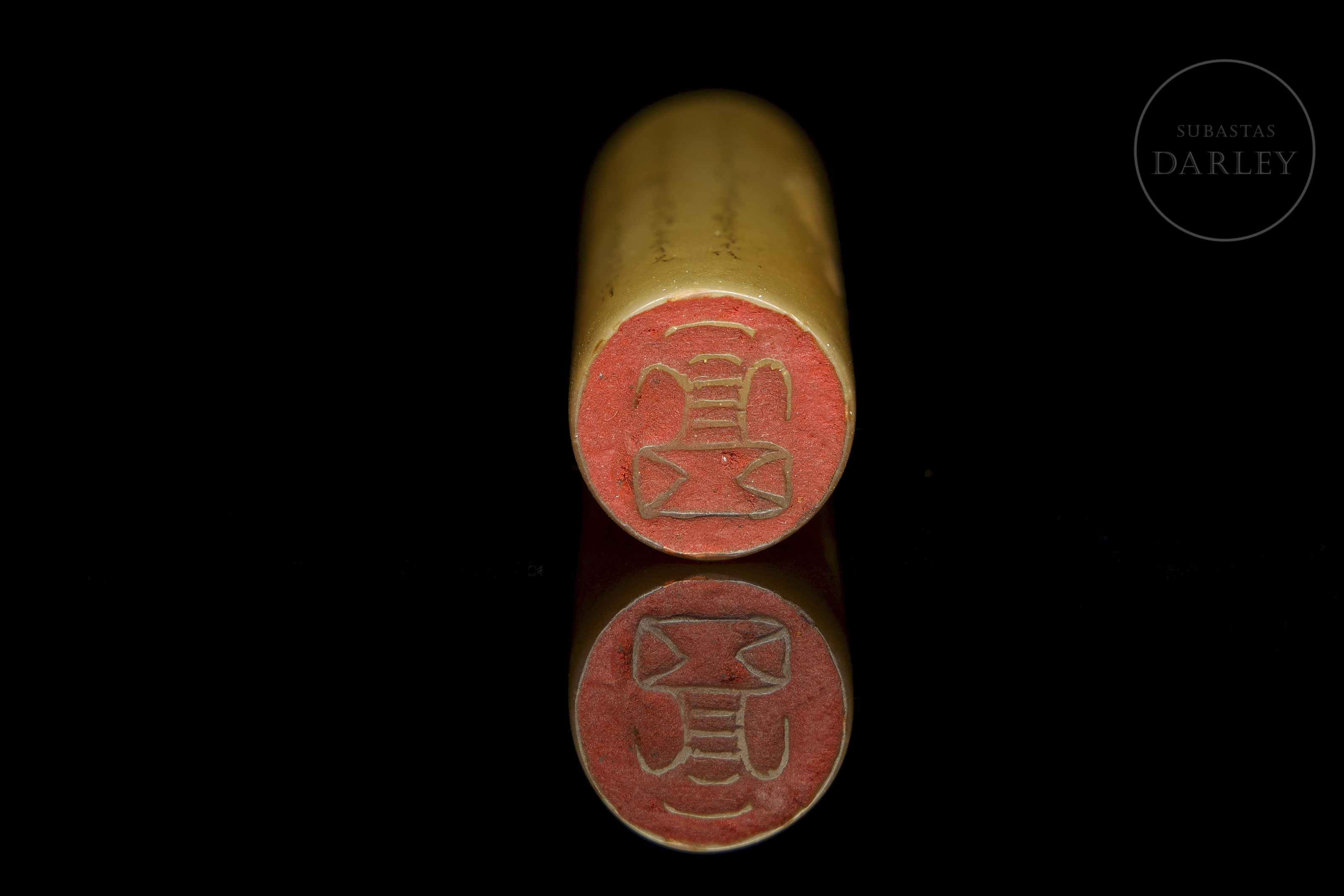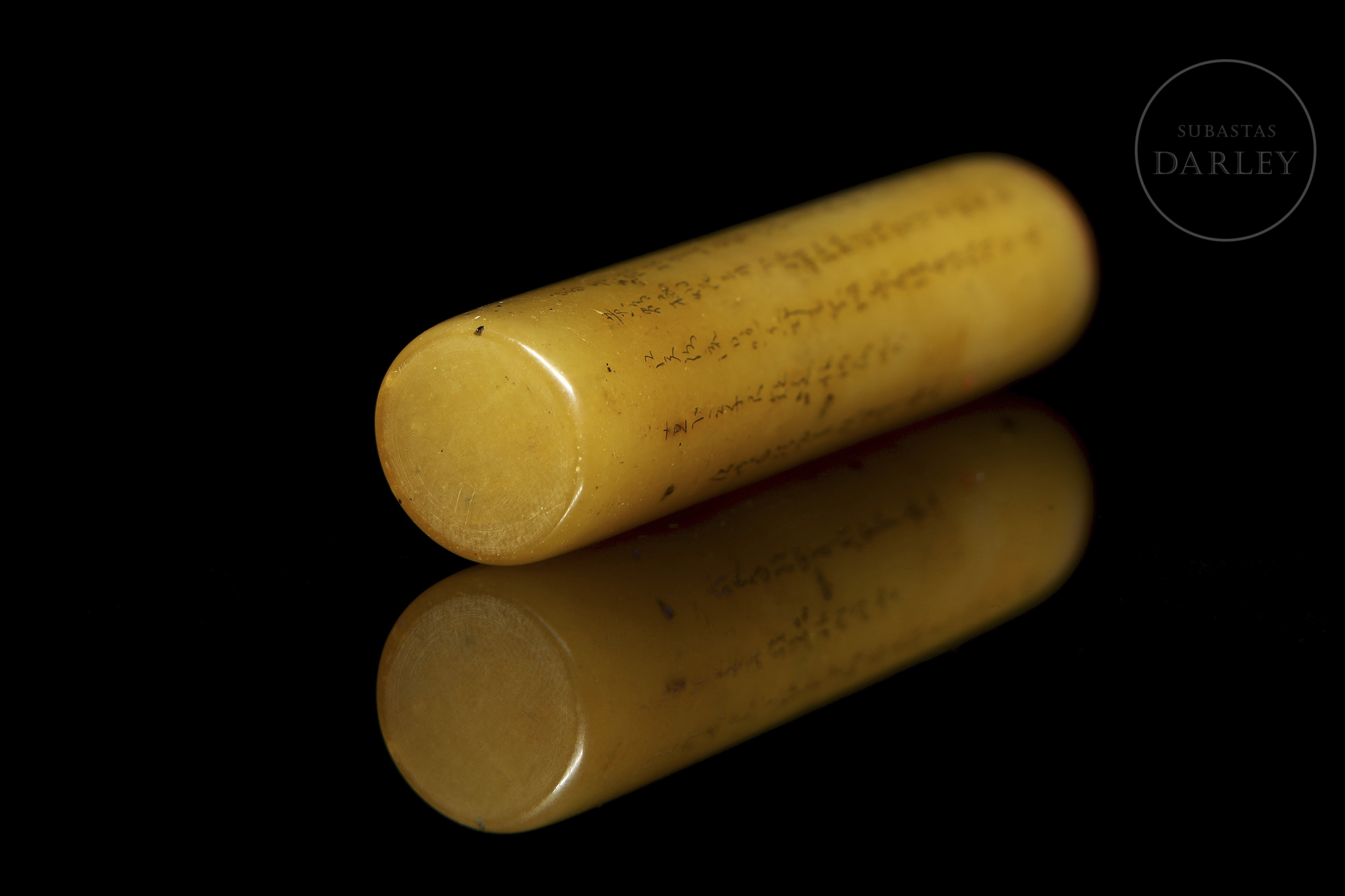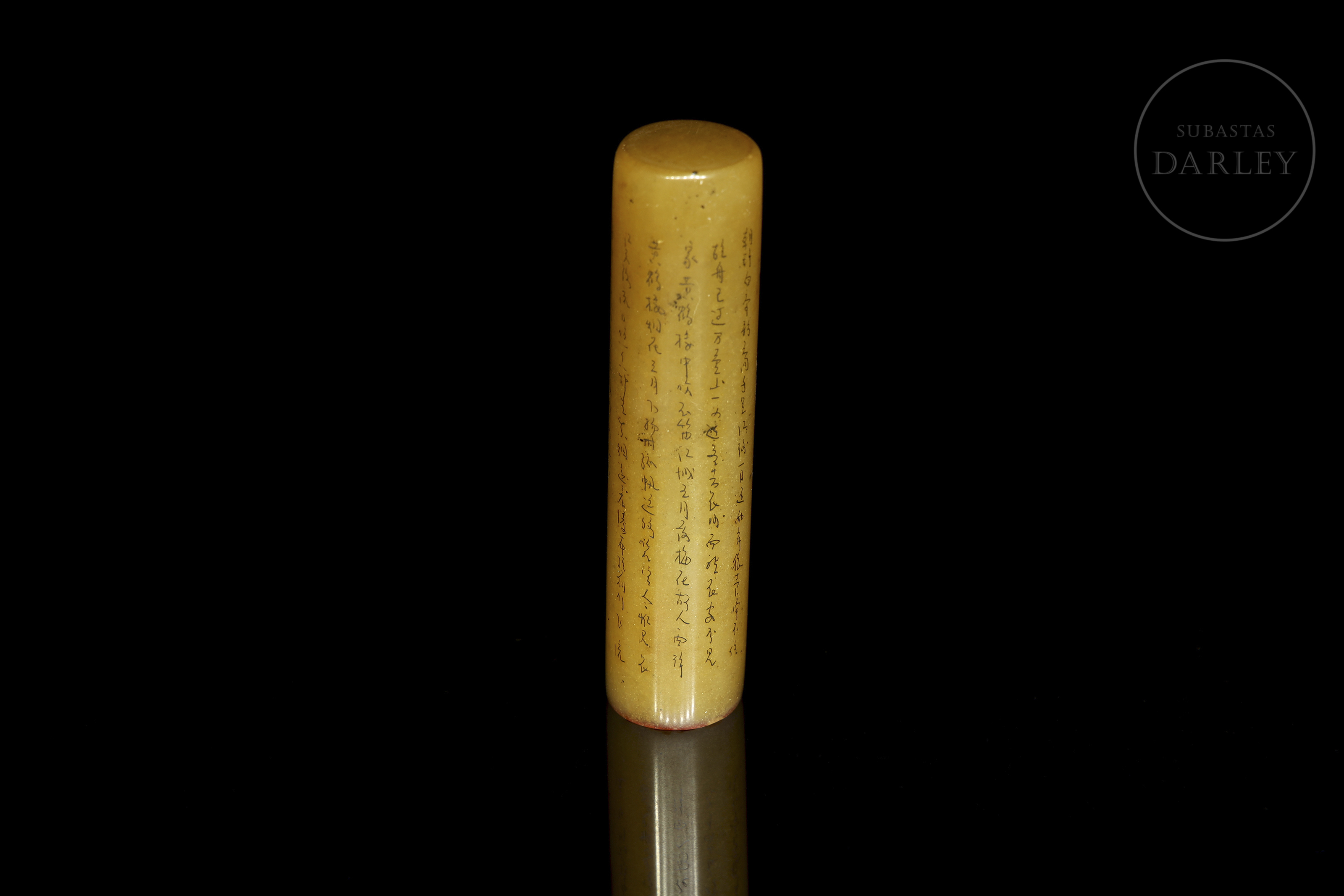 Honey-coloured shoushan stone seal, cylindrical with rounded edges. It features calligraphic inscription arranged vertically along the body. The base shows a seal in relief with traces of red wax. It has a natural patina due to its age.
