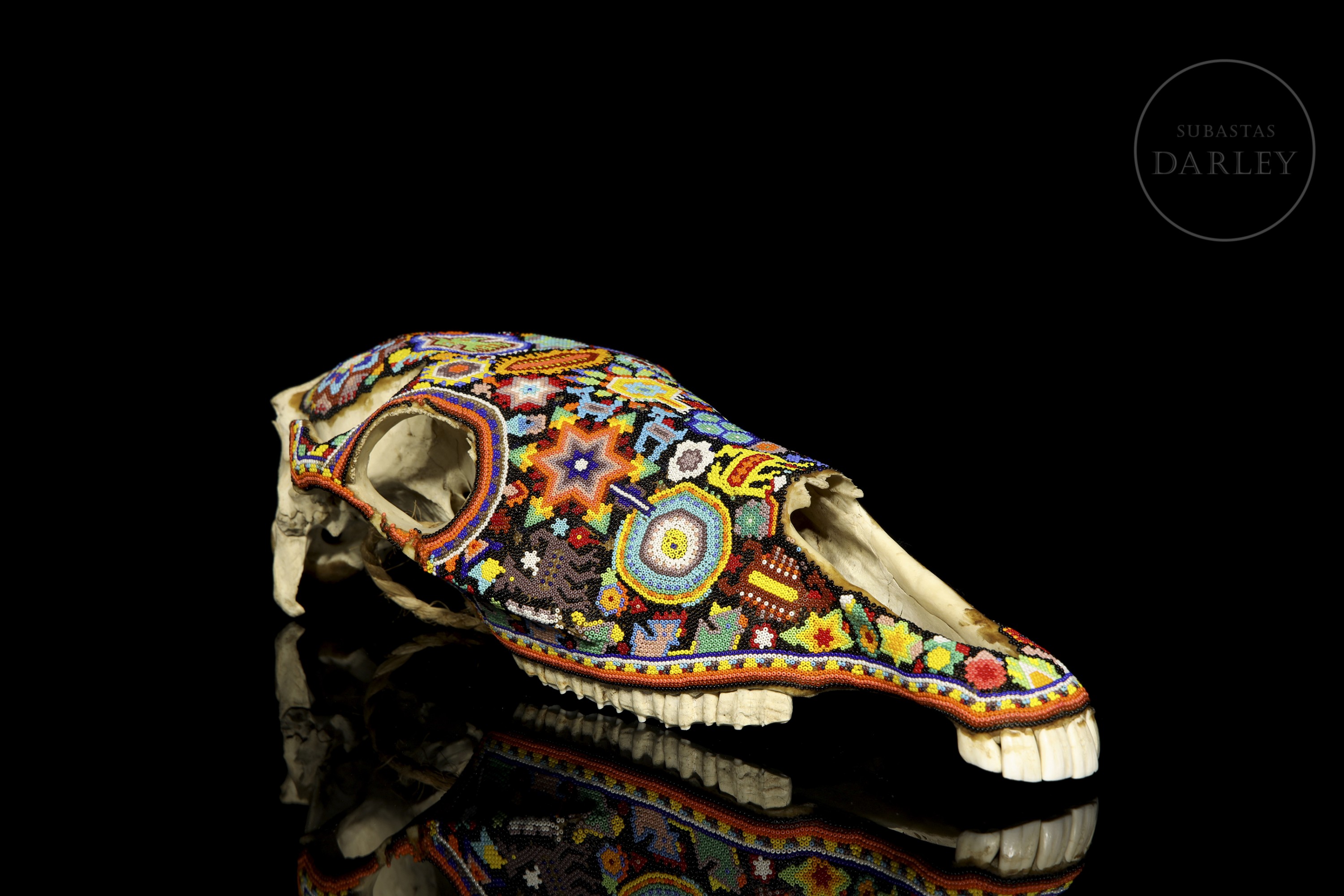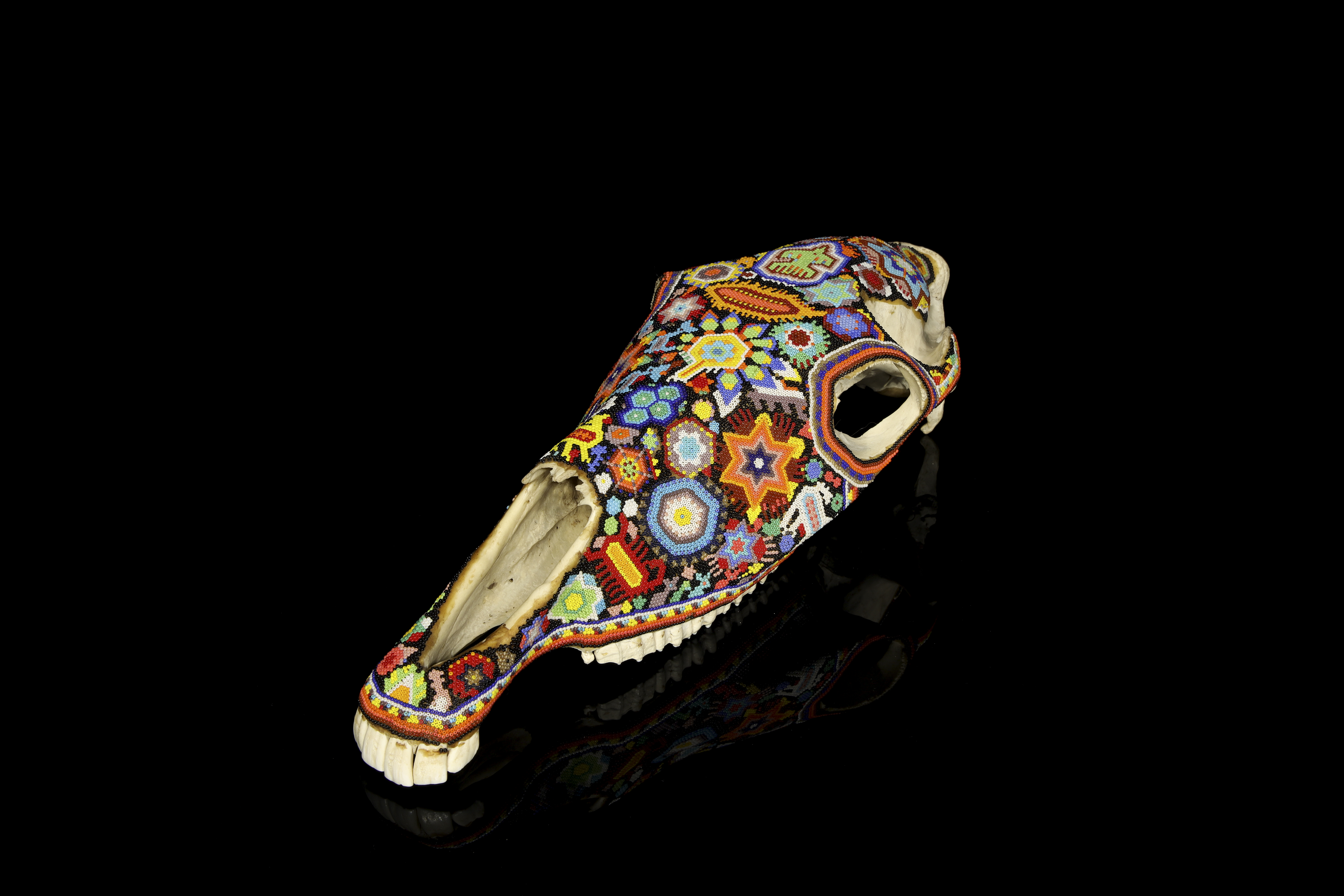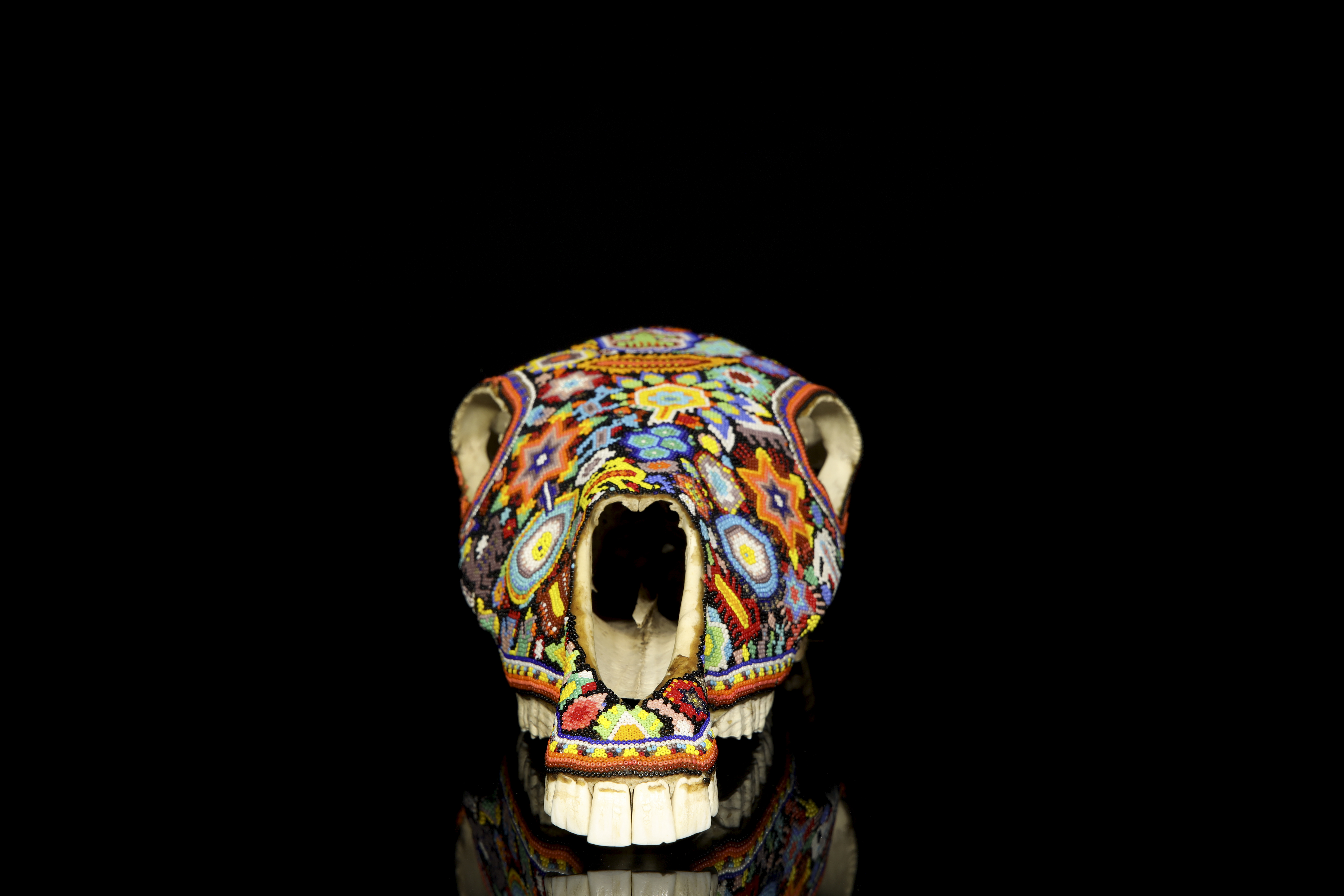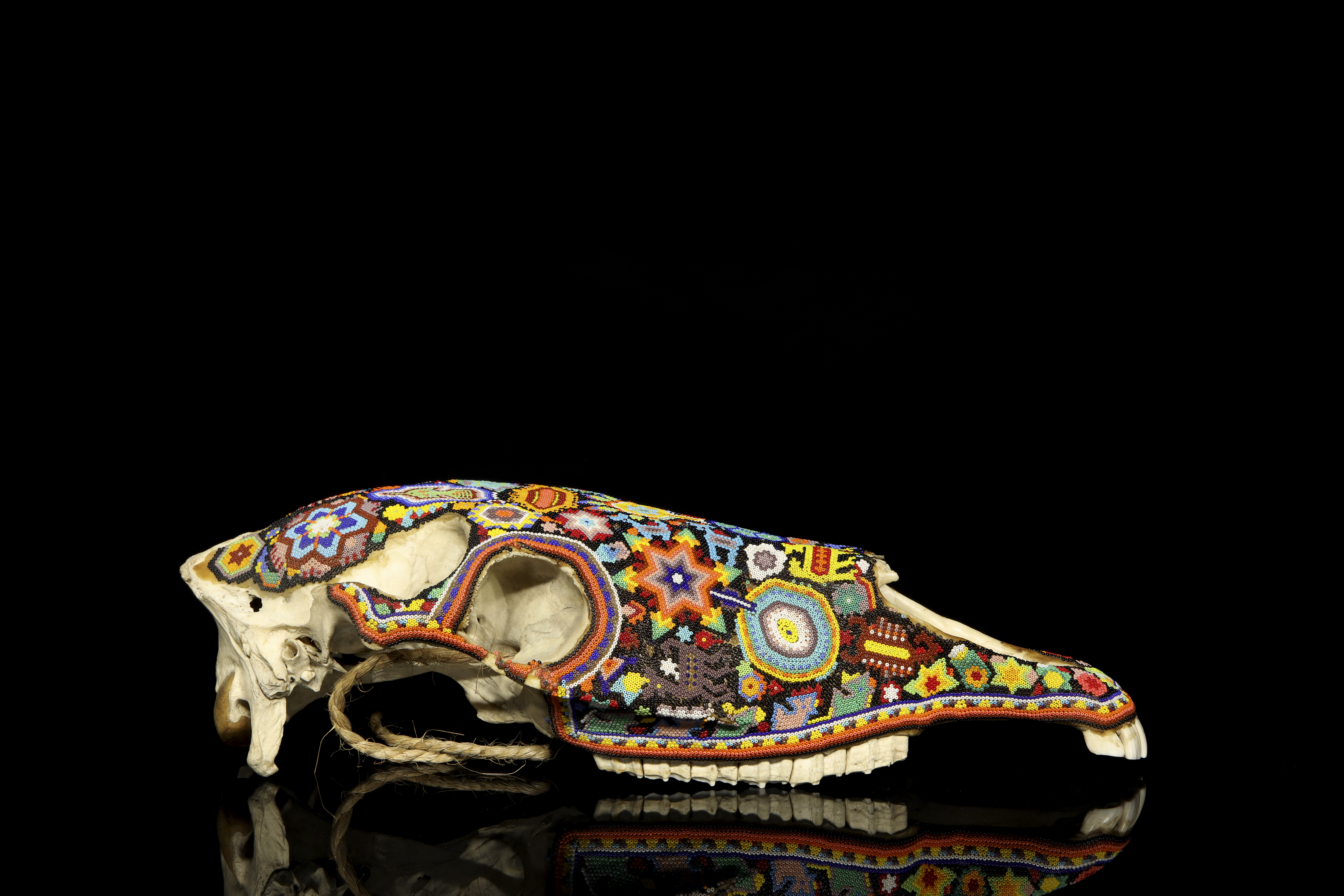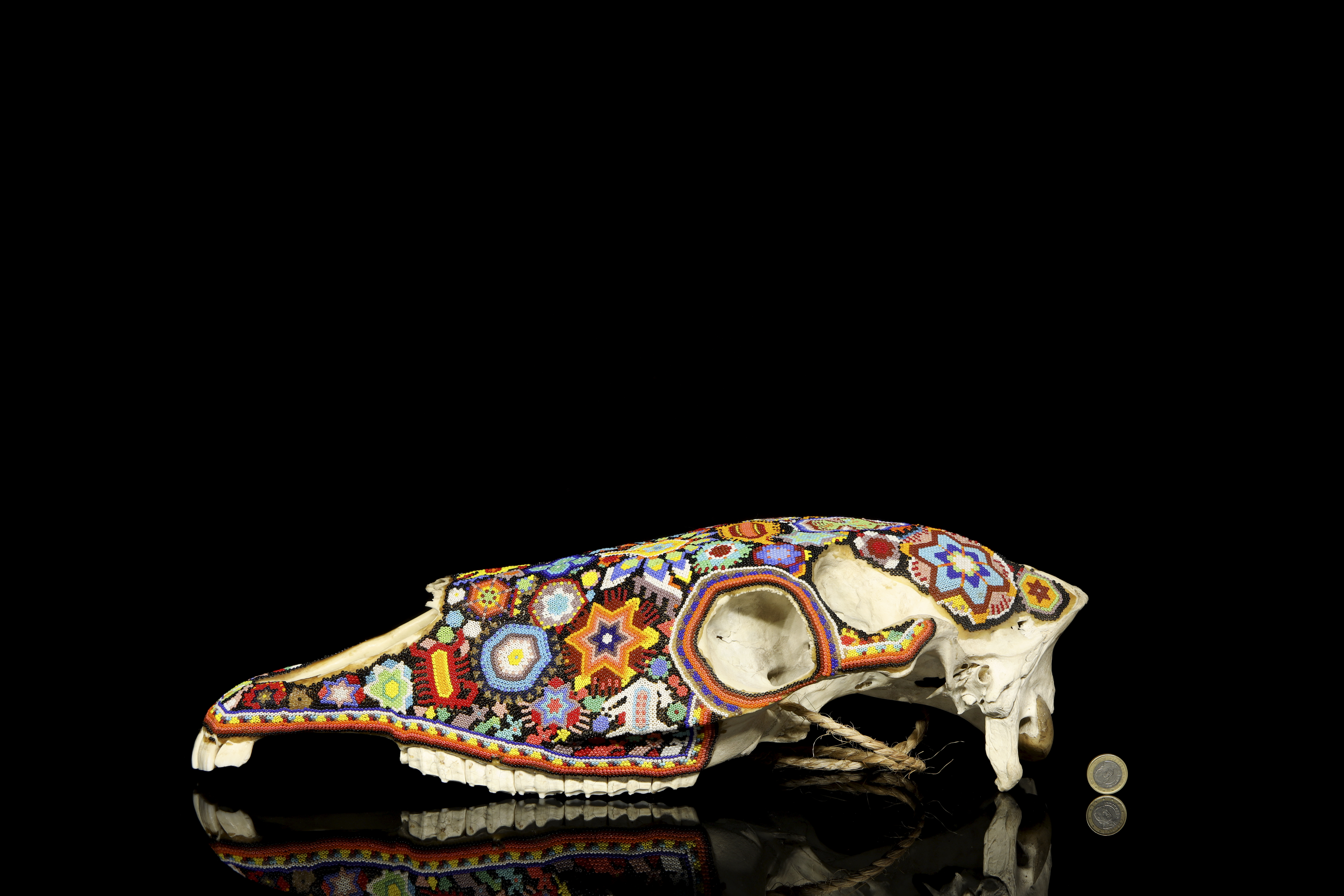 A work of craftsmanship confirmed by a horse skull, whose surface has been decorated using the traditional technique of the Huichol (Wixárika) people of Mexico. Thousands of small, brightly coloured beads are applied one by one to create complex symbolic and geometric patterns.