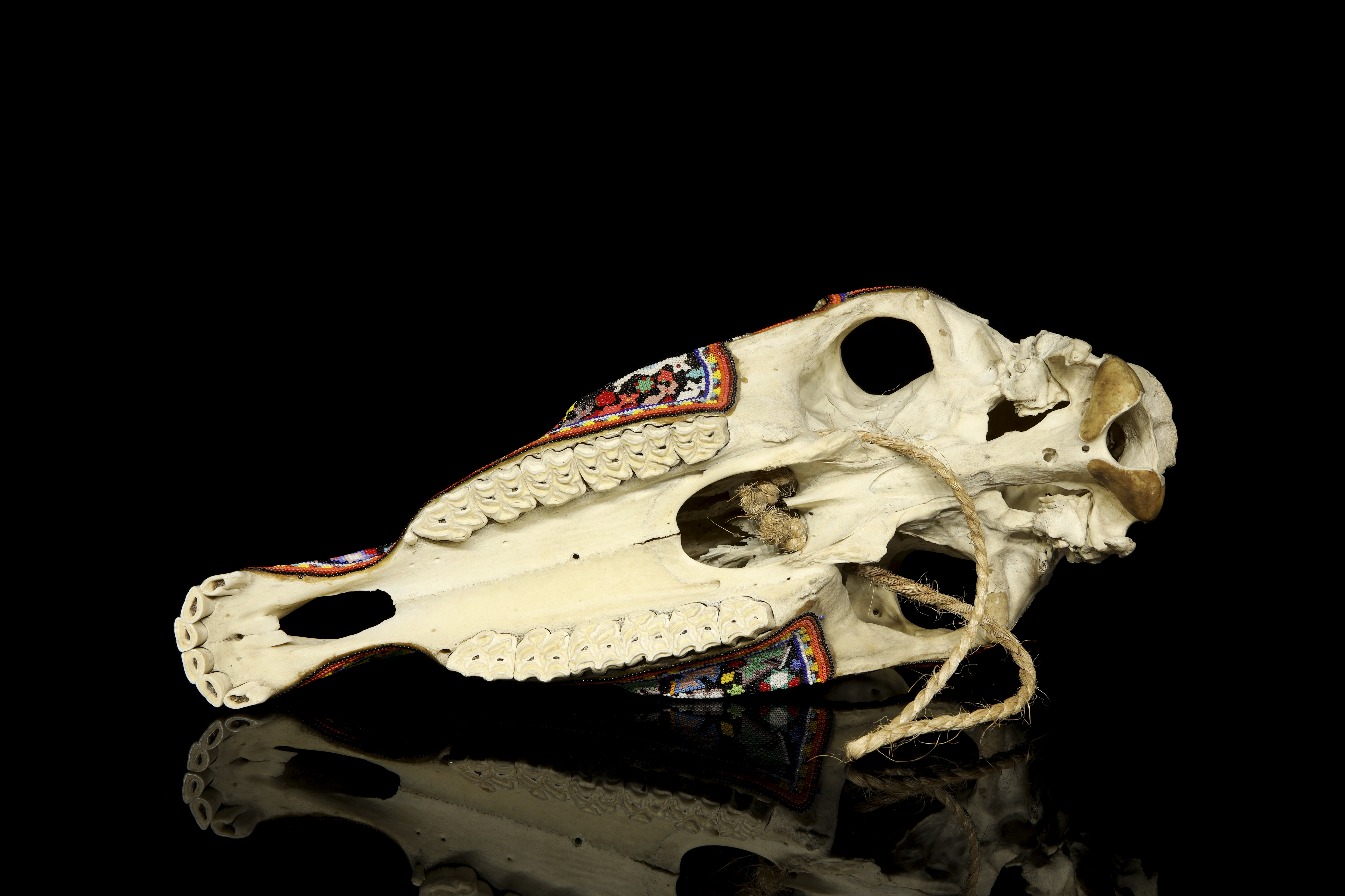 Skull decorated with beads, Huichol culture, Mexico, 20th century