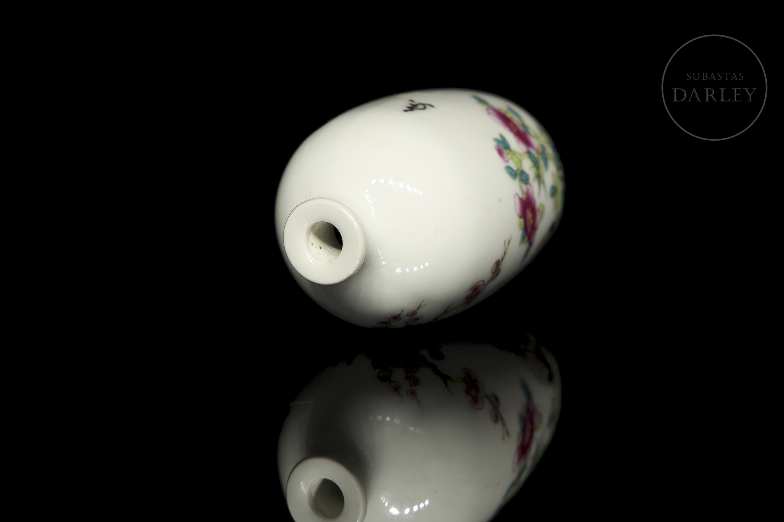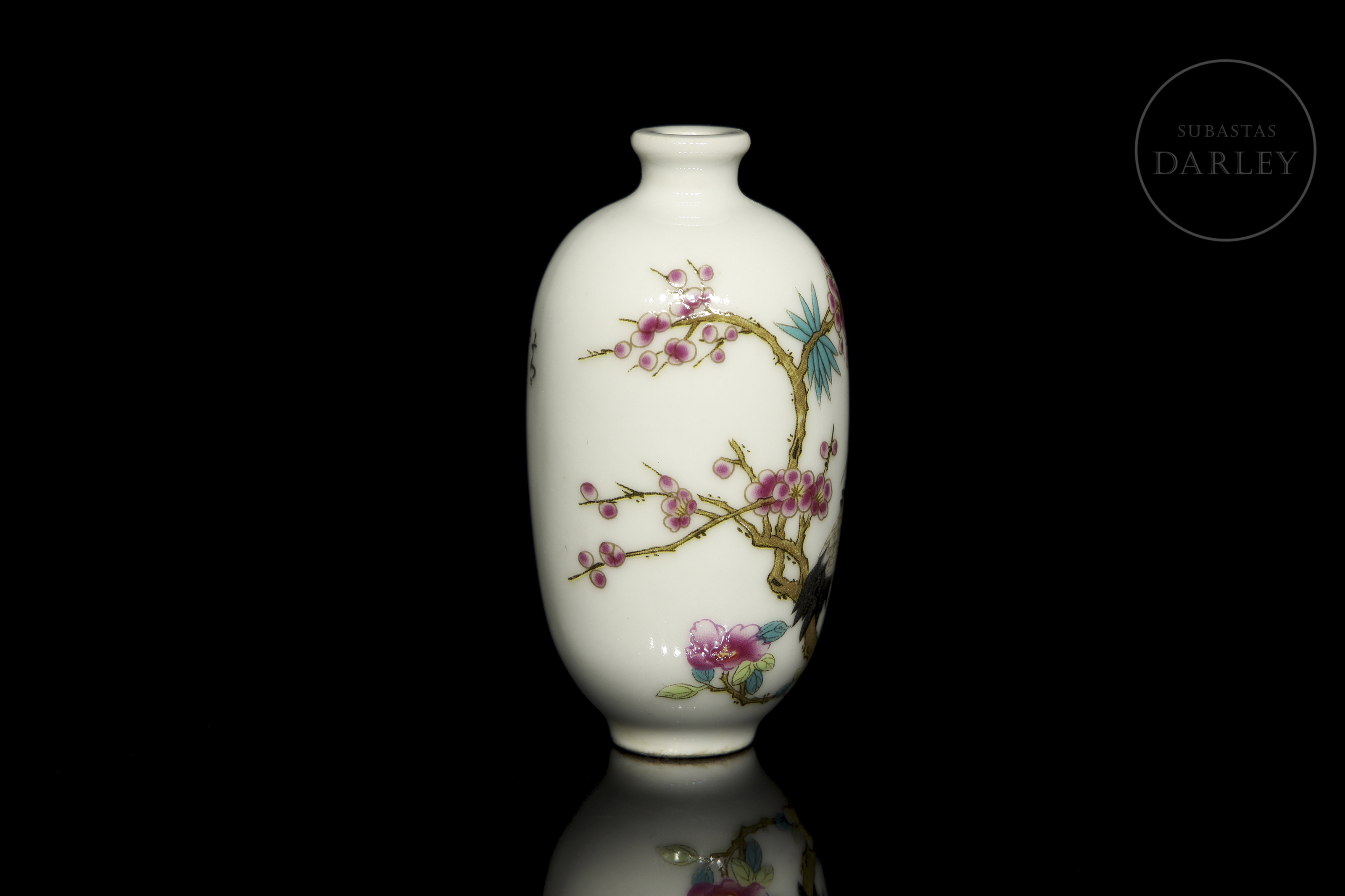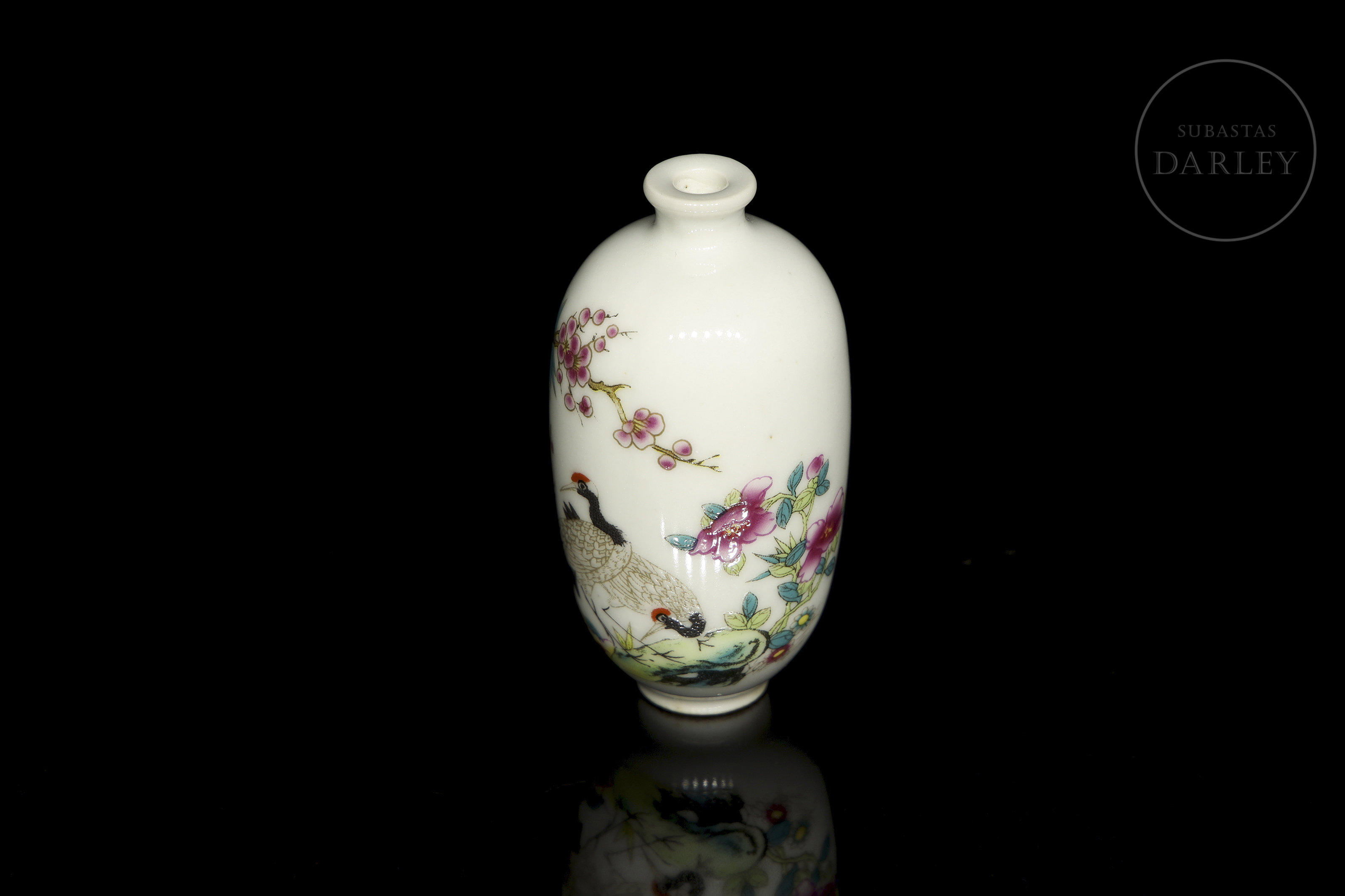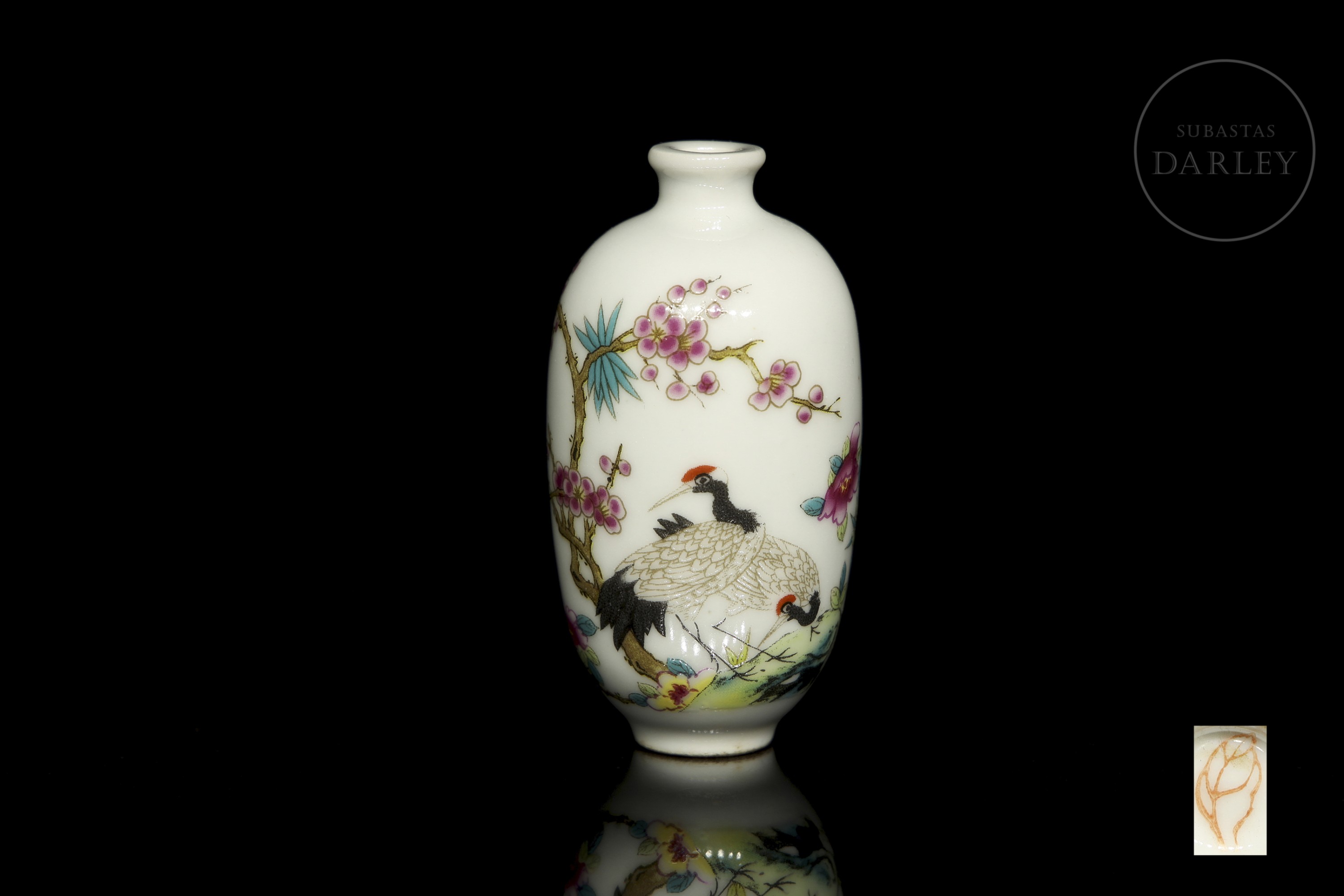 Small ovoid porcelain bottle with a short neck. It features a scene painted in polychrome enamel depicting cranes under a plum blossom tree, with peonies, bamboo and other plants. On the reverse side are two calligraphic characters. The base bears a red underglaze mark.
