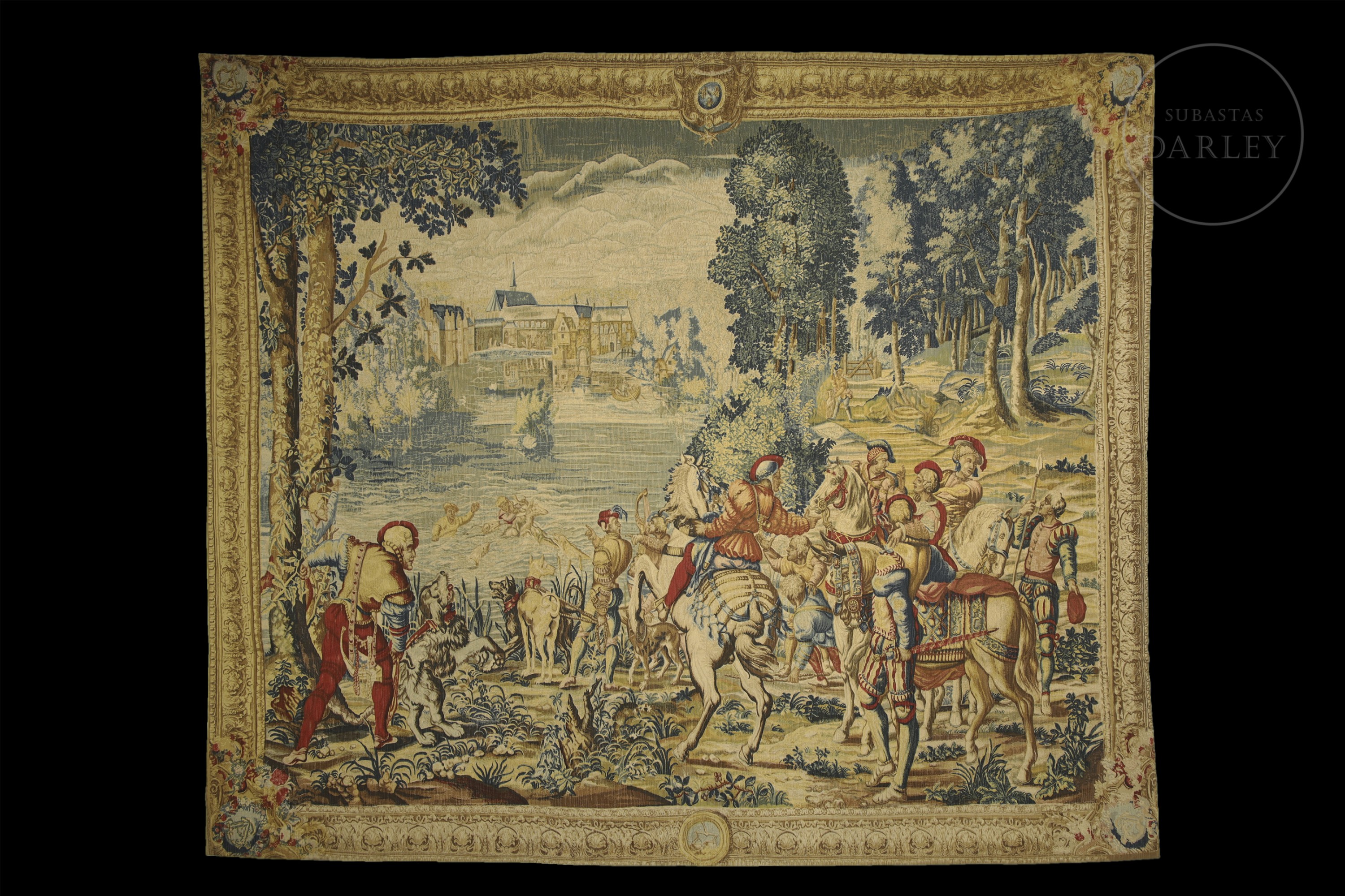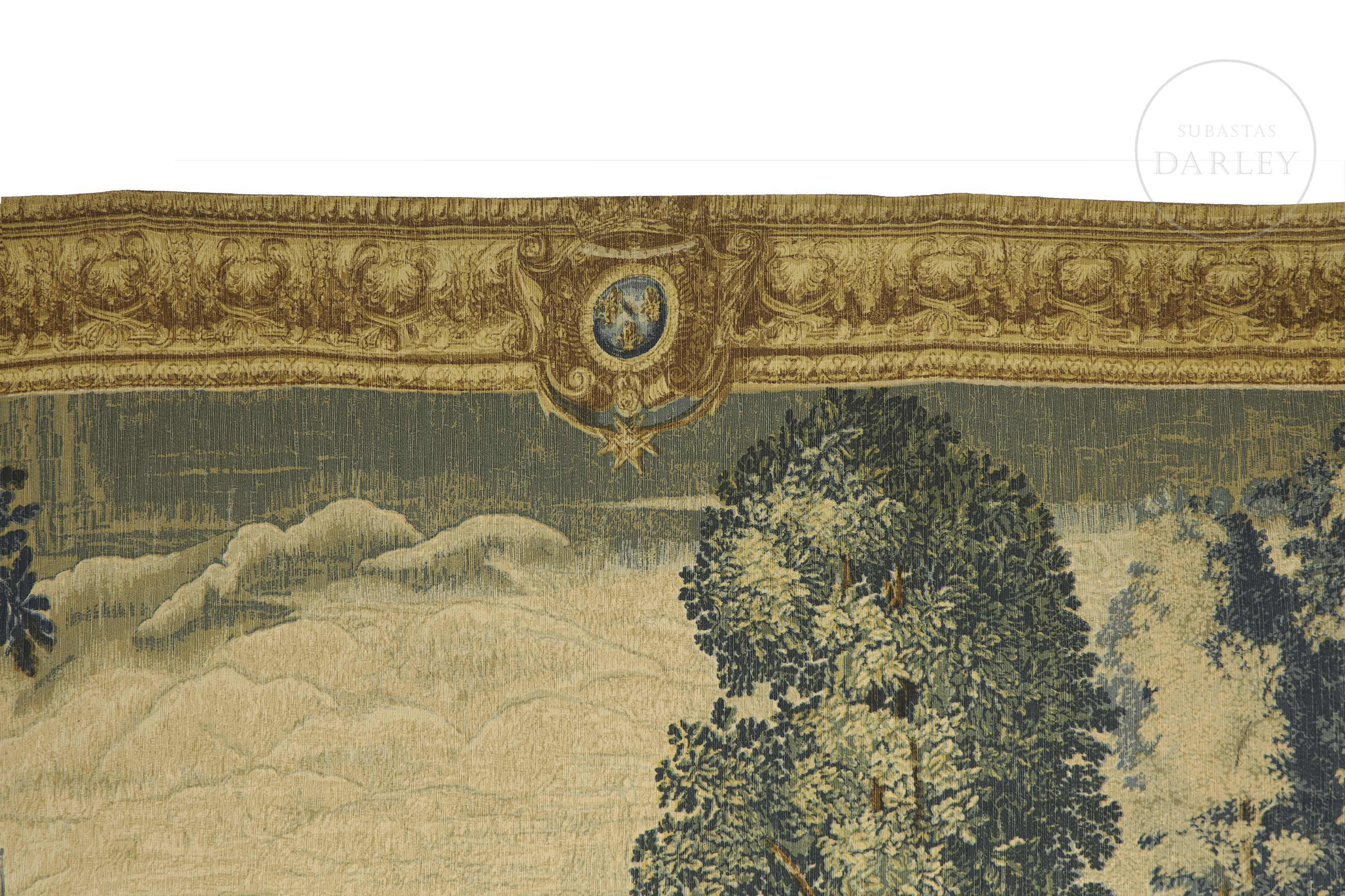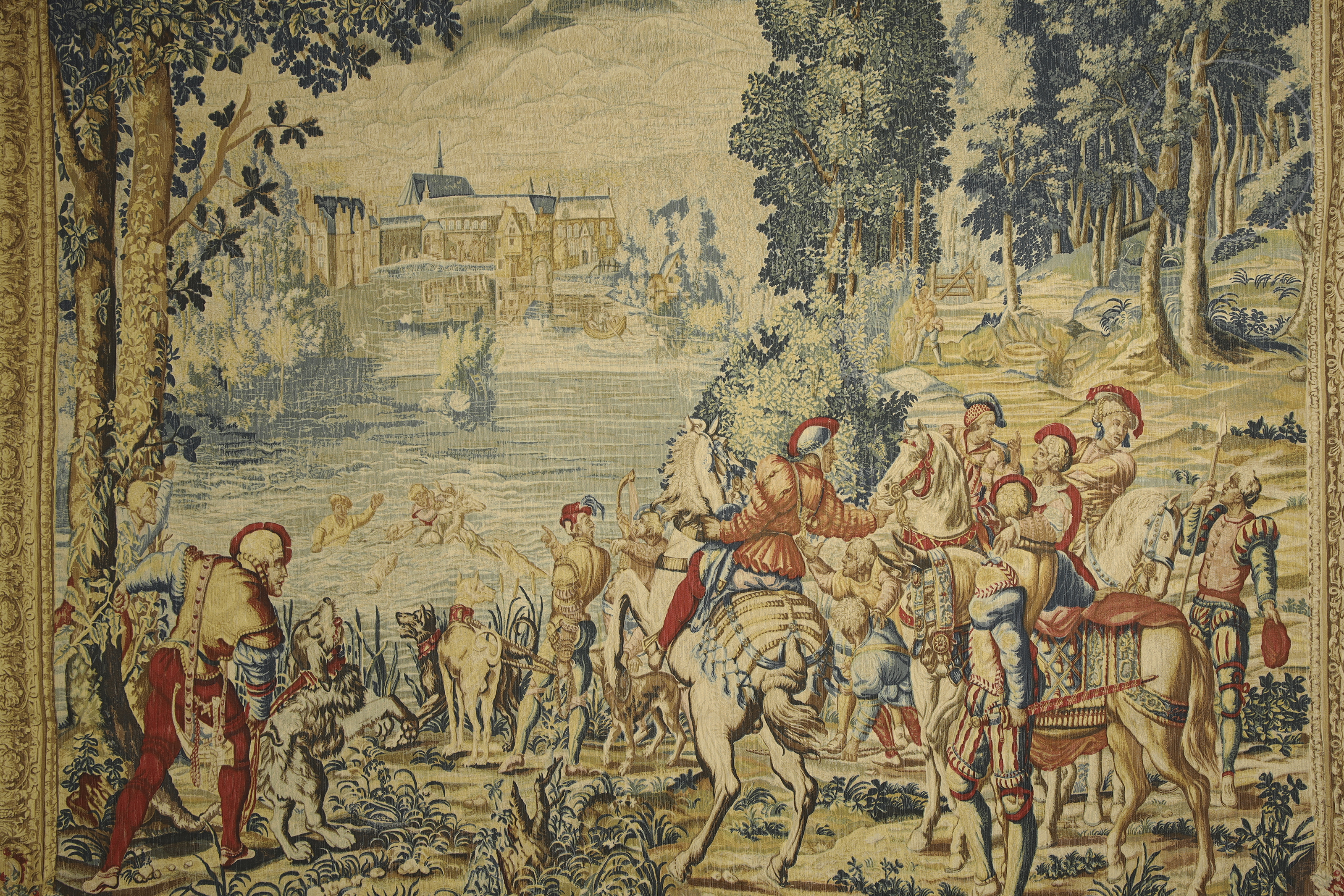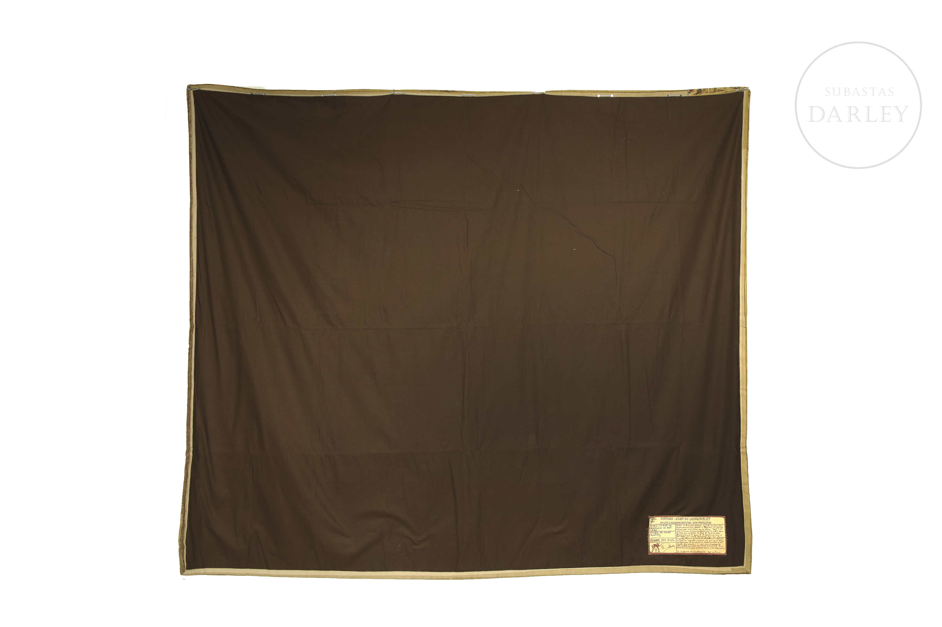 French tapestry, made of linen, wool, cotton and other materials, representing a large hunting scene. It is a later reproduction of the homonymous piece made in the 17th century and exhibited in the museum of the Count of Chantilly. With descriptive label on the back.