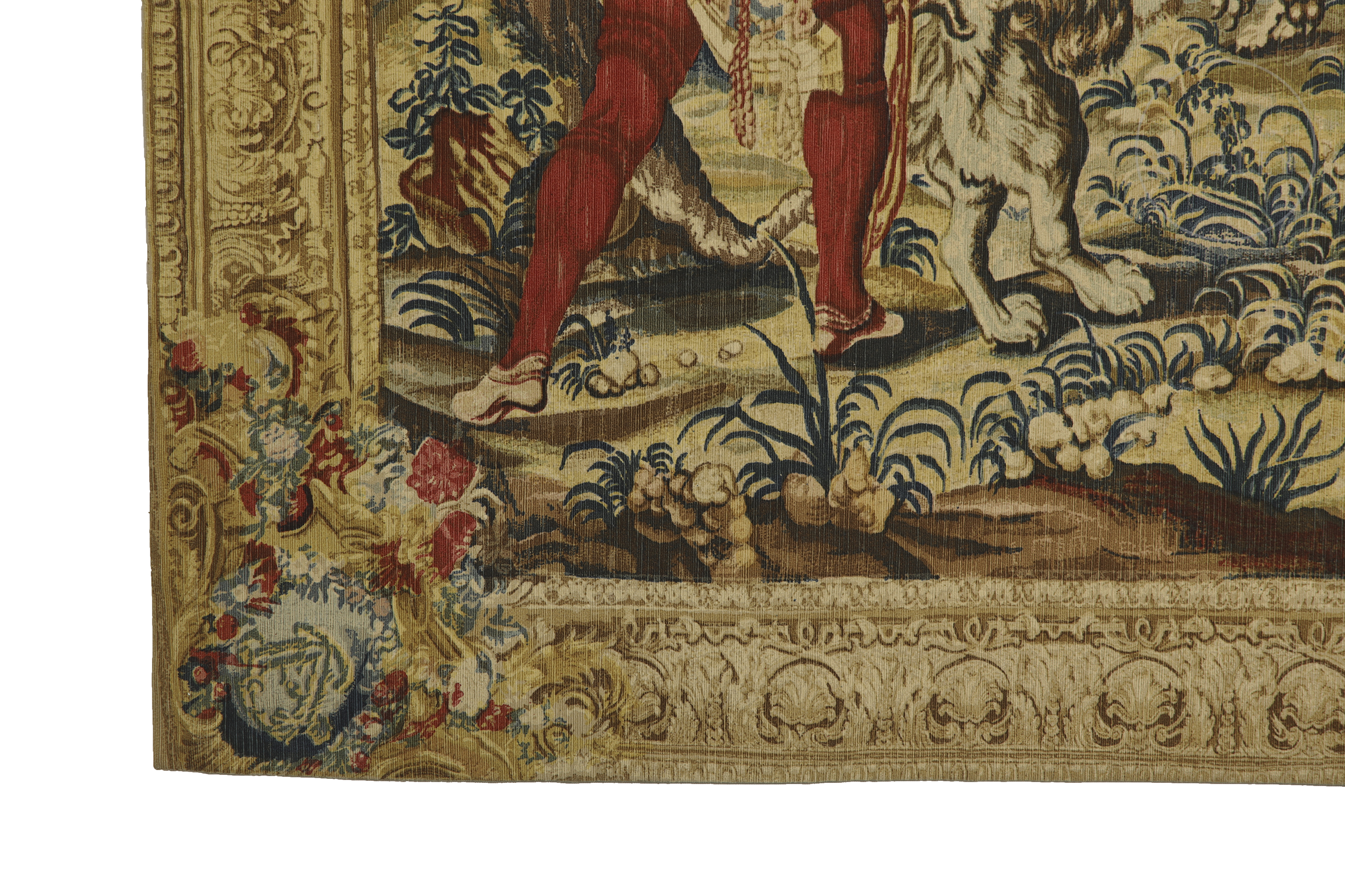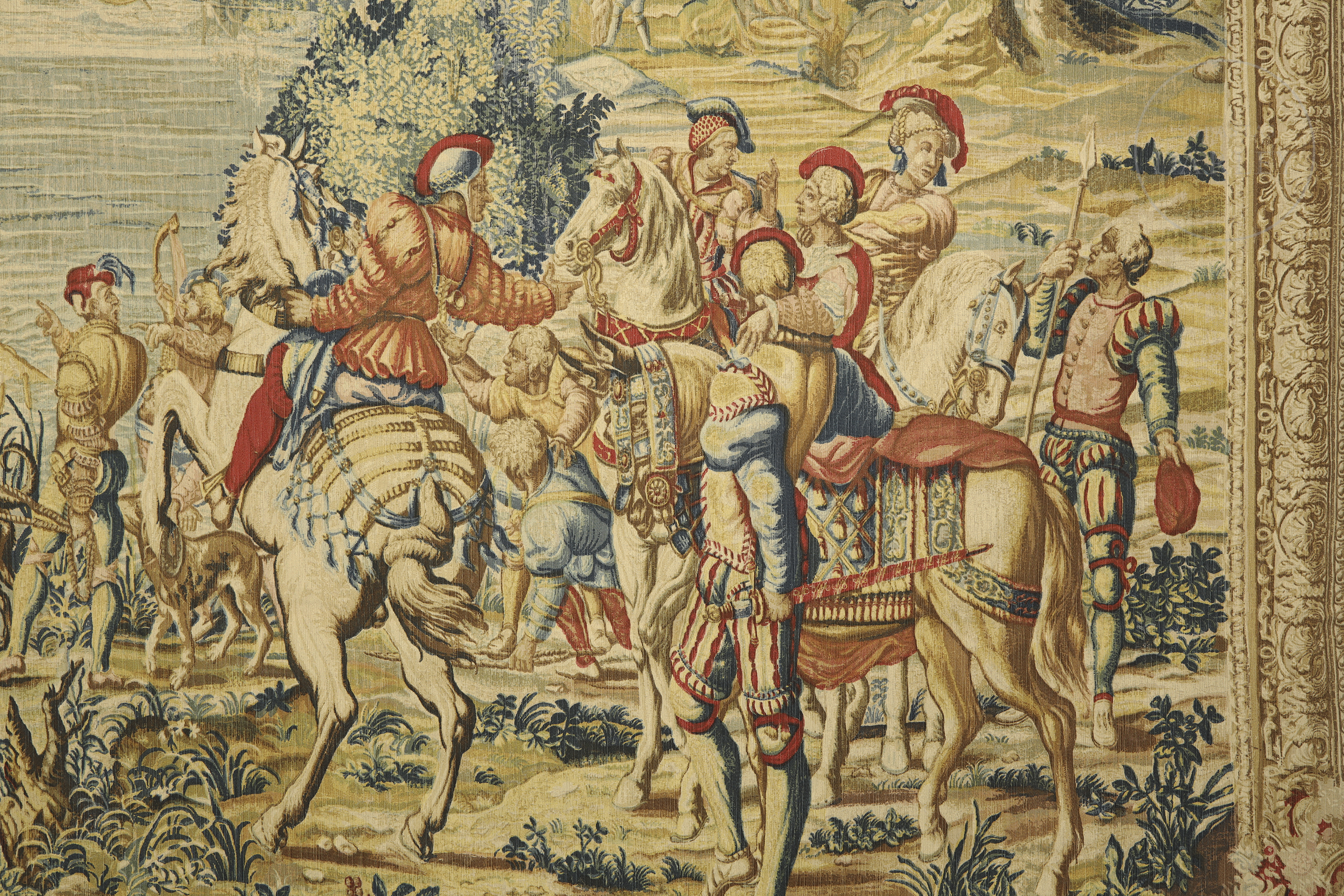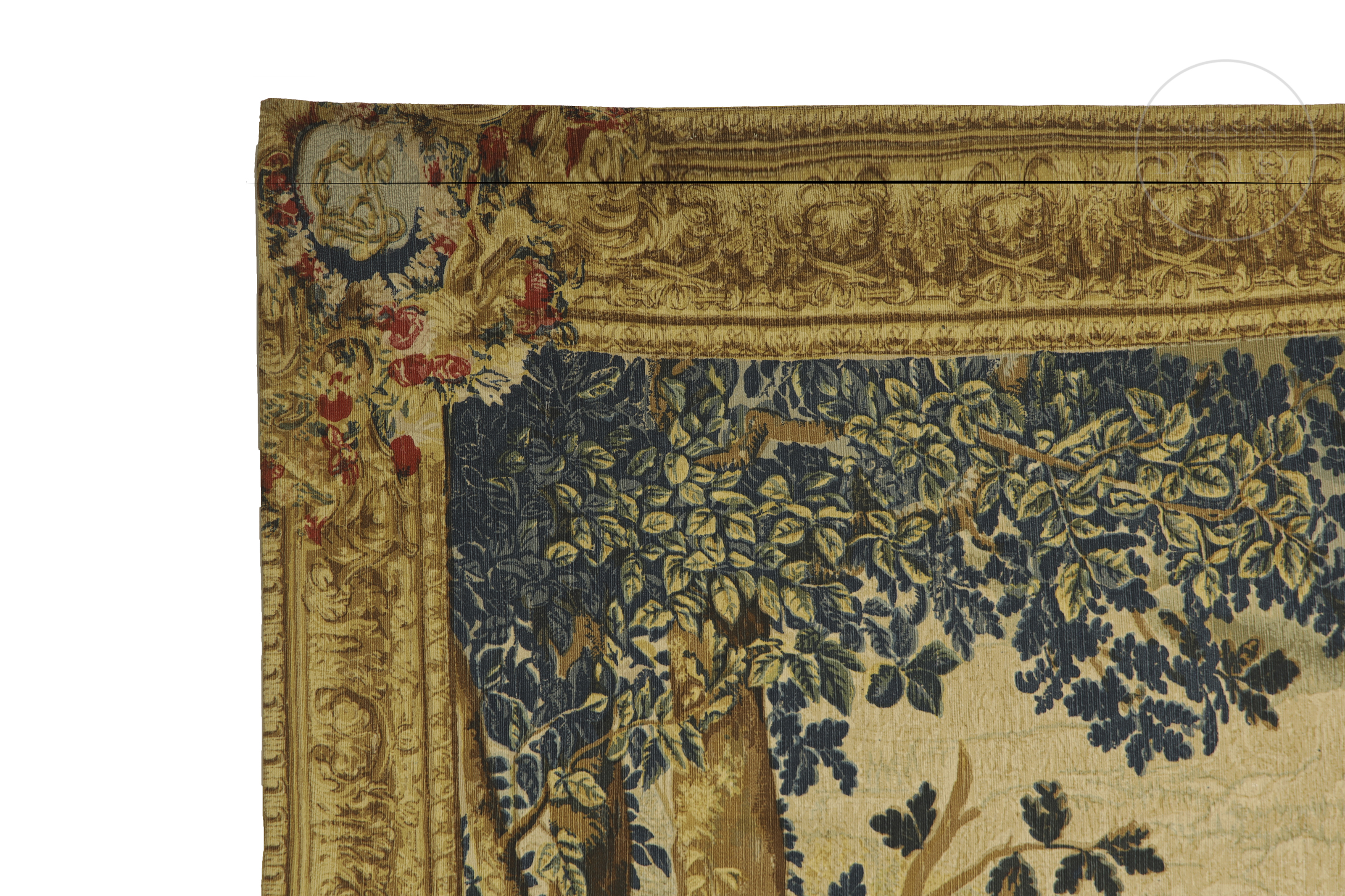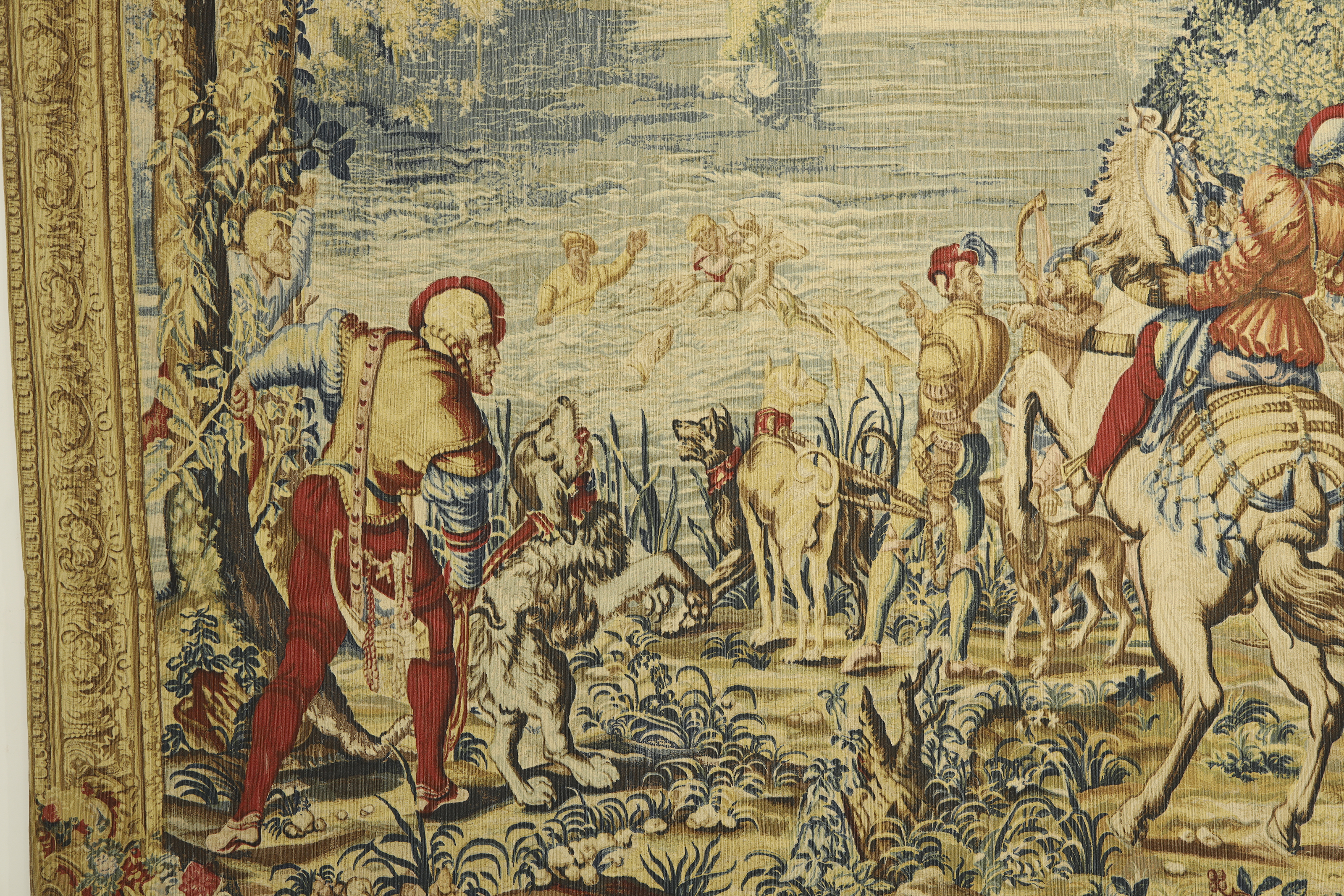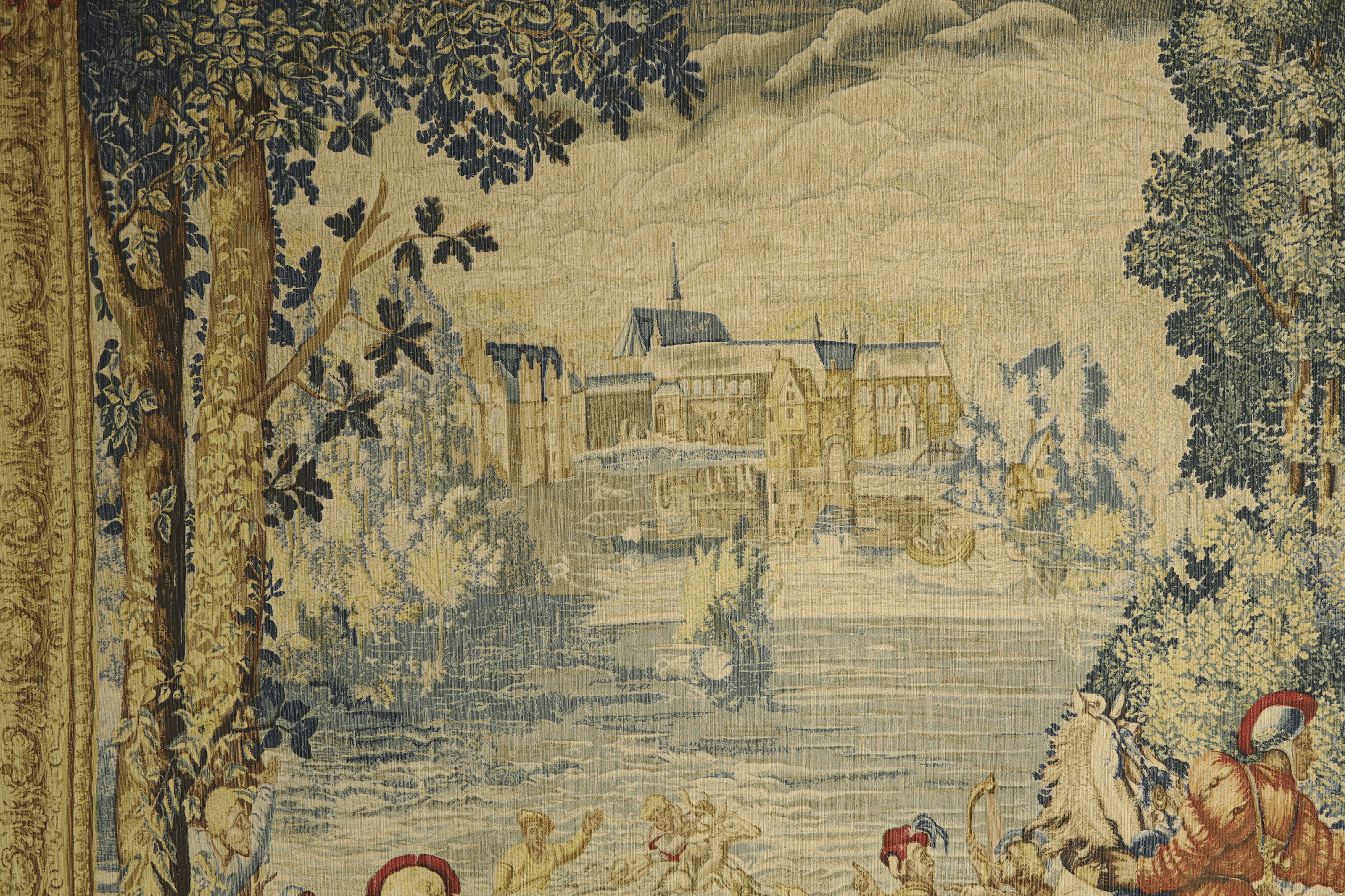 French tapestry, made of linen, wool, cotton and other materials, representing a large hunting scene. It is a later reproduction of the homonymous piece made in the 17th century and exhibited in the museum of the Count of Chantilly. With descriptive label on the back.