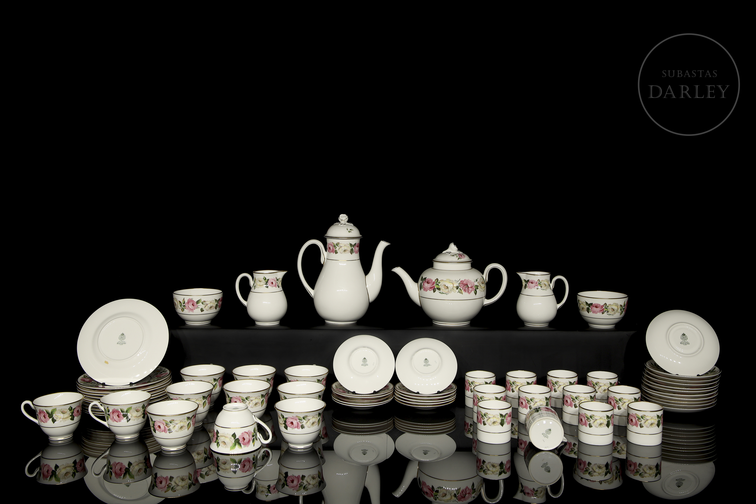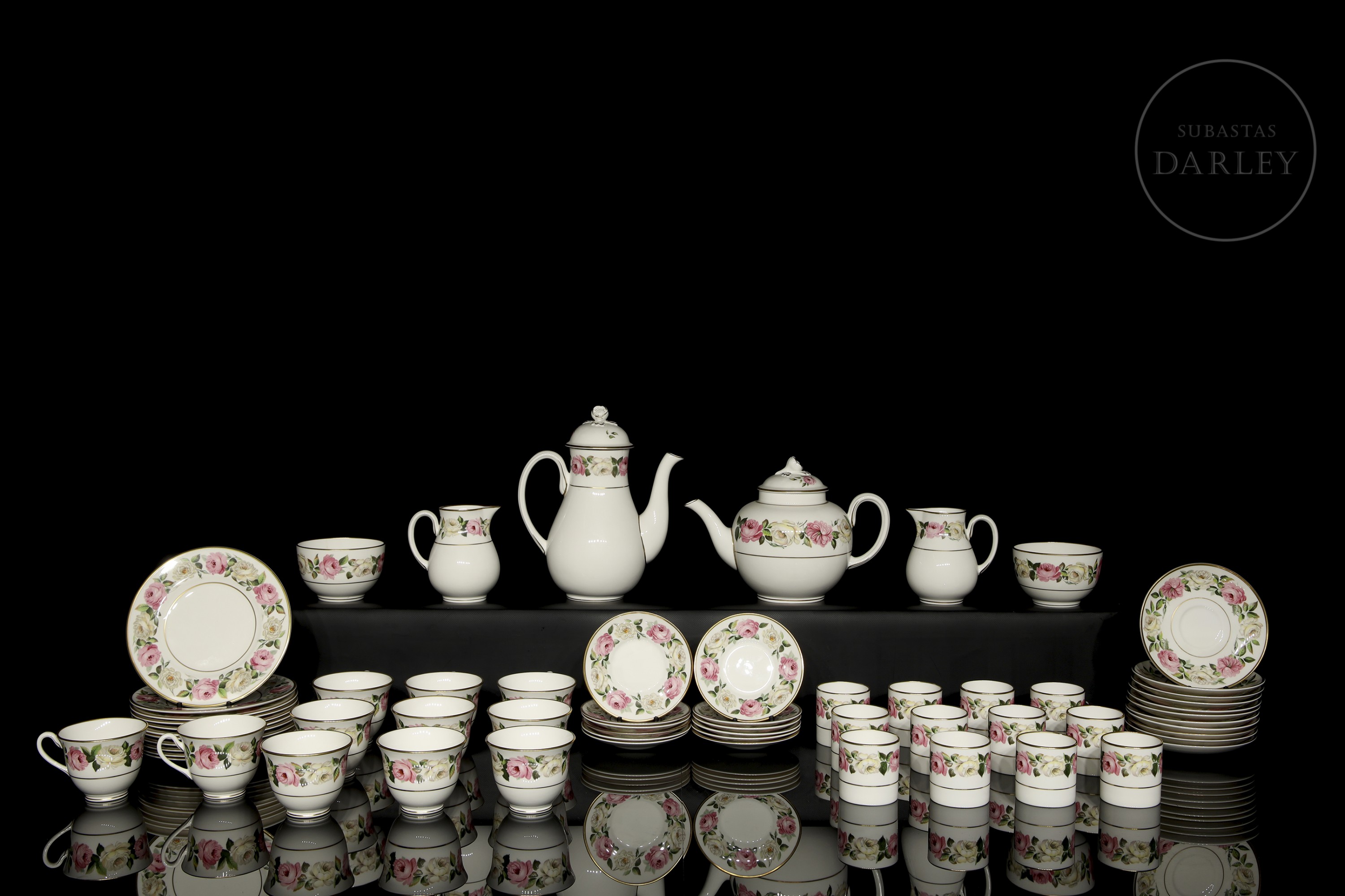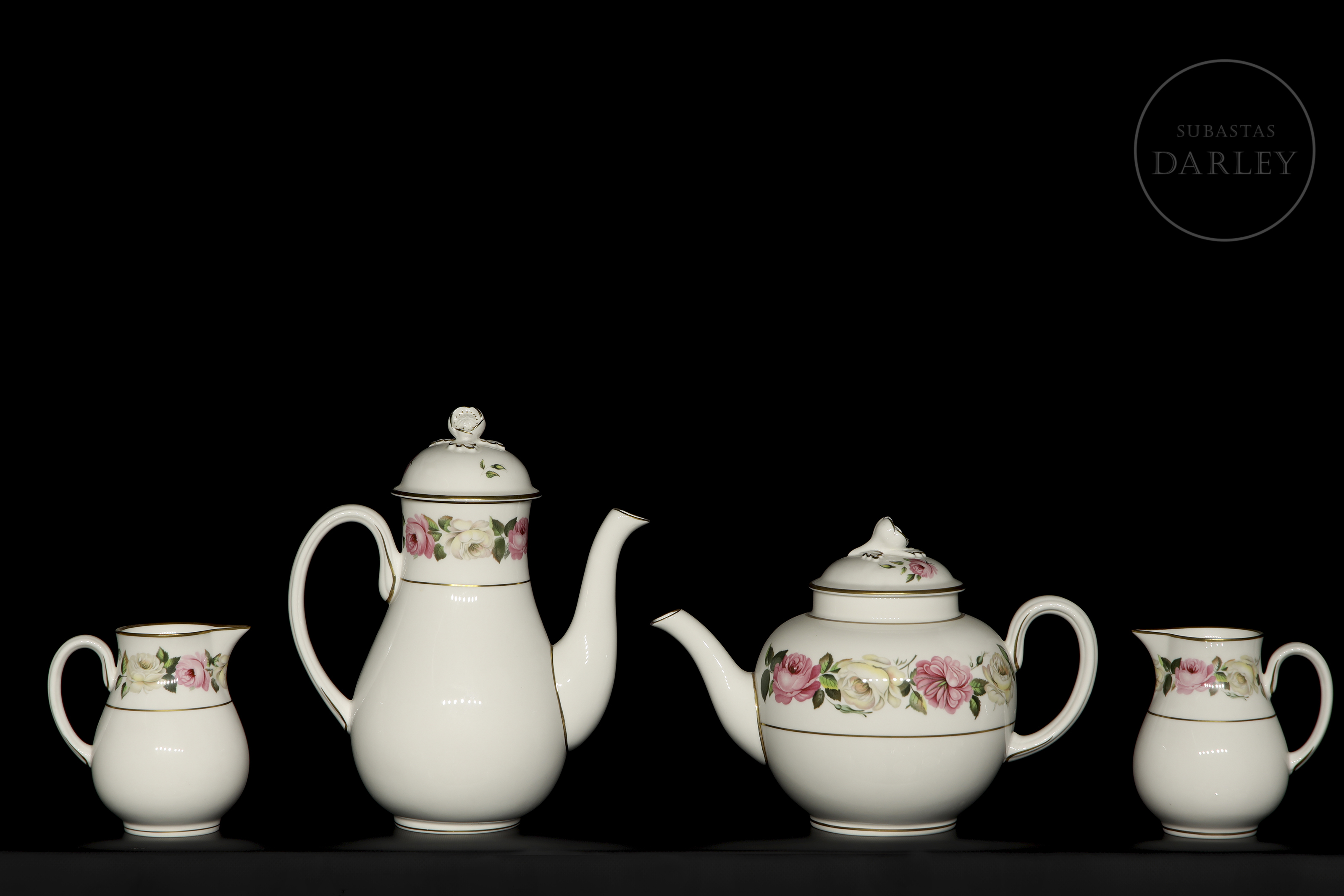 Porcelain tea and coffee set with floral decoration. Comprising teapot (1), coffee pot (1), milk jugs (2), sugar bowls (2), tea cups with saucers (11), coffee cups with saucers (12), dinner plates (11). With manufacturing stamp on the base.