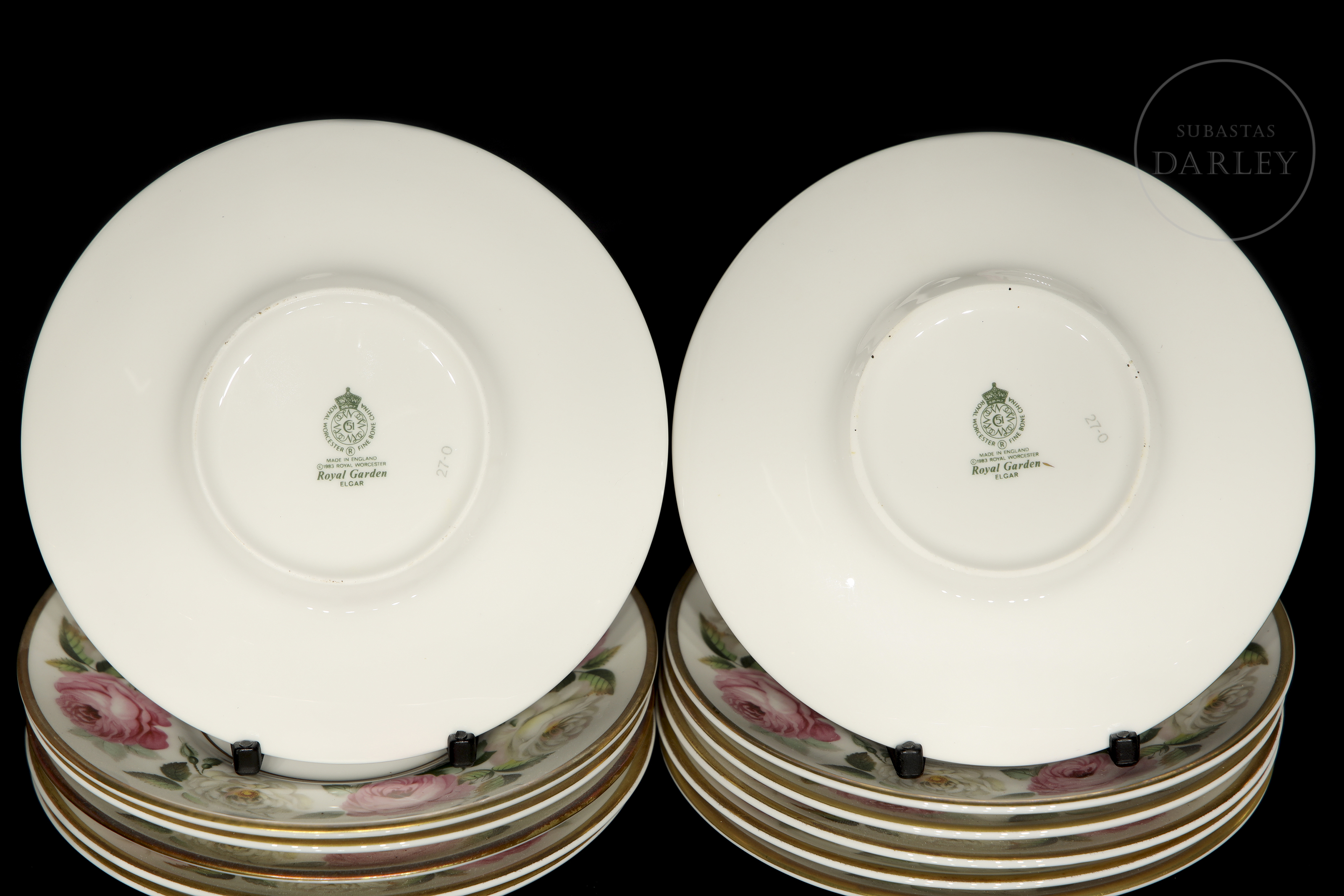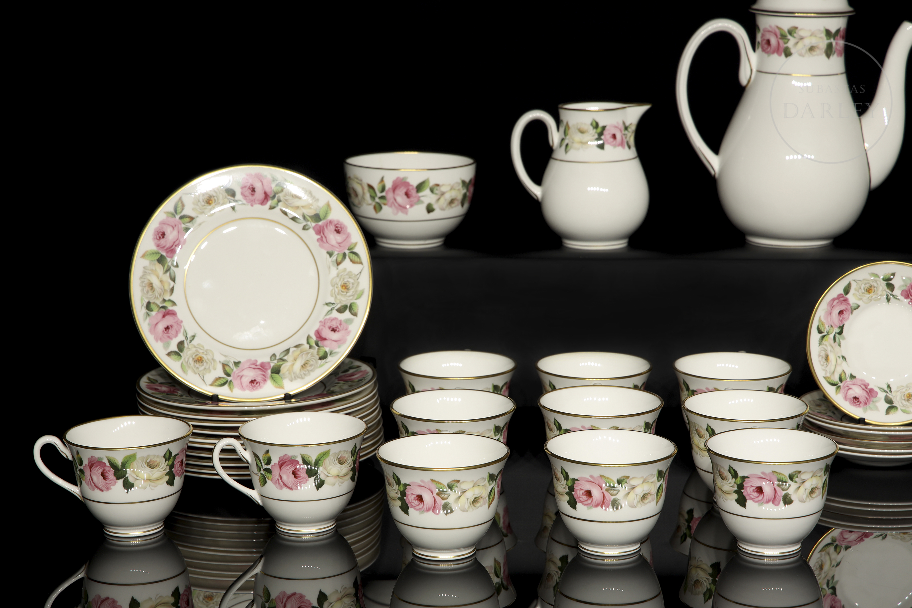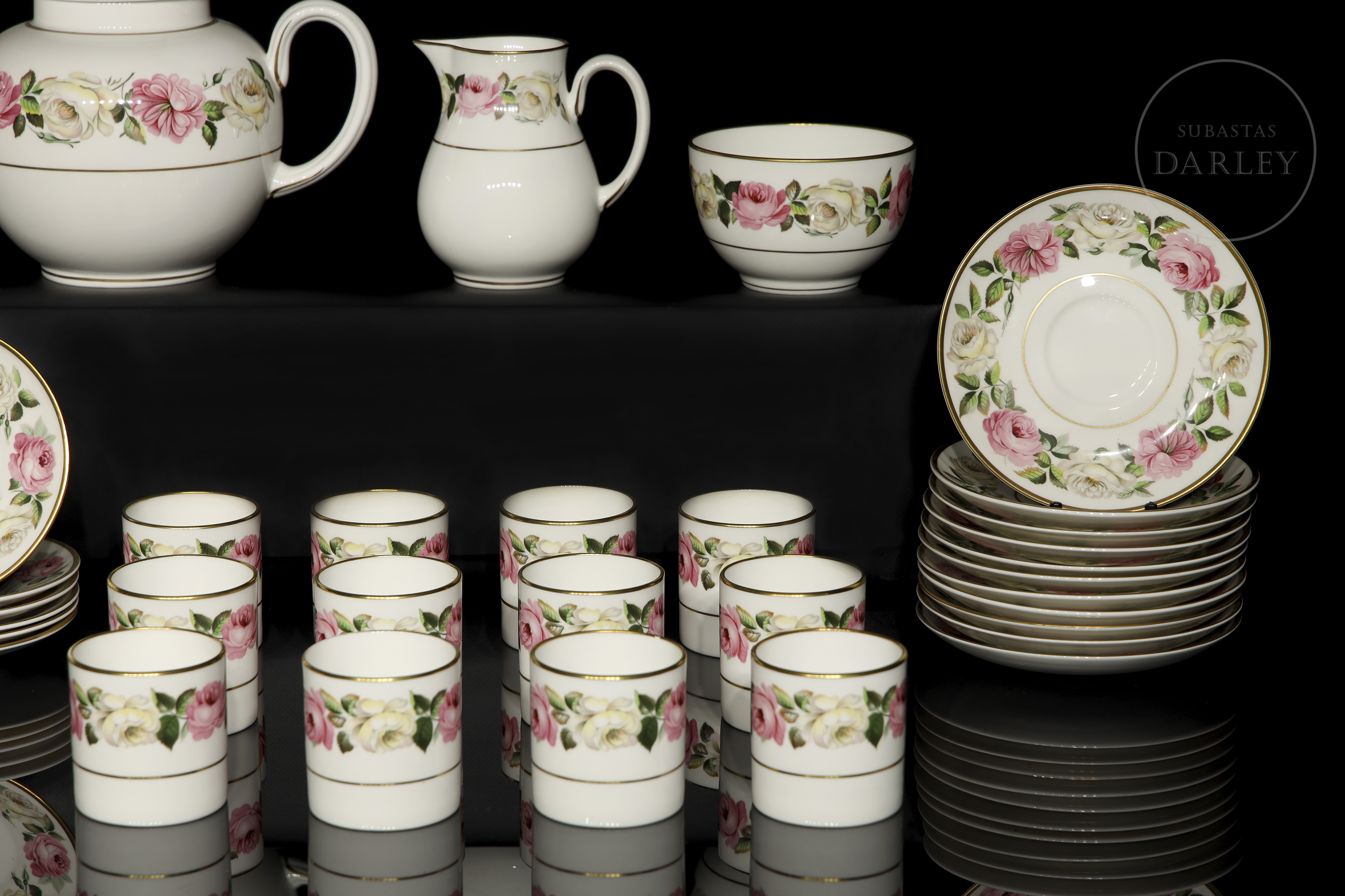 Porcelain tea and coffee set with floral decoration. Comprising teapot (1), coffee pot (1), milk jugs (2), sugar bowls (2), tea cups with saucers (11), coffee cups with saucers (12), dinner plates (11). With manufacturing stamp on the base.