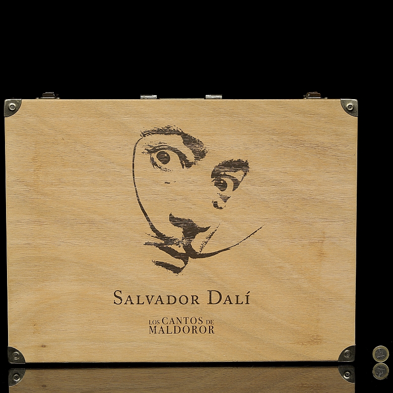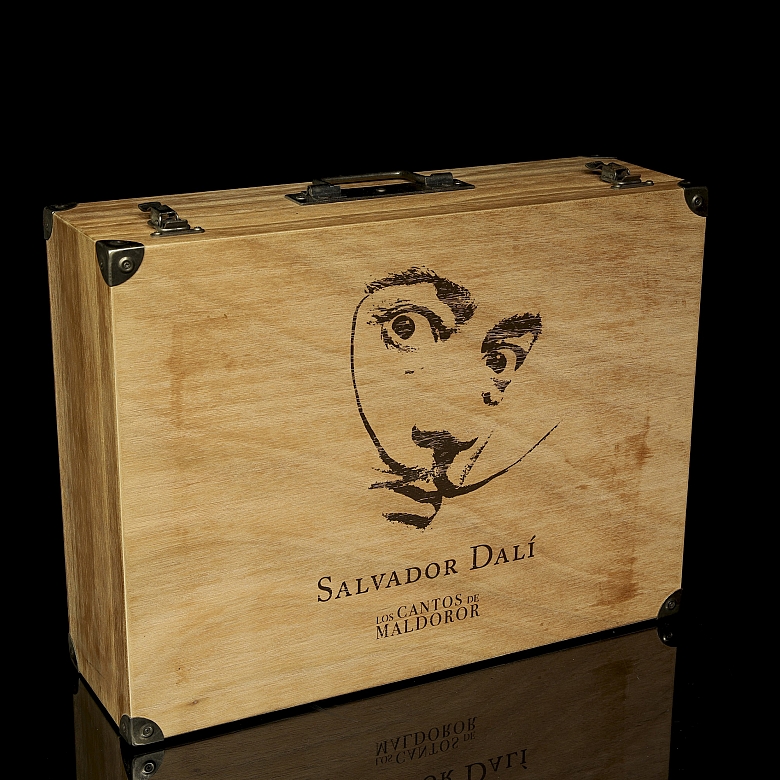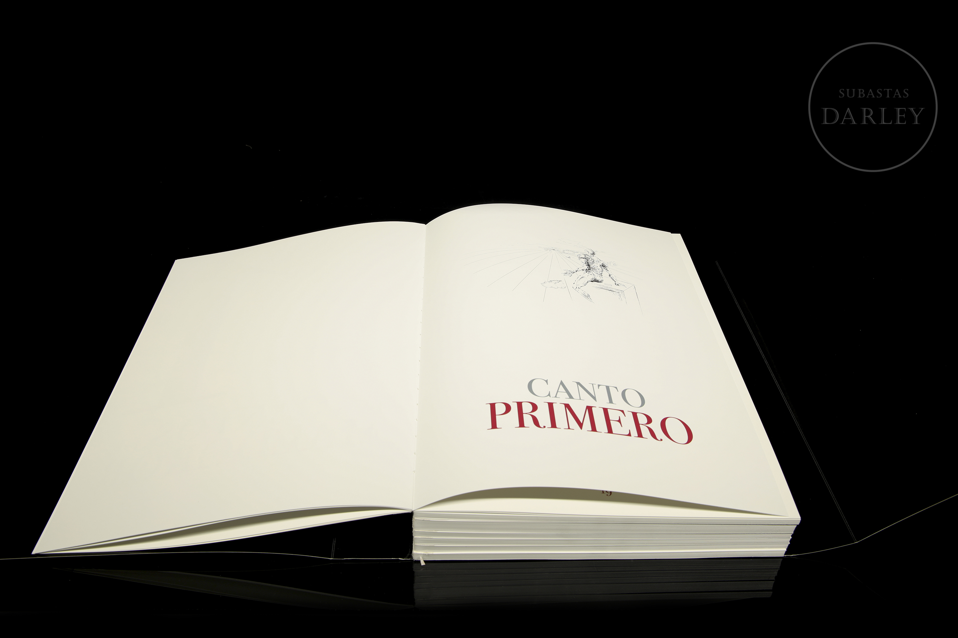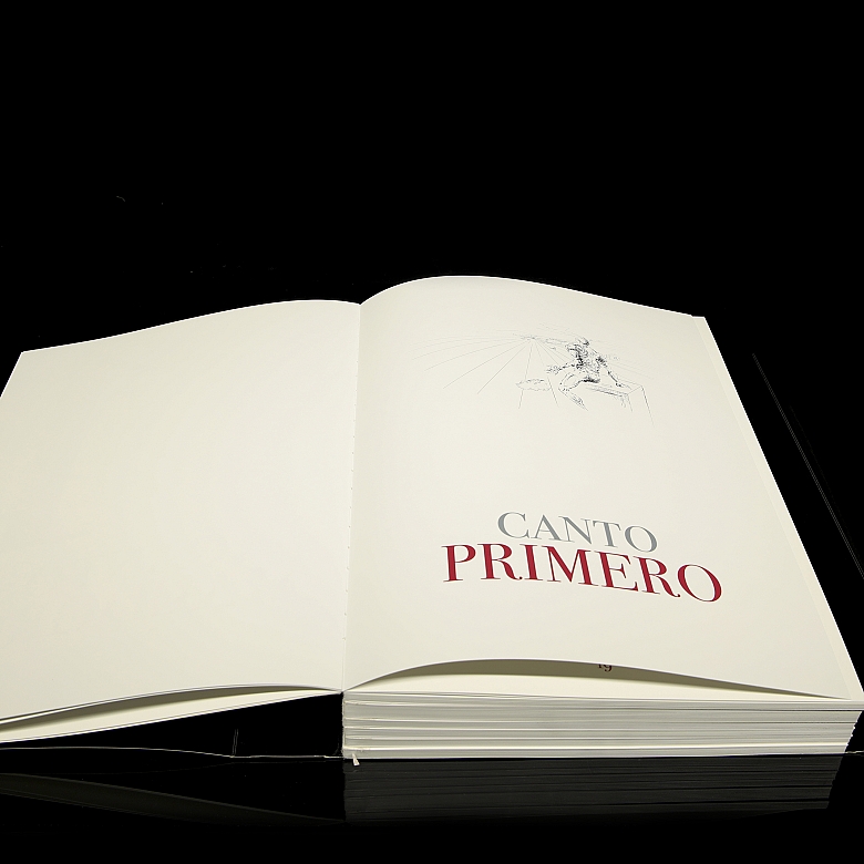 The work is presented in a wooden box decorated on the cover with a screen-printed portrait of Salvador Dalí, with a quilted capitoné interior lined in red silk. It includes: six volumes, one for each Canto with a total of 360 pages with the binding sewn and lined by hand; a folder with a facsimile reproduction of the 11 preparatory drawings and 4 state proofs, plus 1 enlarged double drawing; the study book of the work and finally, a metal plate of iron, treated with oxide, polished by hand.