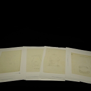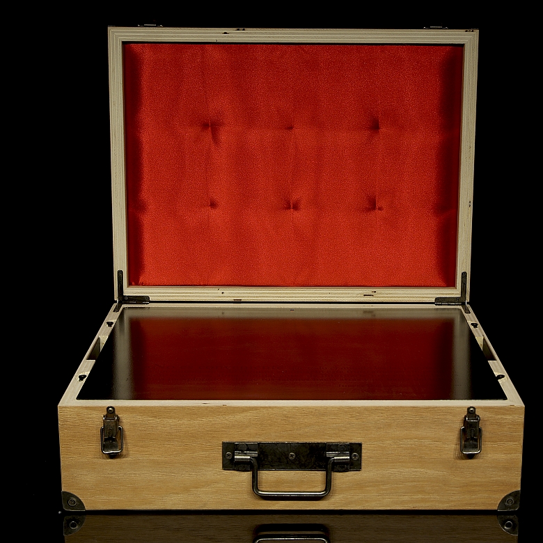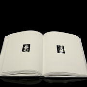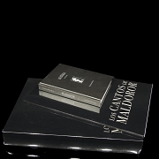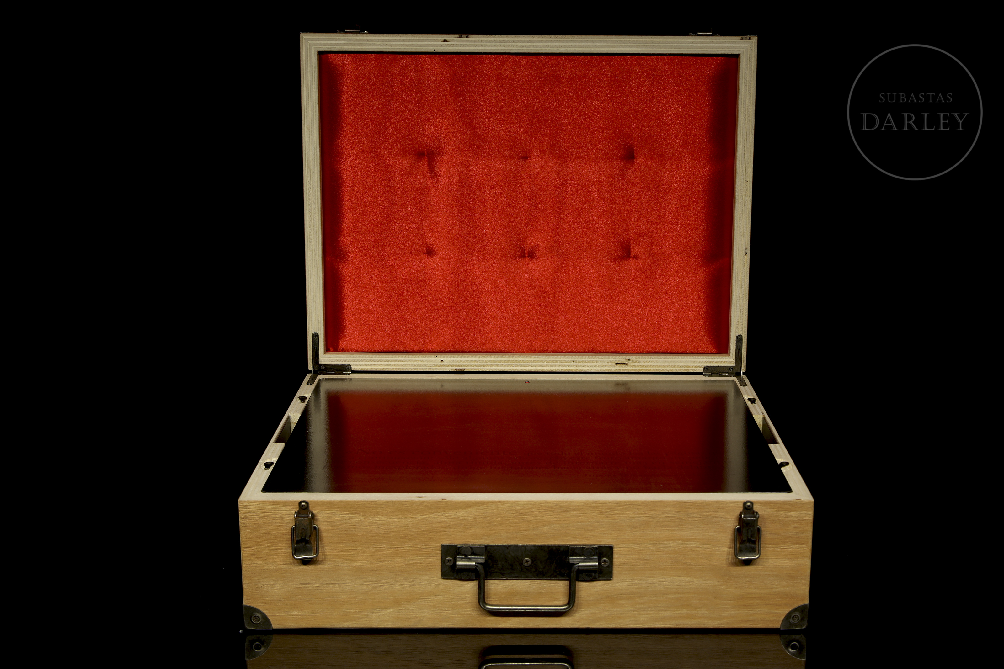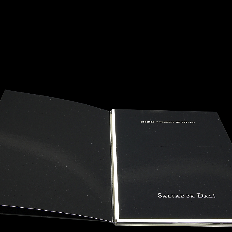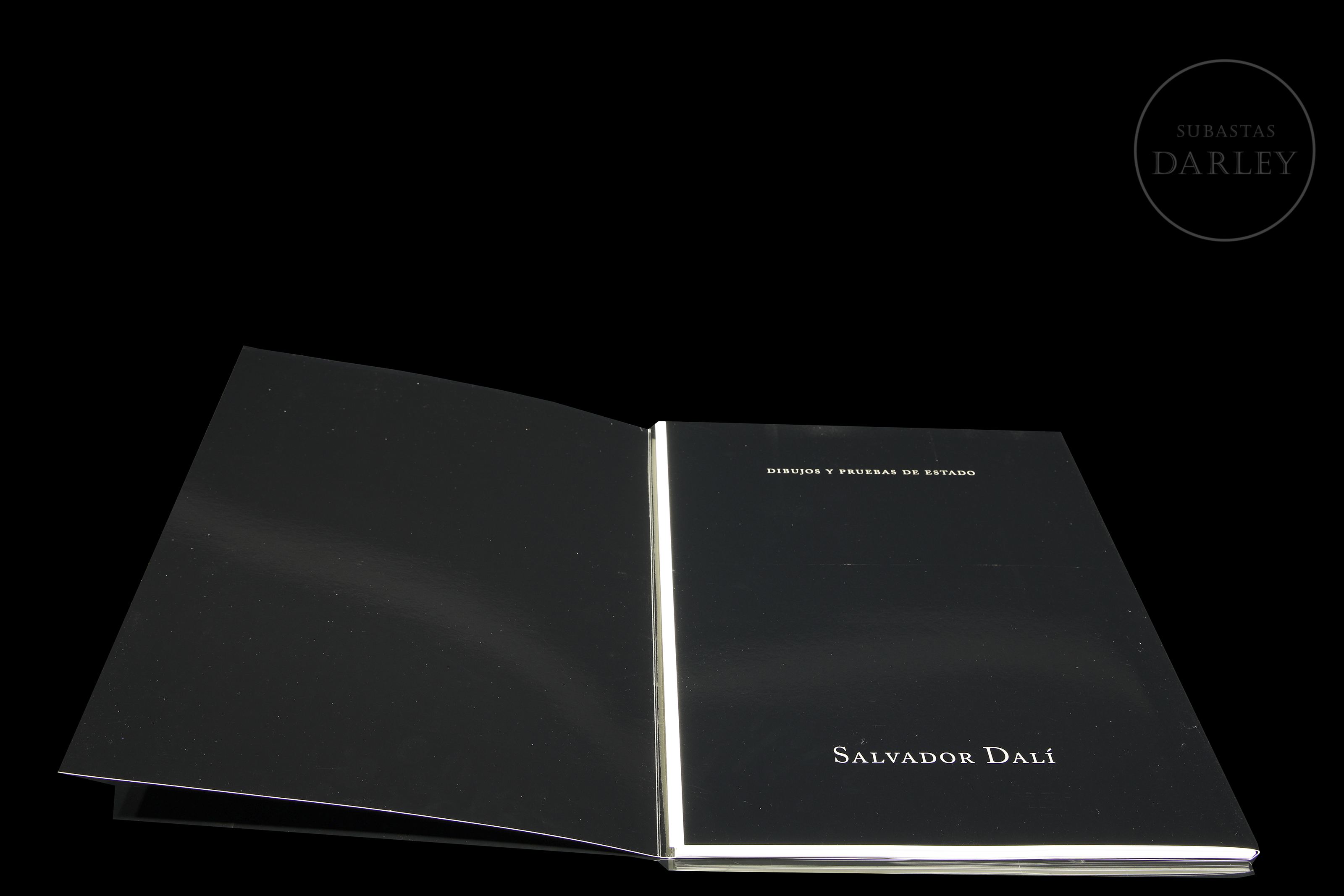 The work is presented in a wooden box decorated on the cover with a screen-printed portrait of Salvador Dalí, with a quilted capitoné interior lined in red silk. It includes: six volumes, one for each Canto with a total of 360 pages with the binding sewn and lined by hand; a folder with a facsimile reproduction of the 11 preparatory drawings and 4 state proofs, plus 1 enlarged double drawing; the study book of the work and finally, a metal plate of iron, treated with oxide, polished by hand.