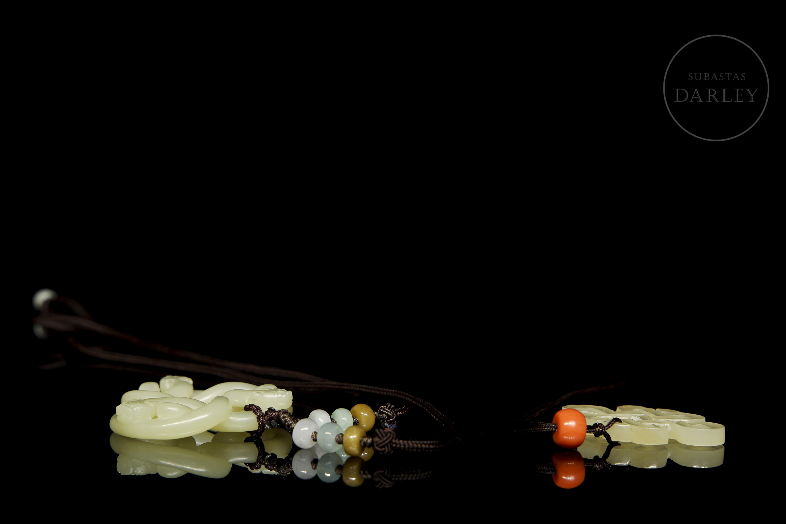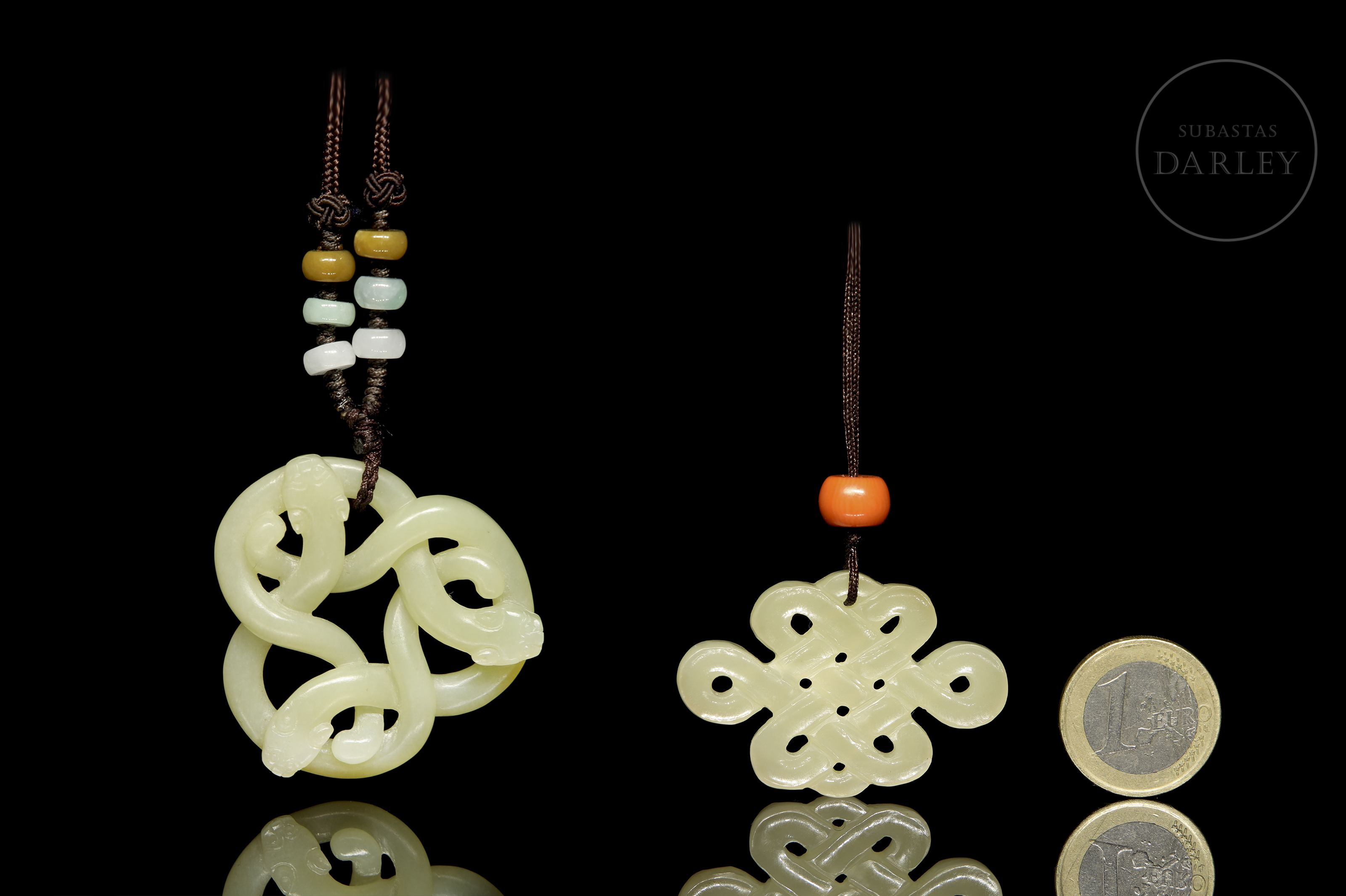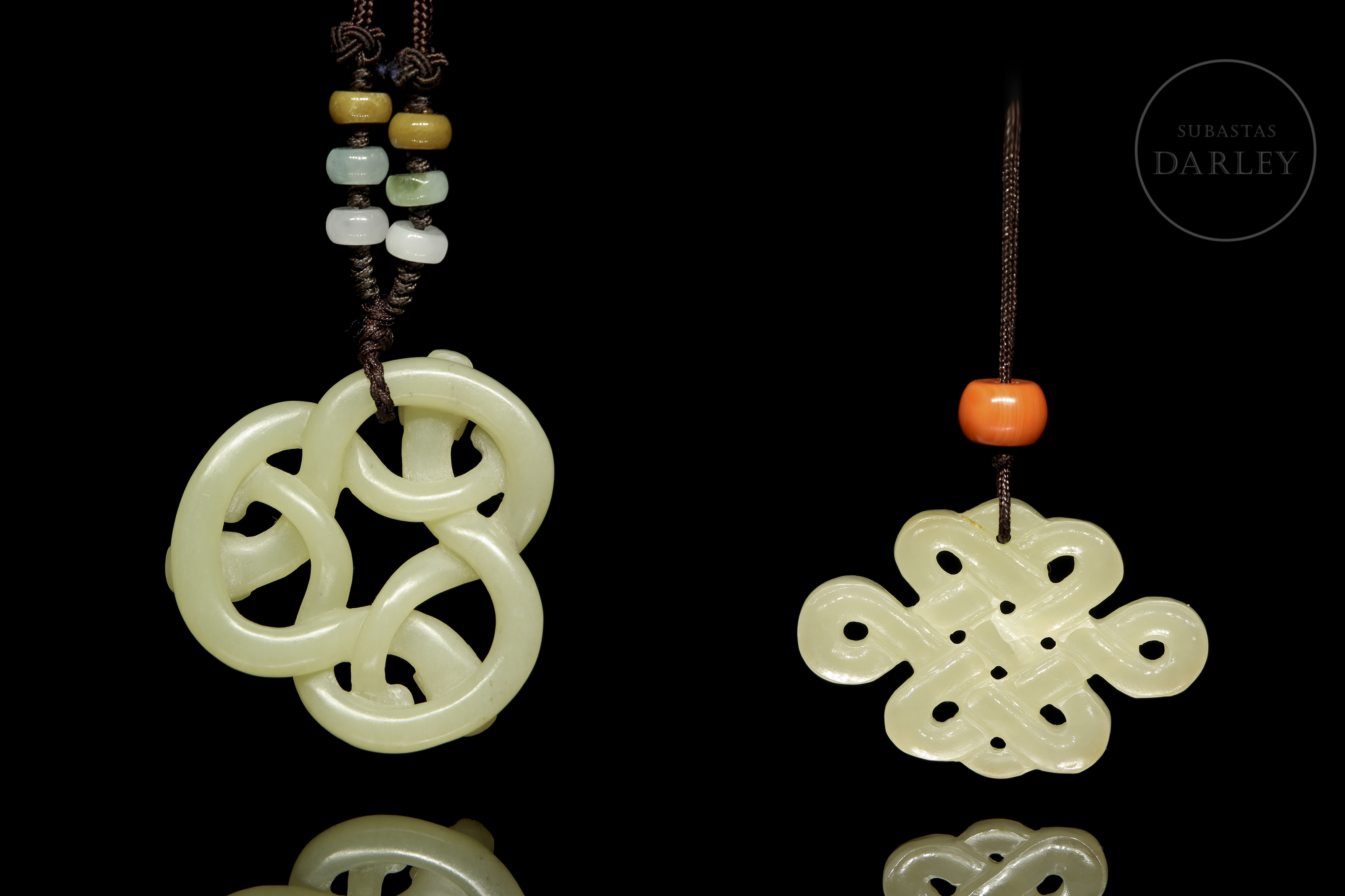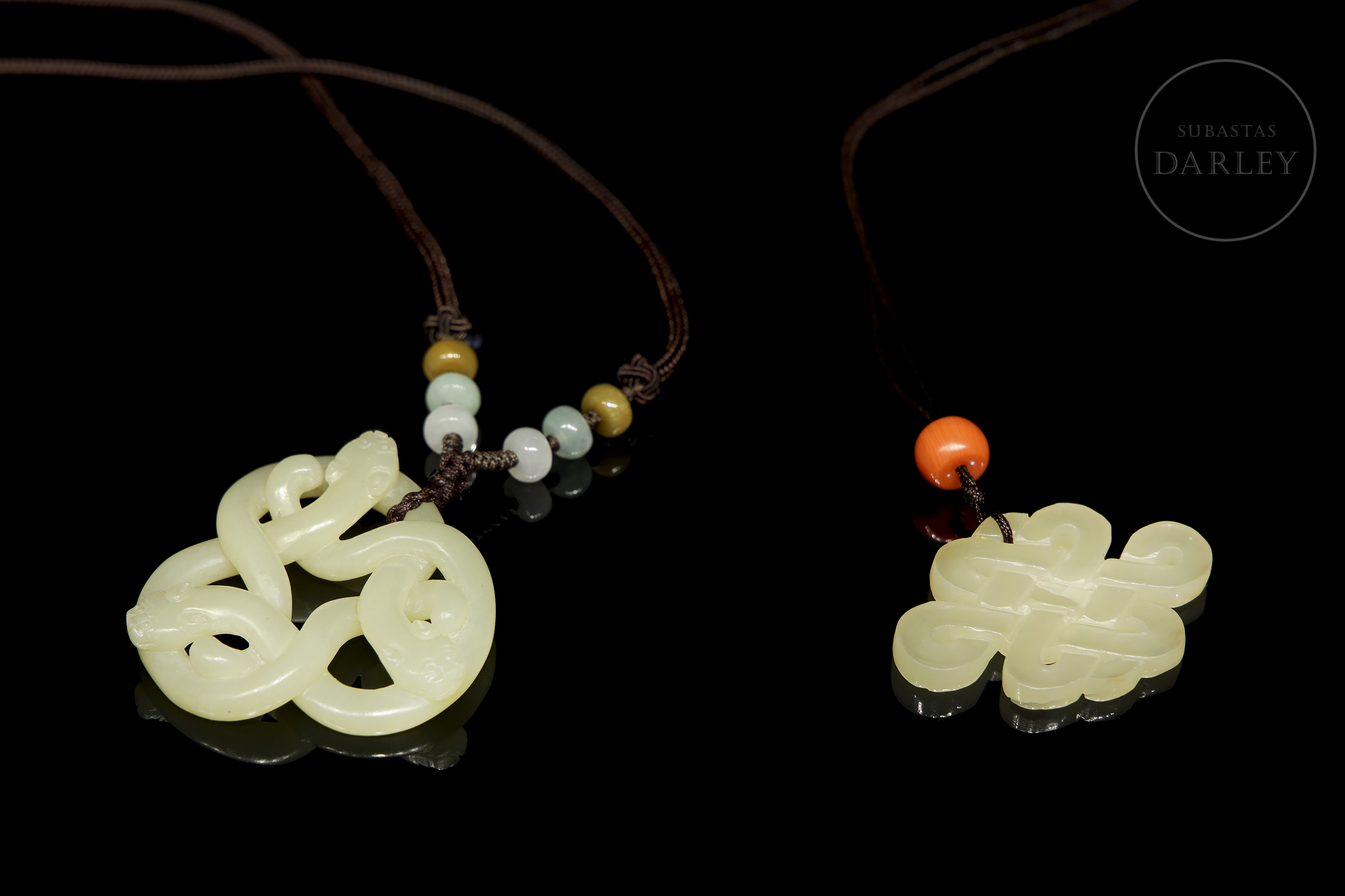 Set of two openwork pendants in uniformly colored jade. One features an endless knot motif and decorative beads, while the other consists of intertwined stylized dragons in a circular composition. Both have holes for suspension.