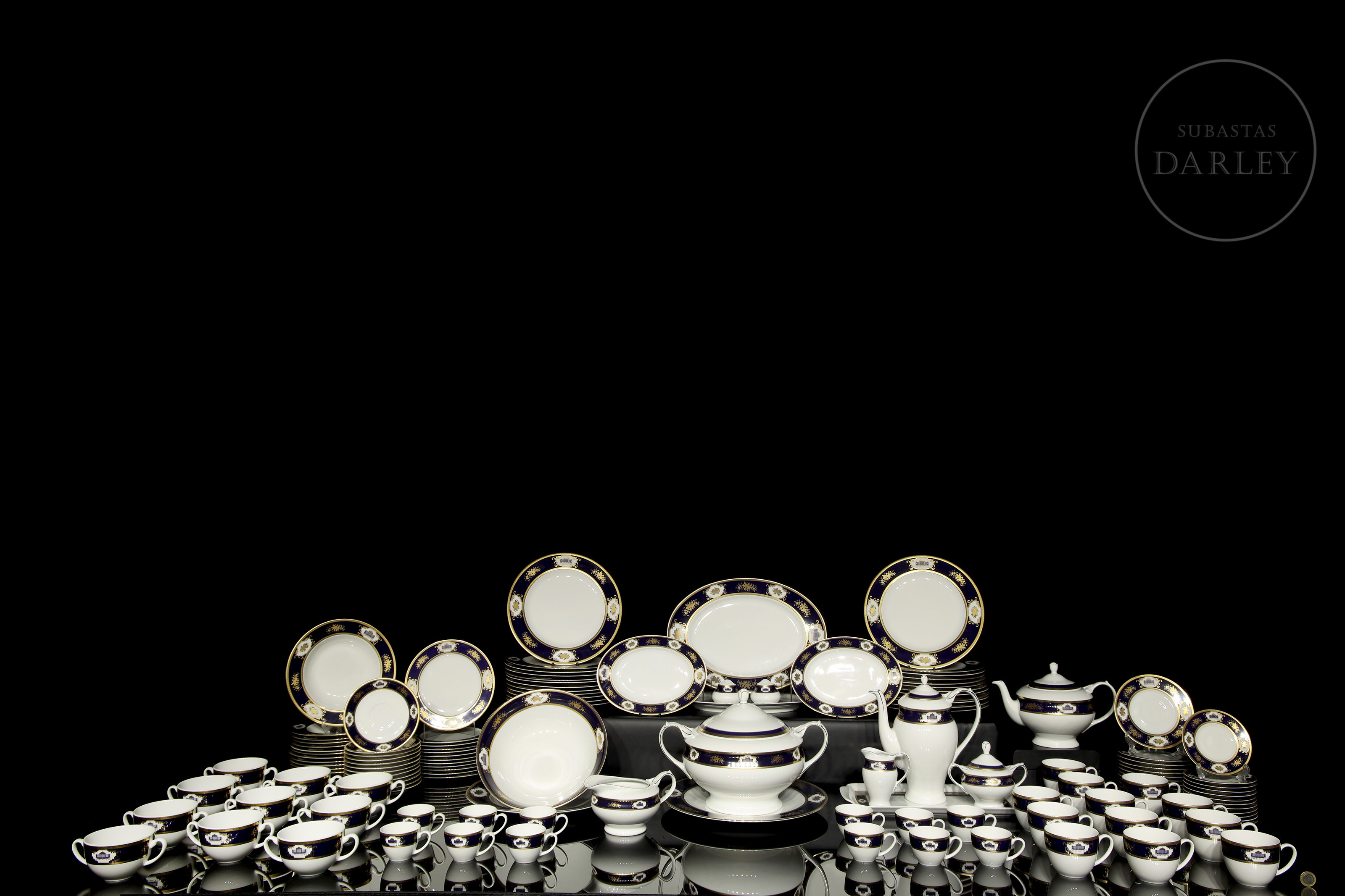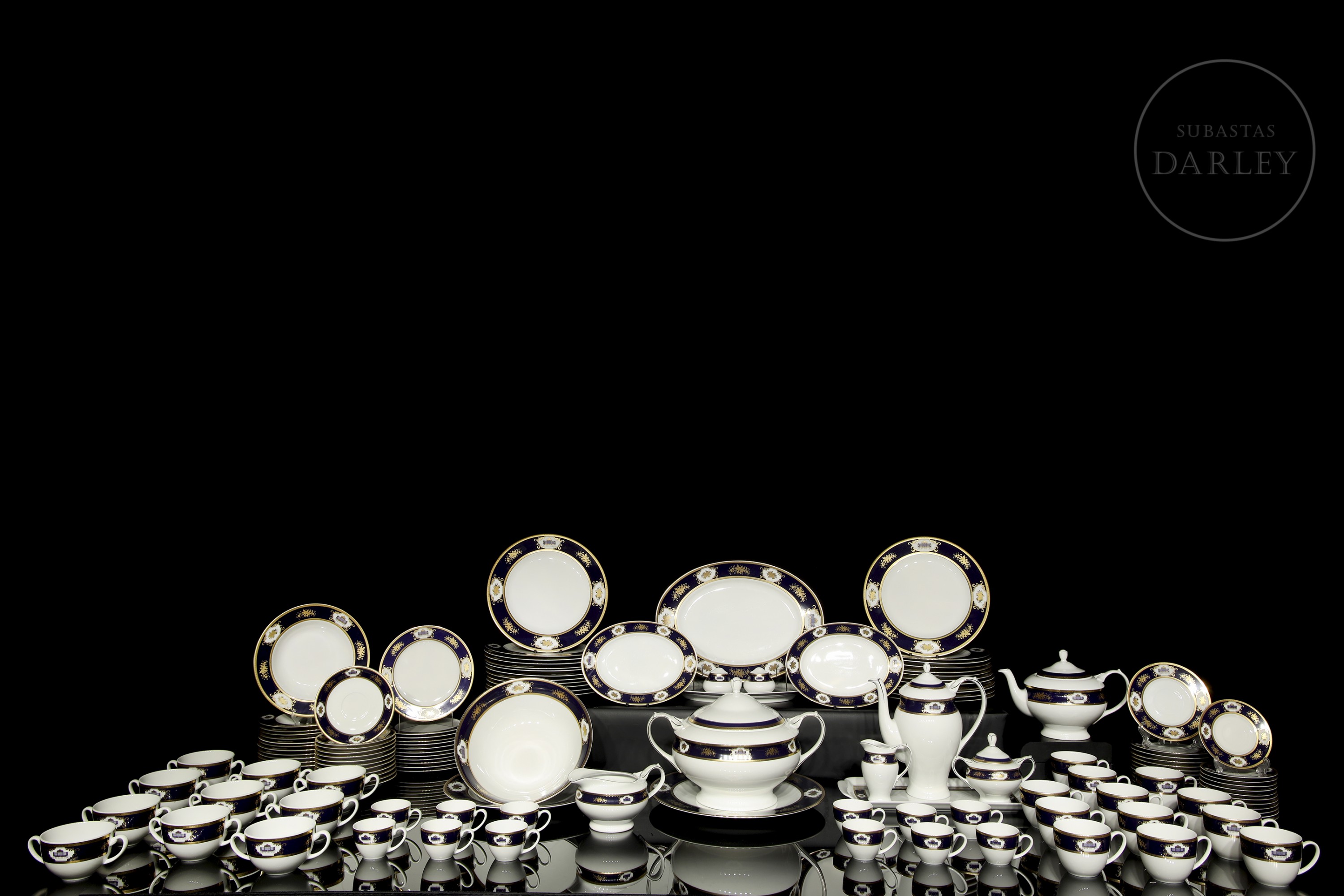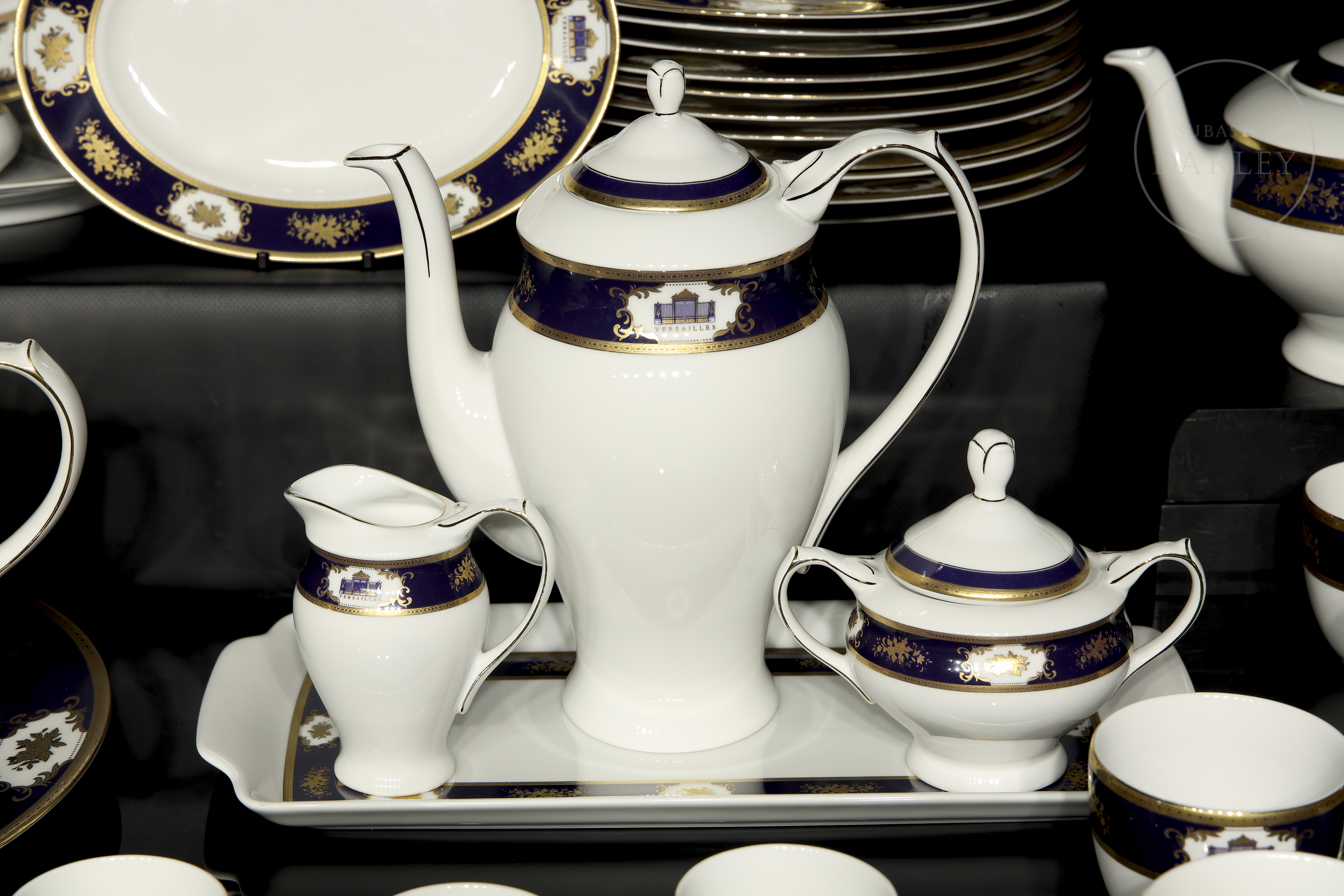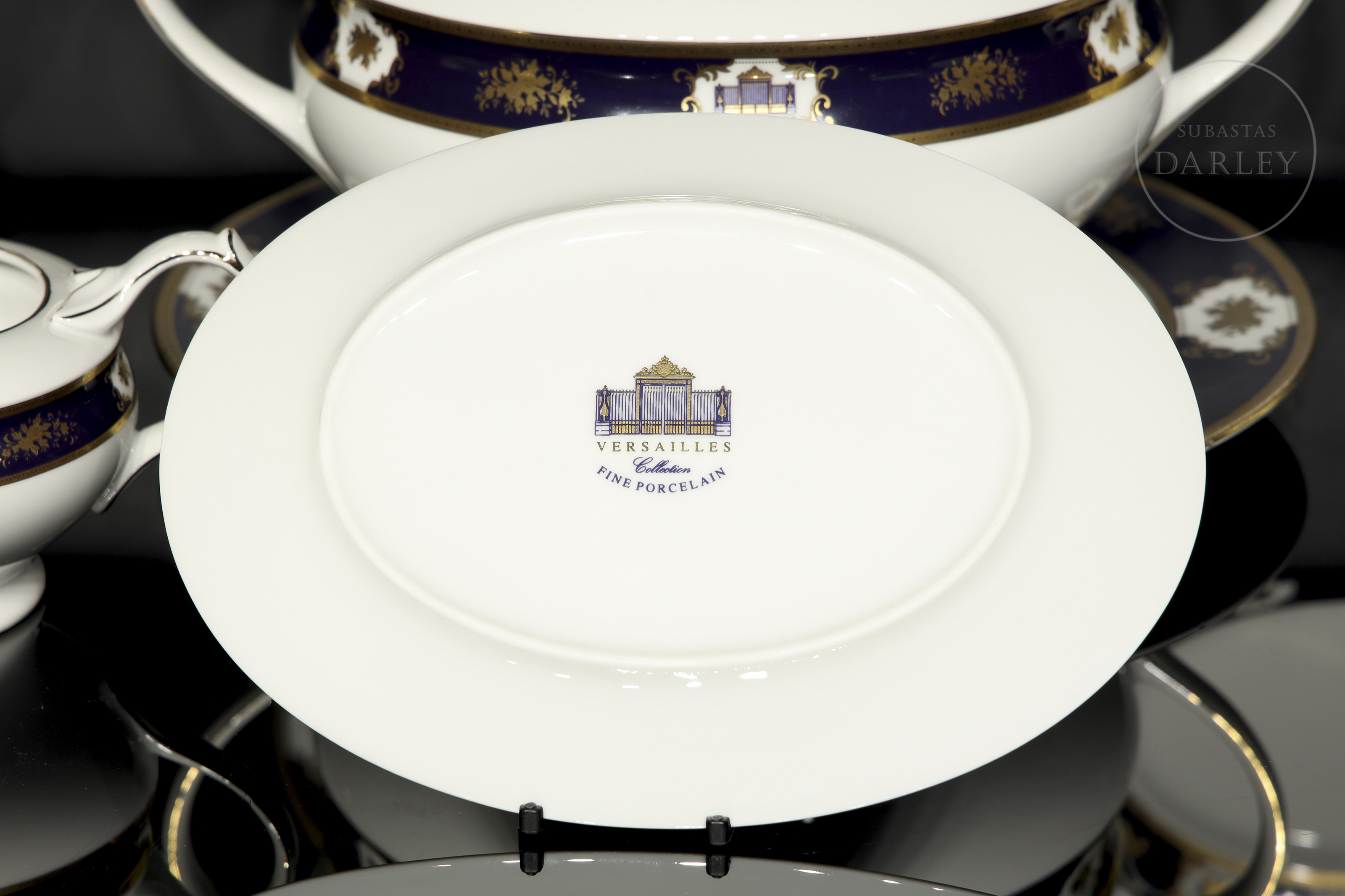 Fine porcelain. White porcelain tableware with a wide decorative band in cobalt blue and gold plant motifs. It consists of tea cups with saucers (12), coffee cups with saucers (12), soup bowls (10), oval platters of various sizes (4), milk jug (1), sugar bowl (1), teapot (1), coffee pot (1), salt and pepper shakers on a tray (1), gravy boat (1), soup tureen (1), and four sets of plates (12). Stamped “Versailles Collection Fine Porcelain” on the base.
