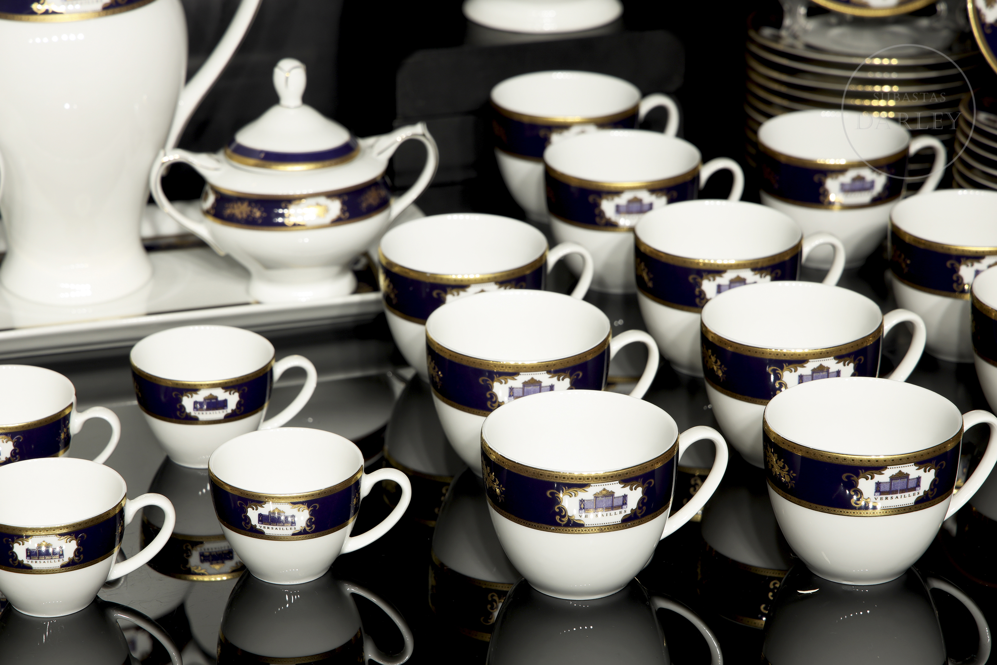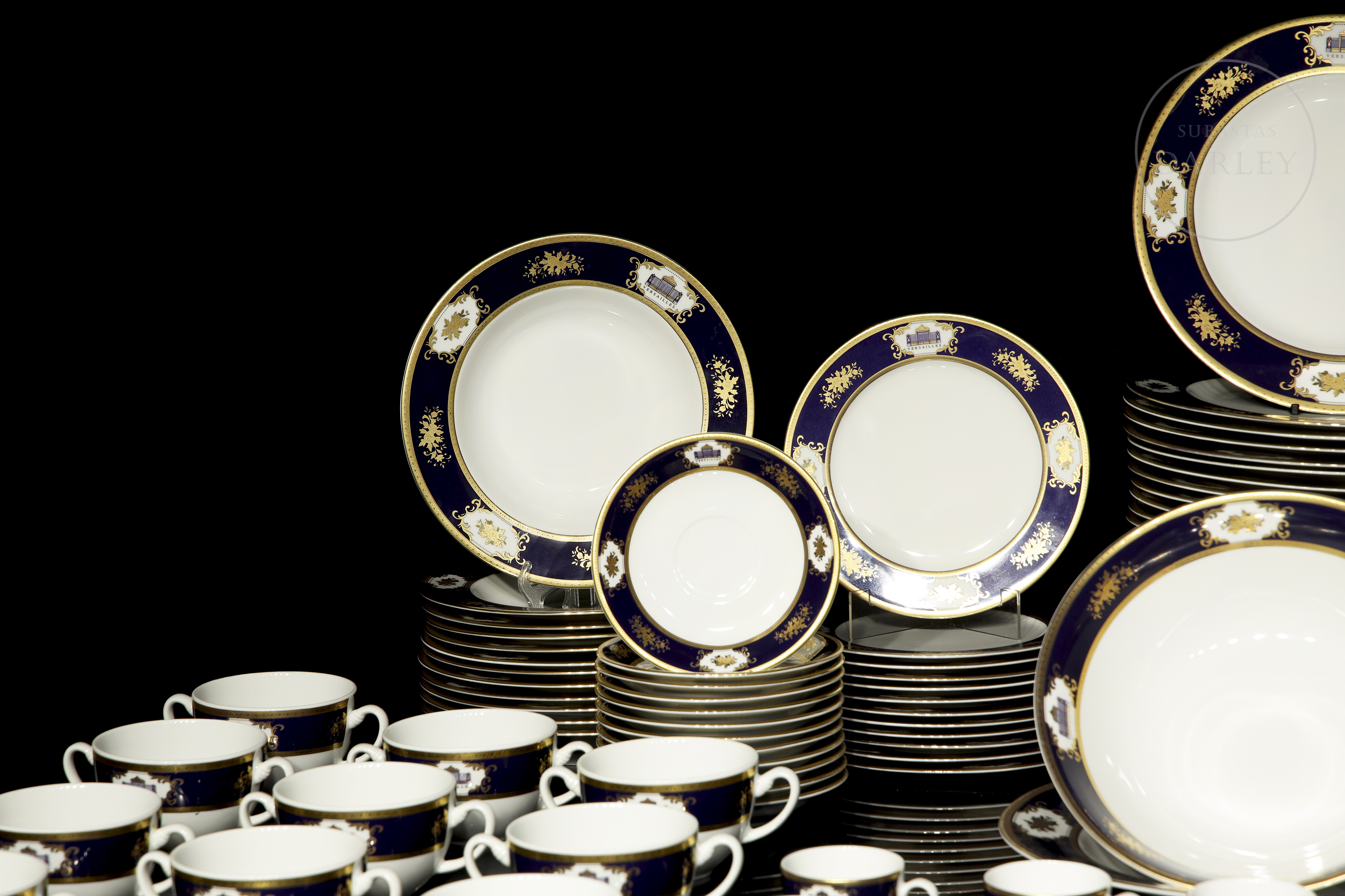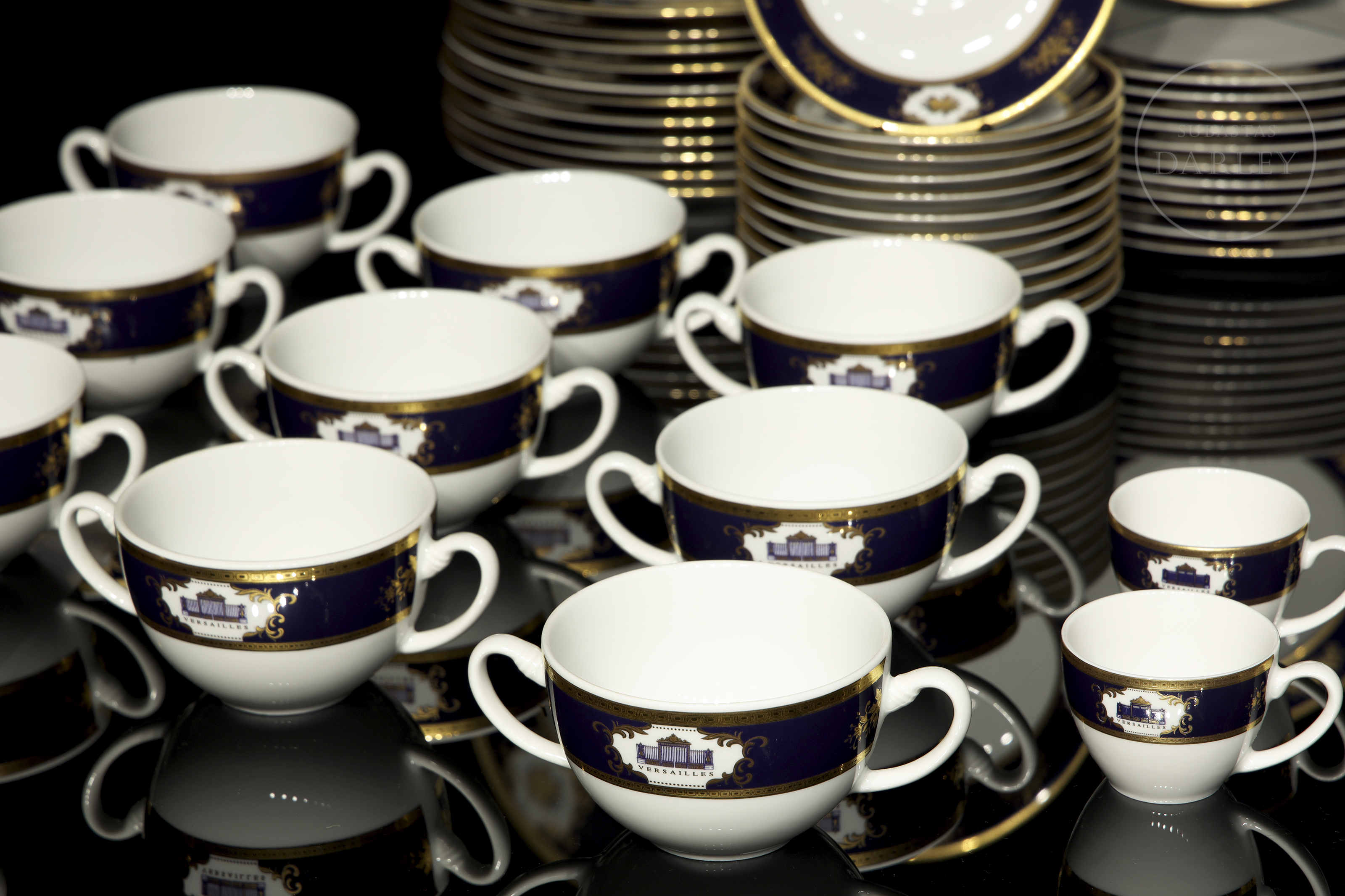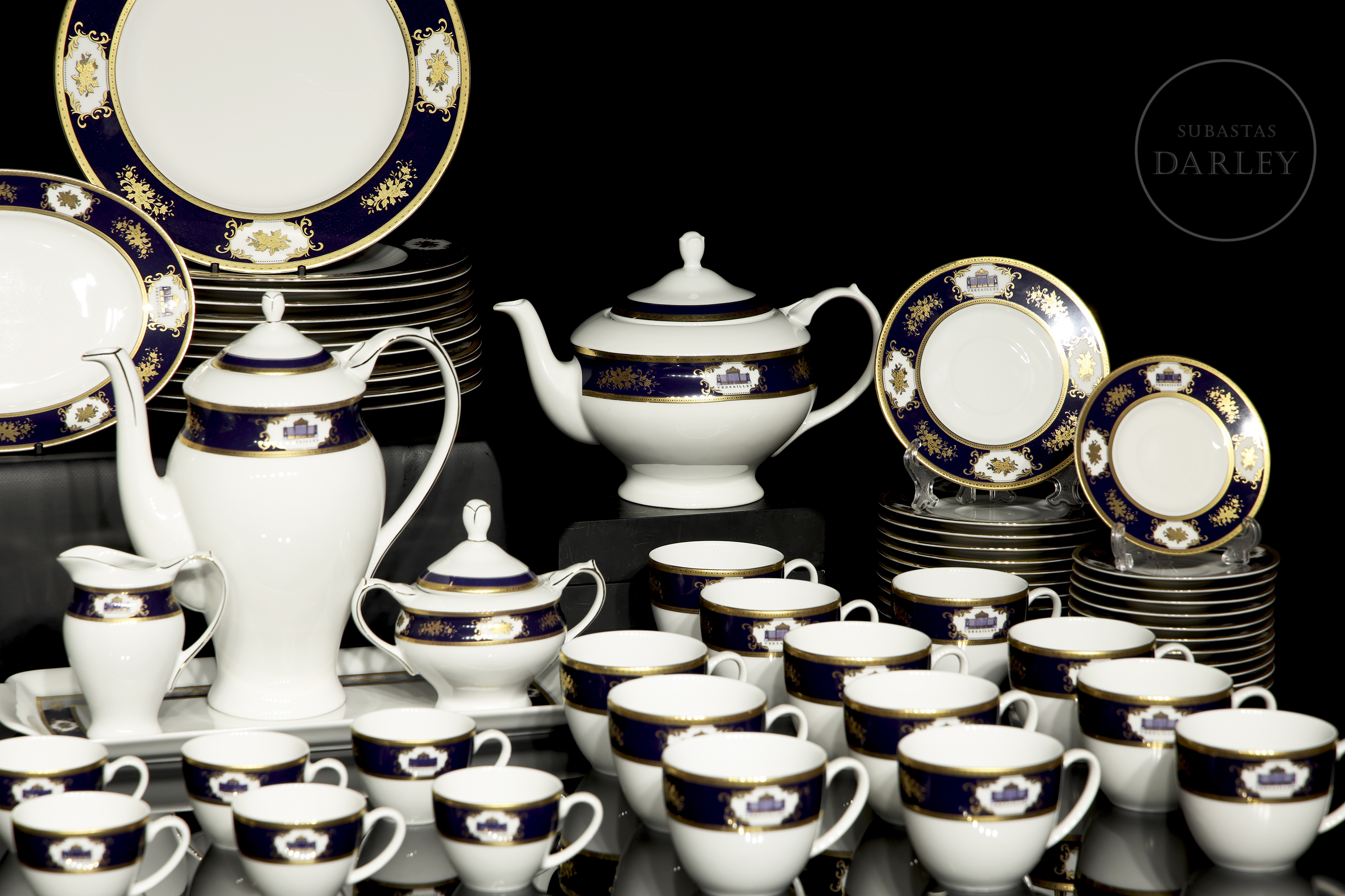 Fine porcelain. White porcelain tableware with a wide decorative band in cobalt blue and gold plant motifs. It consists of tea cups with saucers (12), coffee cups with saucers (12), soup bowls (10), oval platters of various sizes (4), milk jug (1), sugar bowl (1), teapot (1), coffee pot (1), salt and pepper shakers on a tray (1), gravy boat (1), soup tureen (1), and four sets of plates (12). Stamped “Versailles Collection Fine Porcelain” on the base.