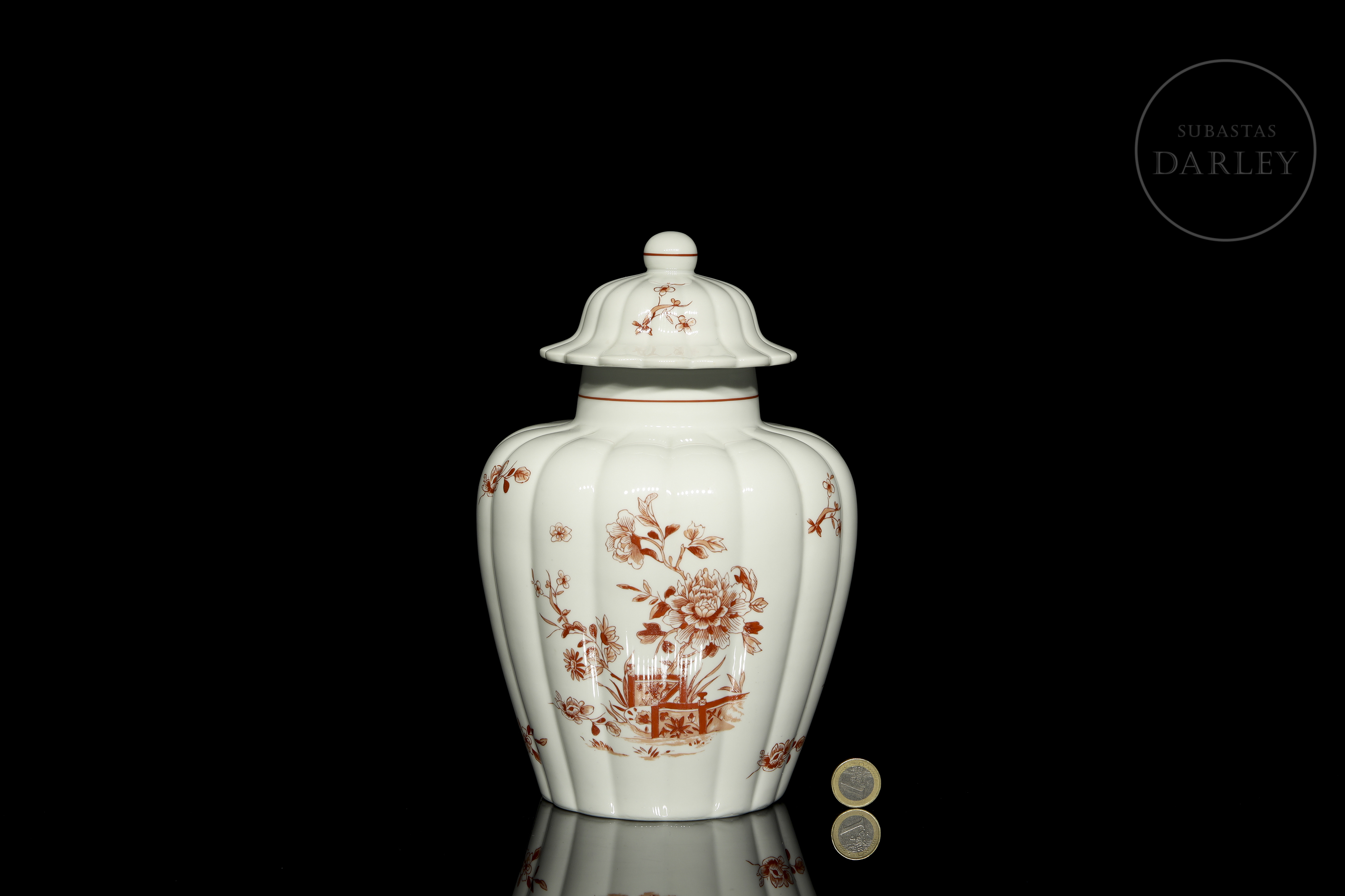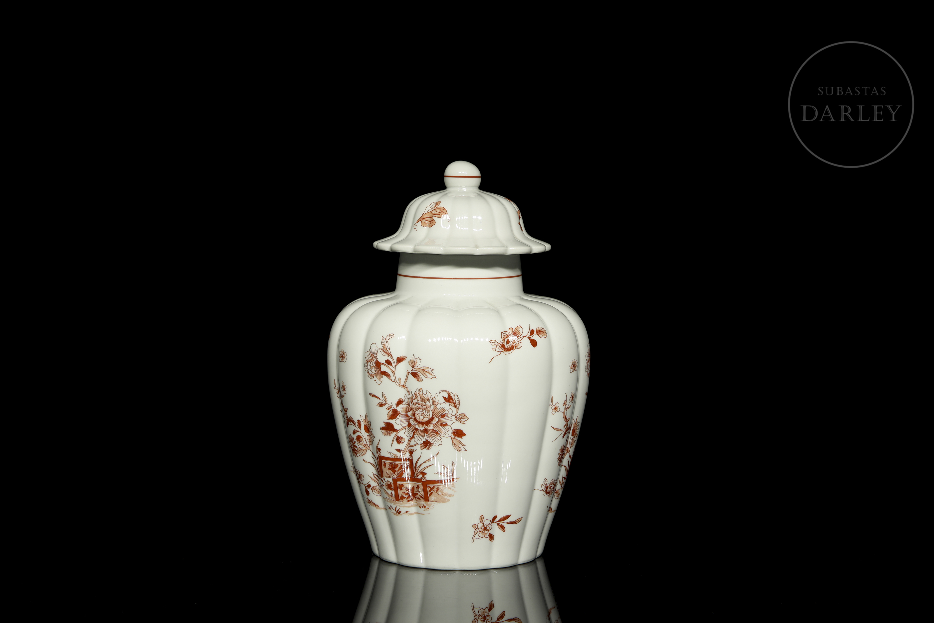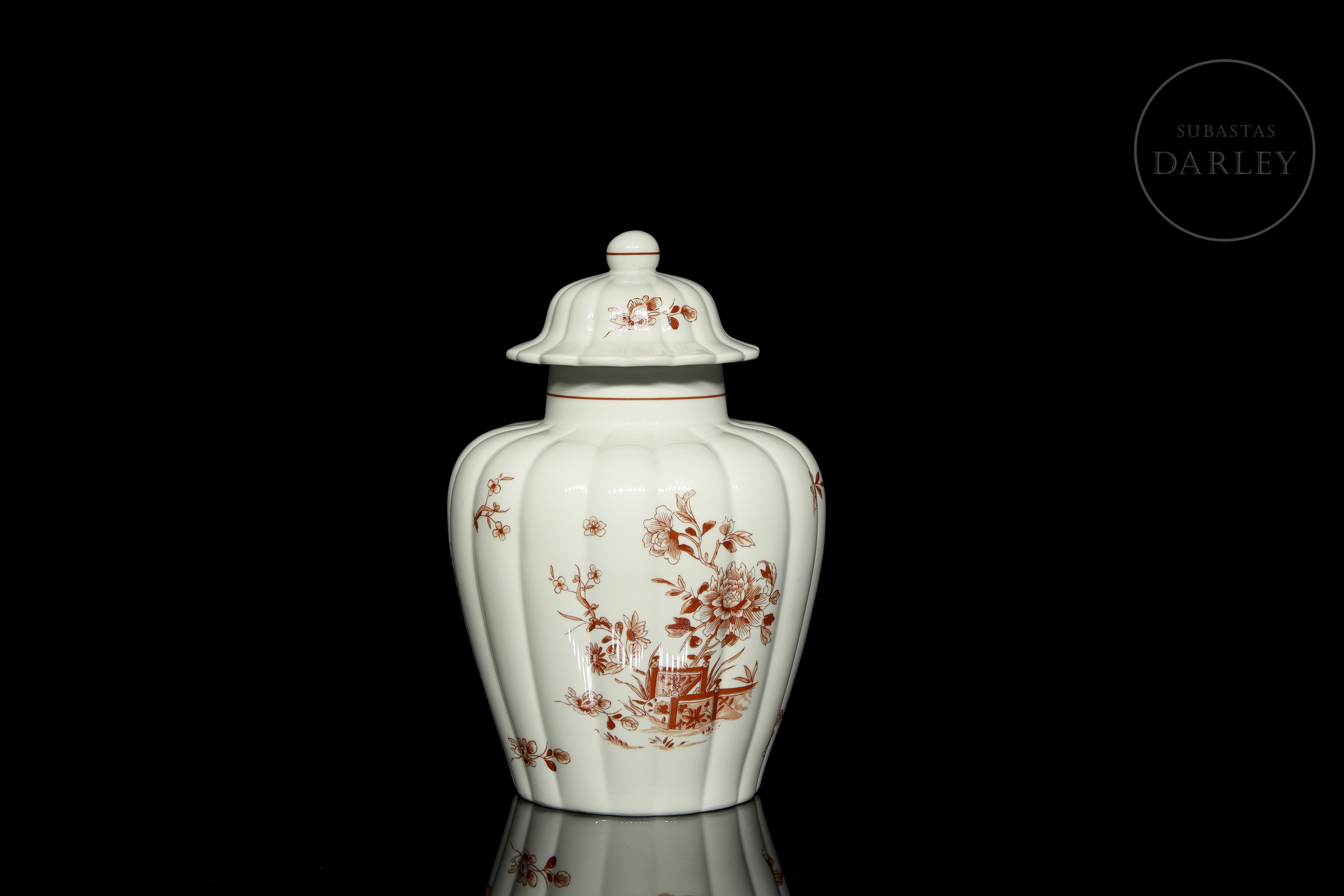 Modelled in the form of a traditional Chinese vessel, with a lobed profile and floral decorations, covered with a lid. With a manufacturing stamp on the base.
