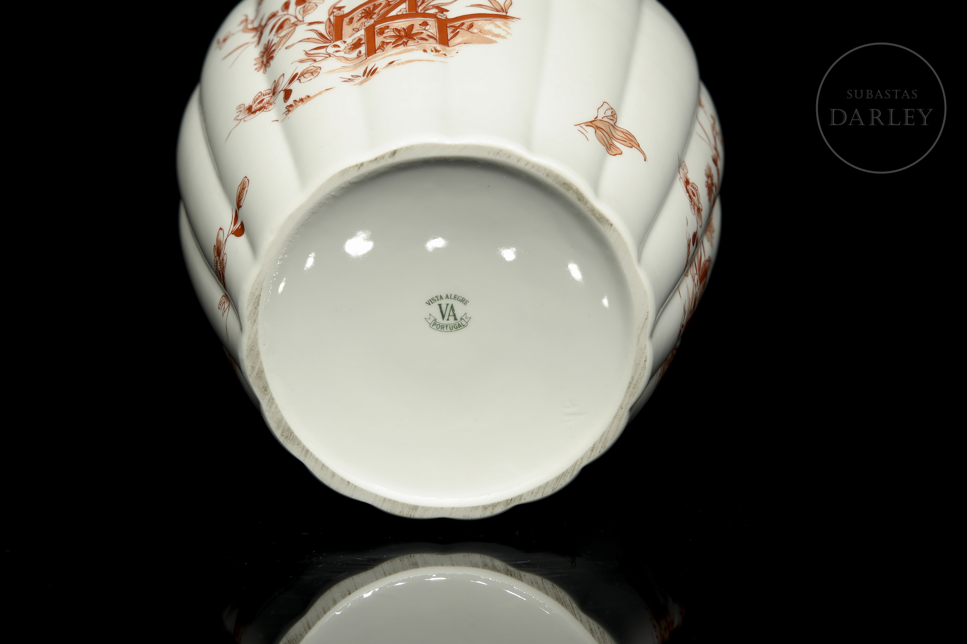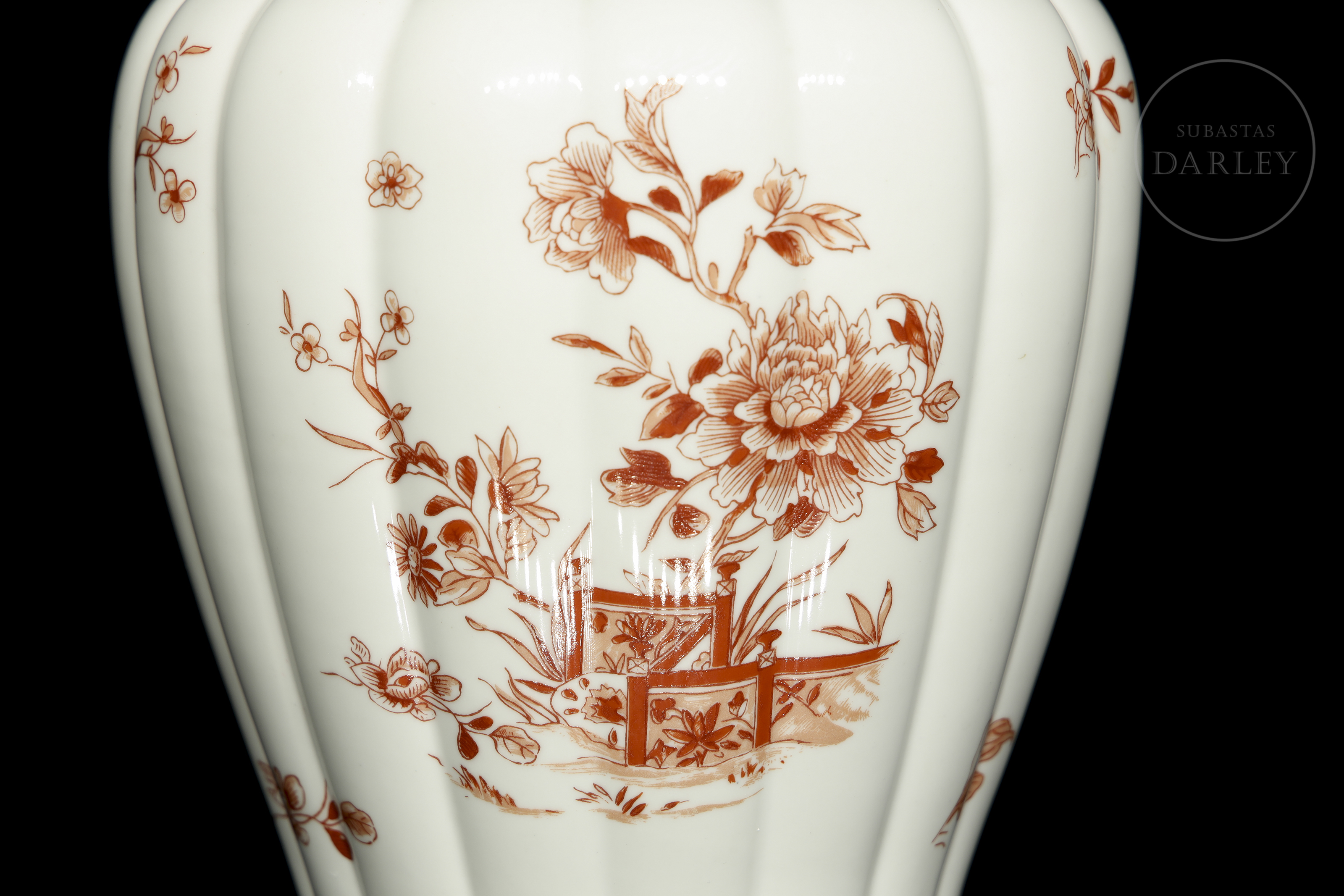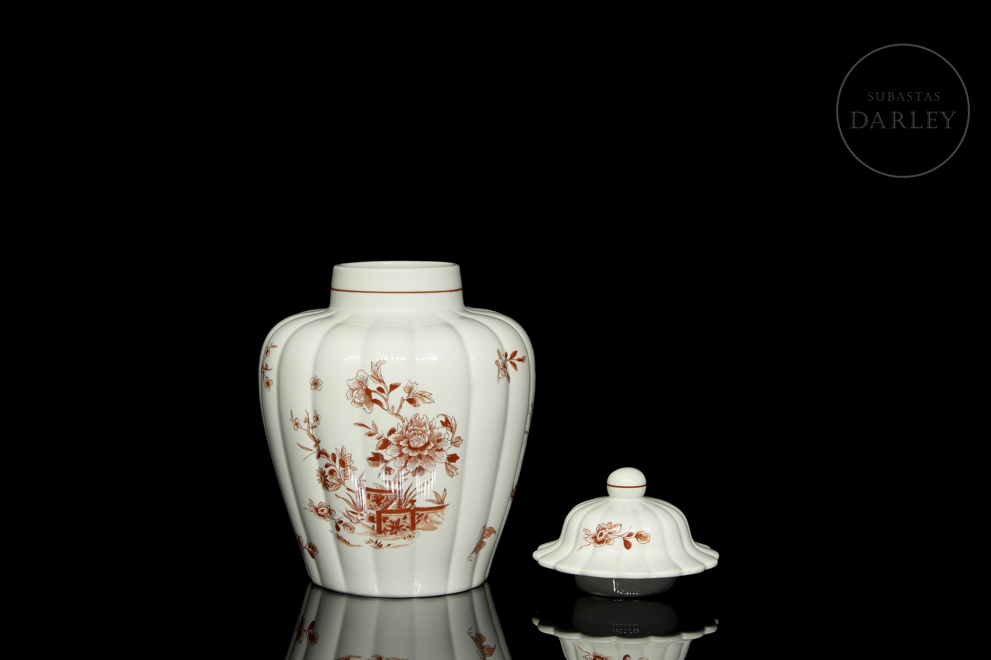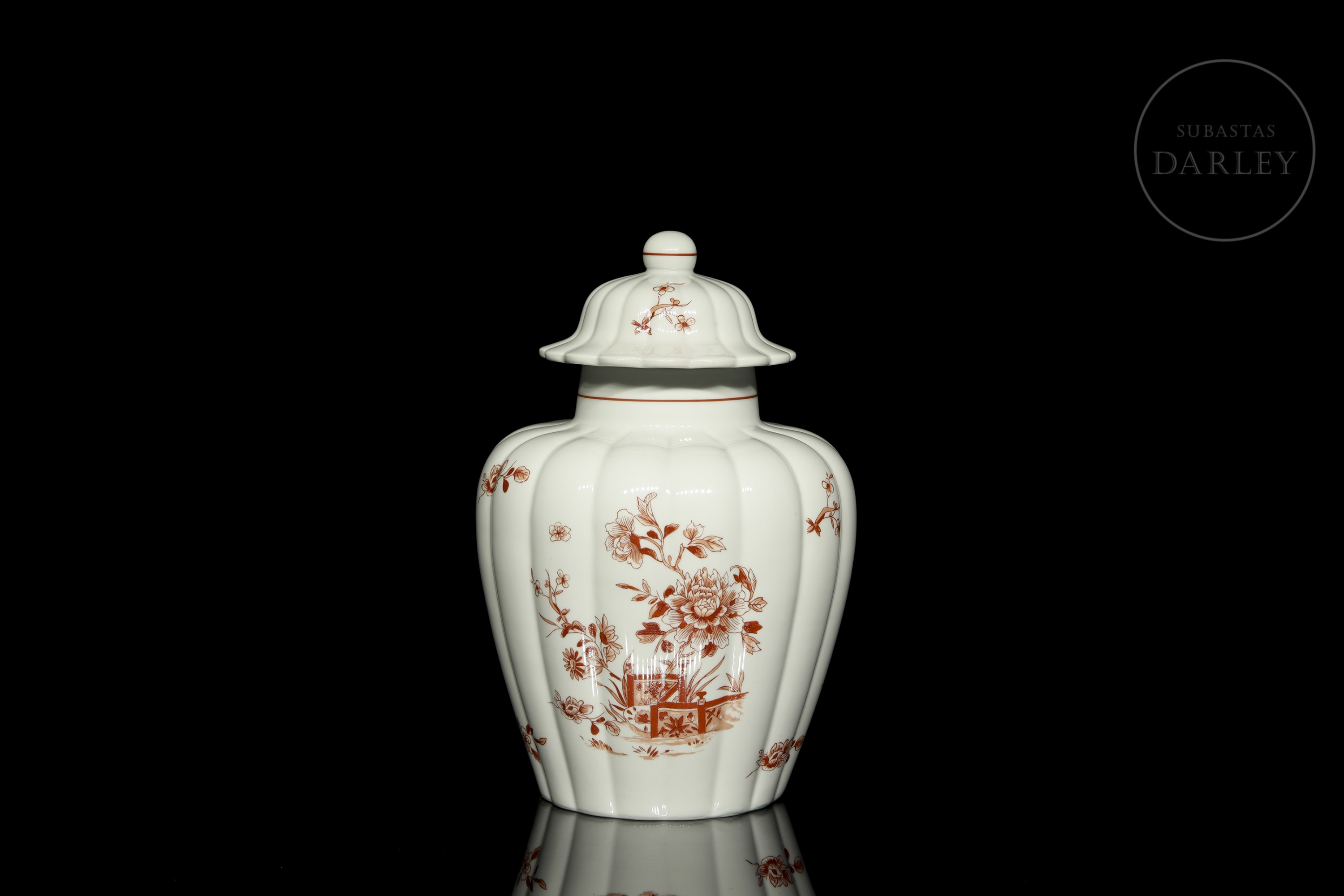Modelled in the form of a traditional Chinese vessel, with a lobed profile and floral decorations, covered with a lid. With a manufacturing stamp on the base.