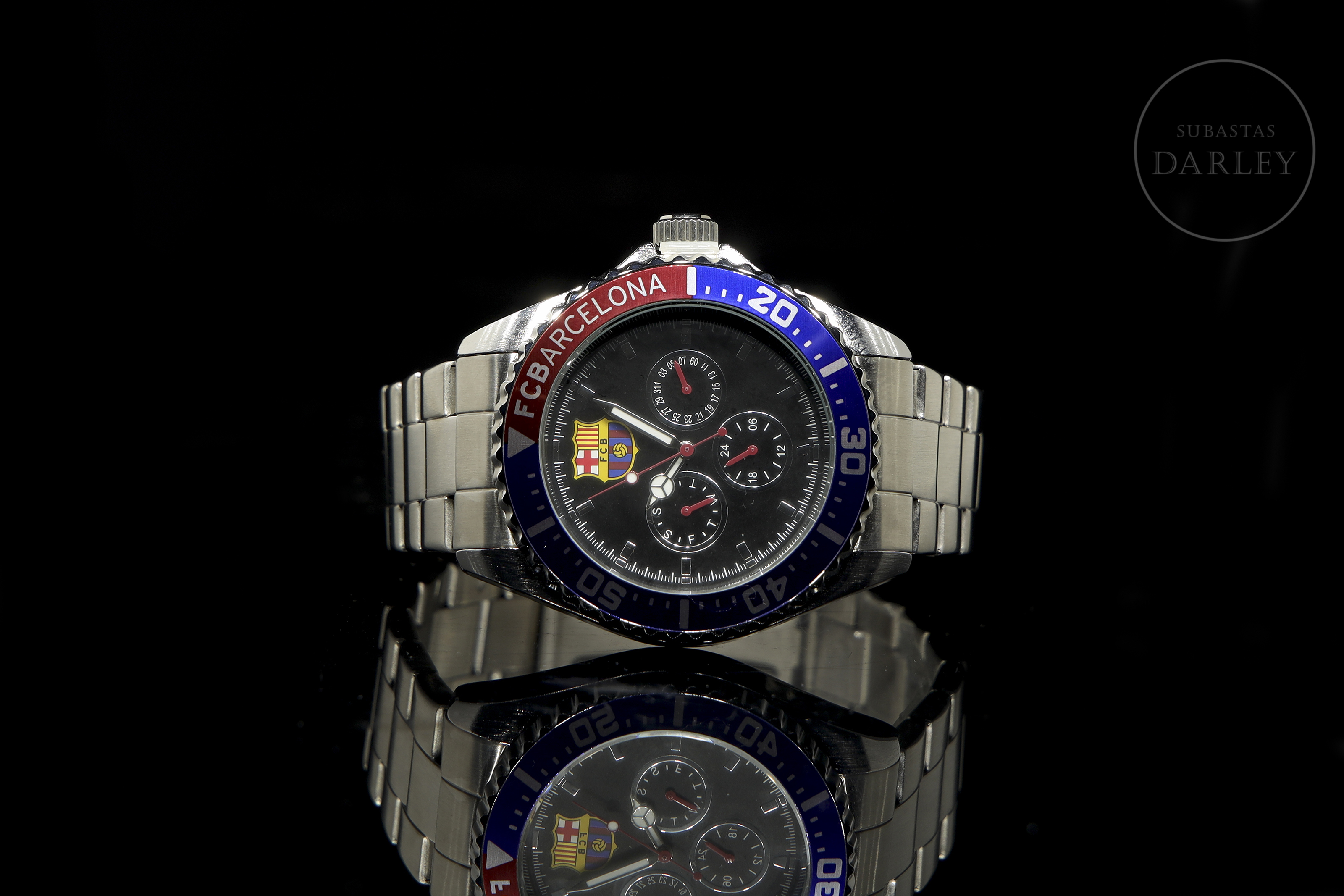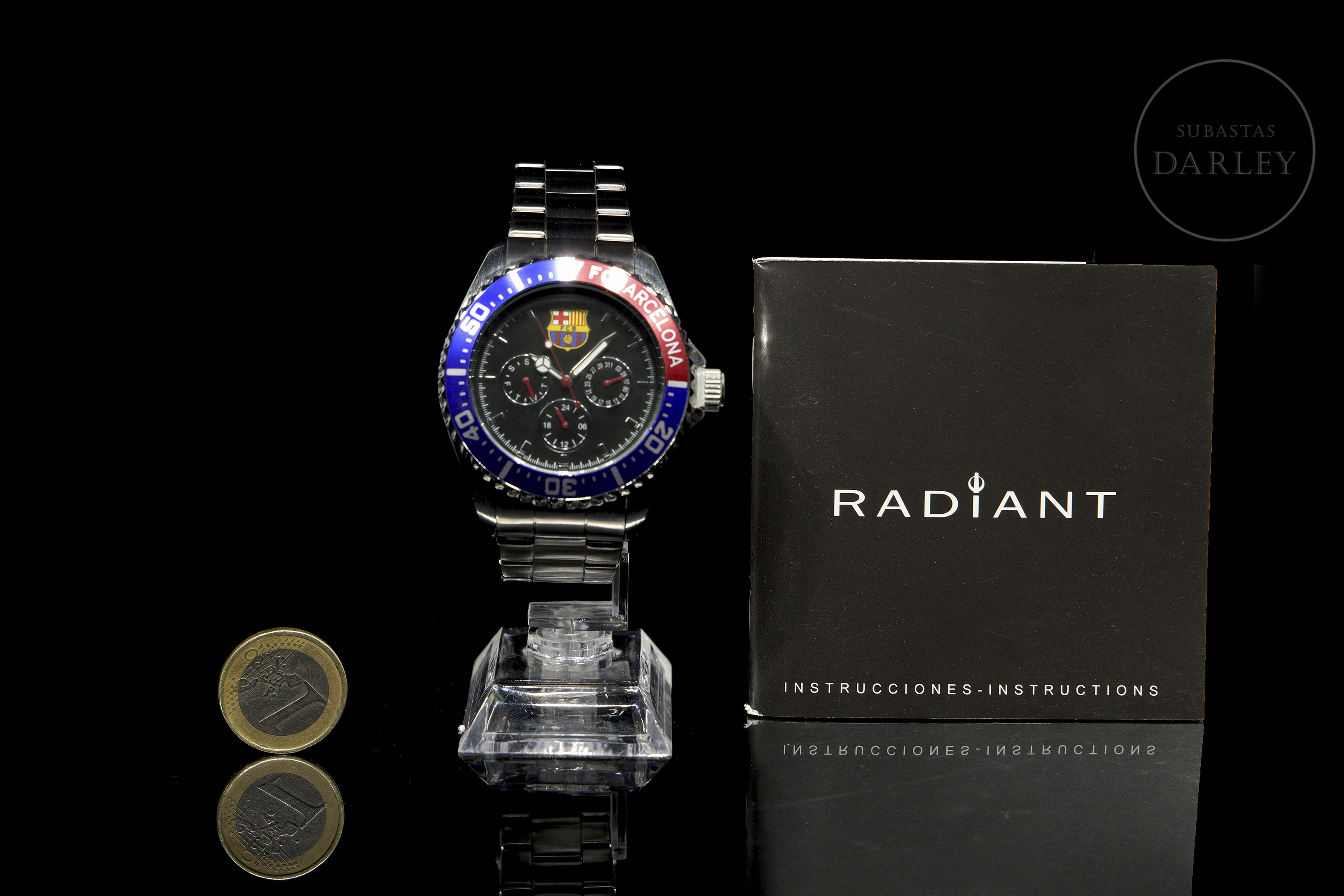 Radiant F.c. Barcelona watch. Steel watch with quartz movement. Black dial with club shield, with triple calendar on three dials. Time of day, day of the week and day of the month.