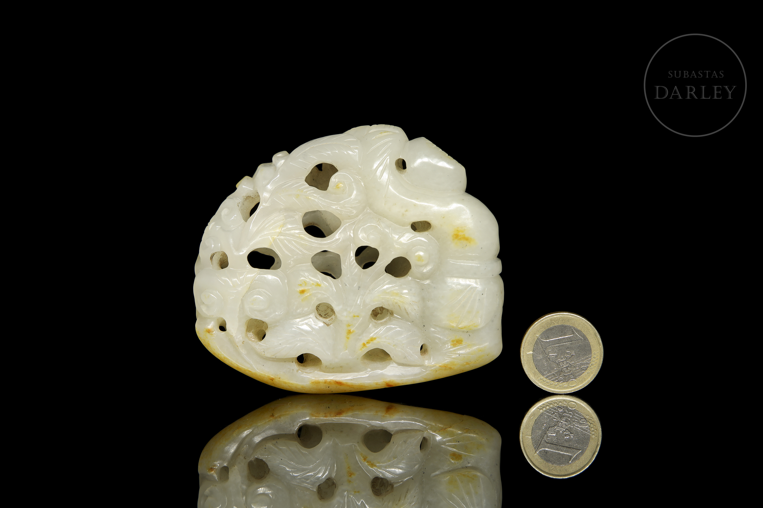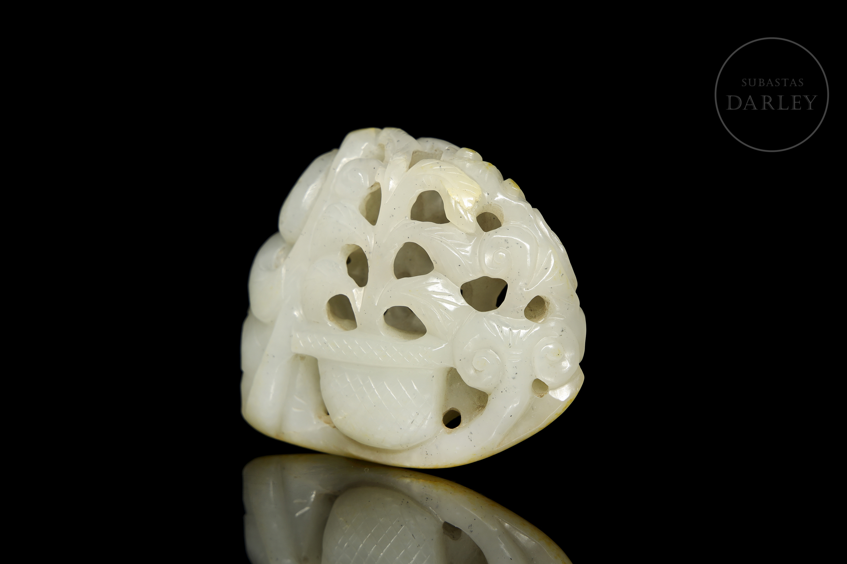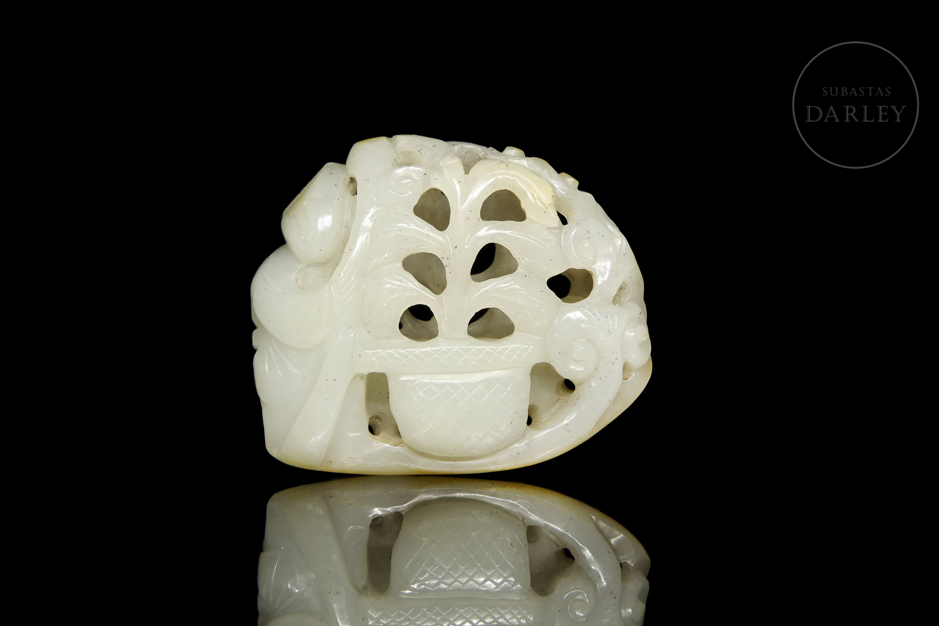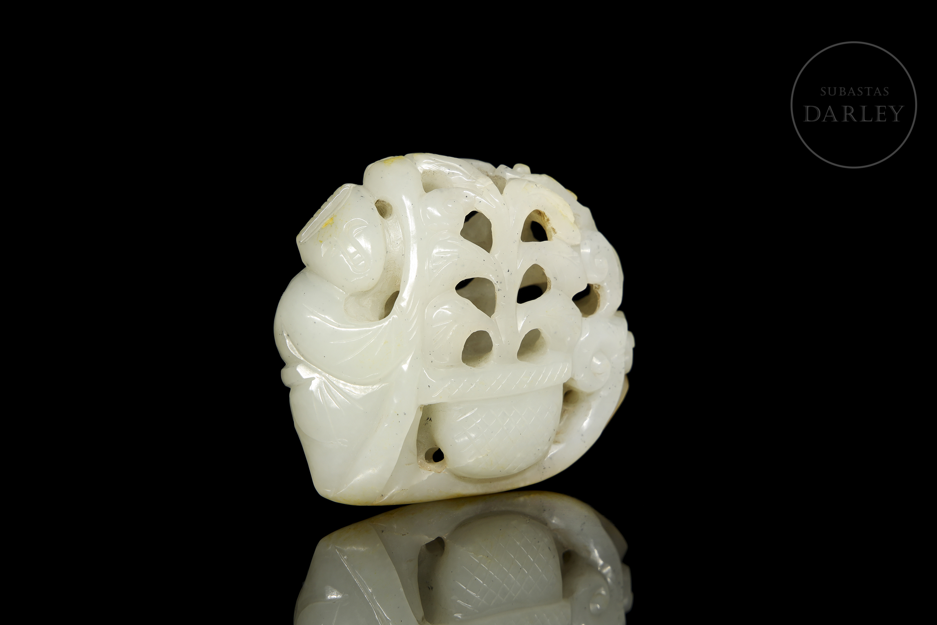 Figure carved in ivory-toned white jade, representing a character holding a large pot with foliage. The latticework, with multiple cut-outs, gives the piece a dynamic feel. The jade has natural veins and light patinas of surface oxidation. Qing Dynasty (1644–1912).