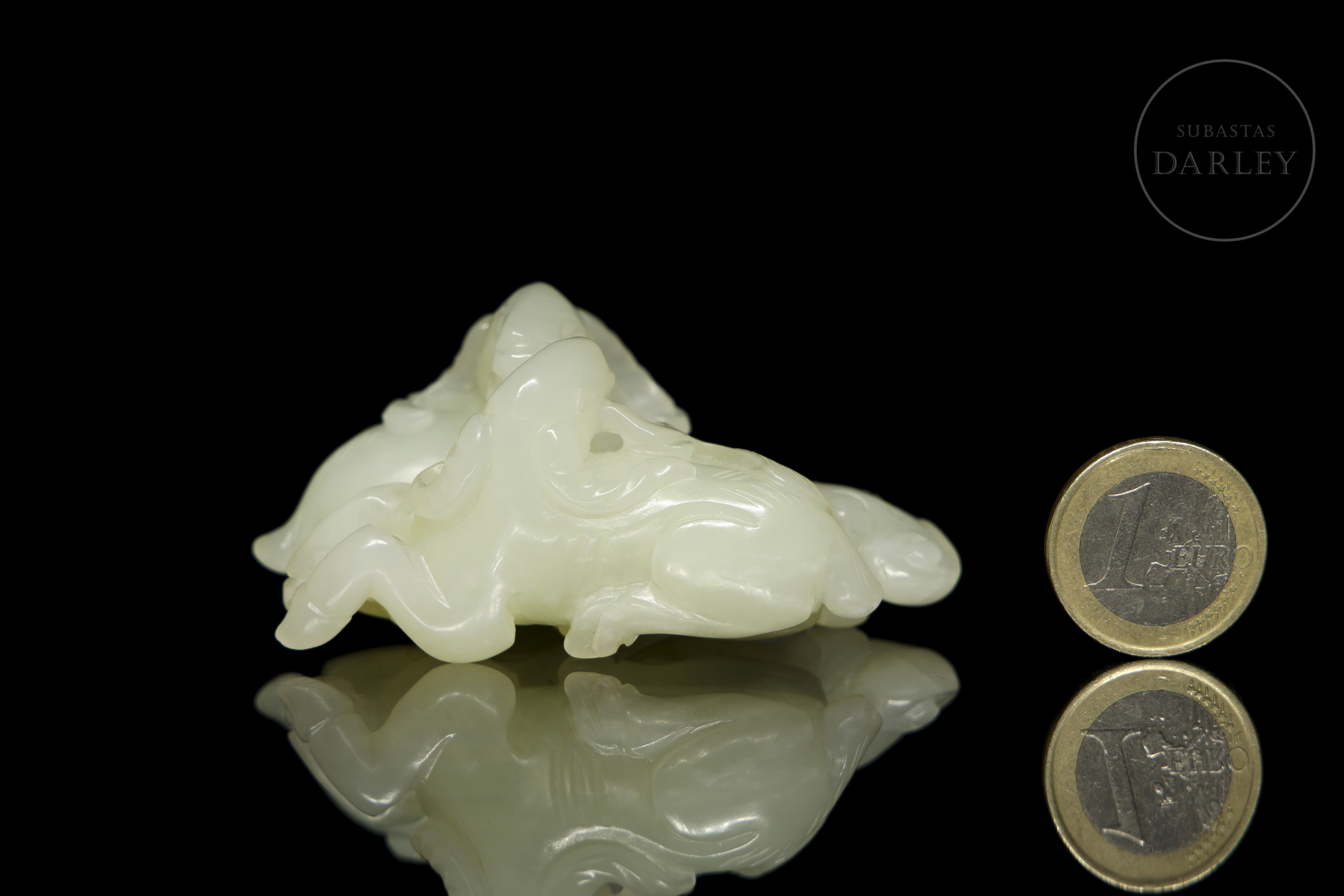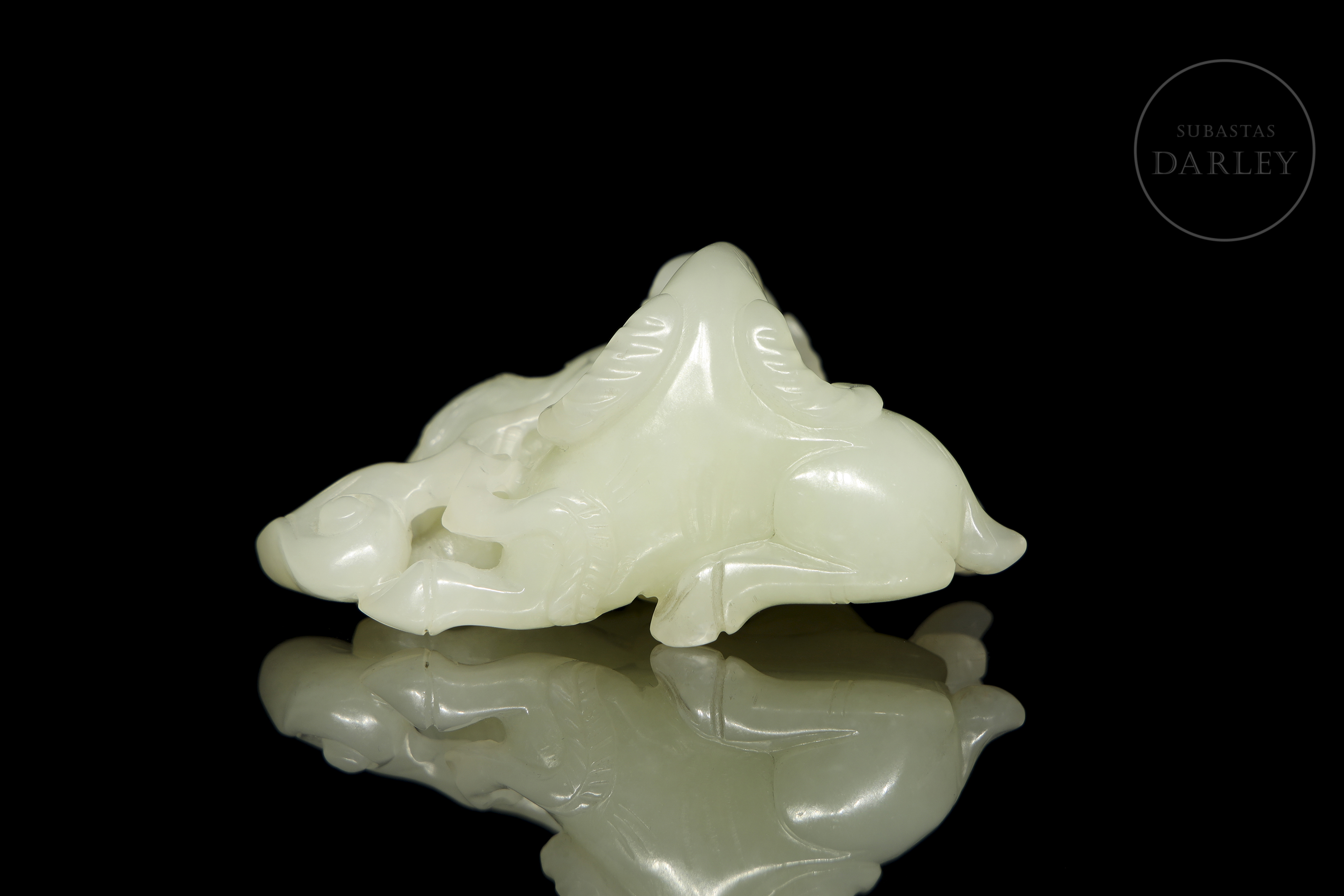 Finely carved white jade with light natural veins, depicting two rams in a relaxed pose, with their legs tucked under their bodies, heads together and imposing horns. This representation is a traditional symbol of harmony and prosperity. Qing Dynasty (1644–1912).